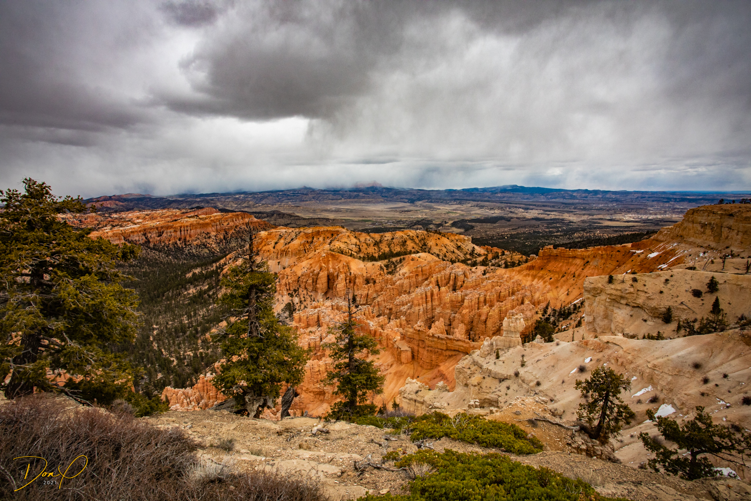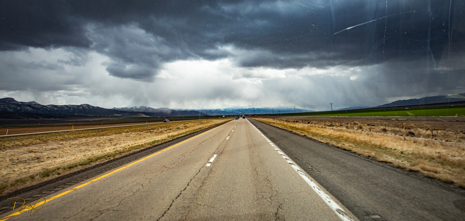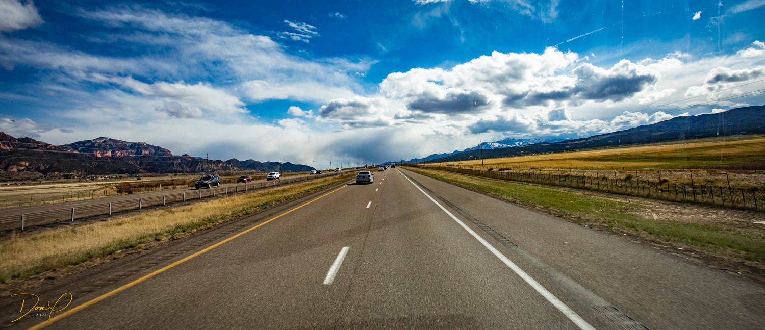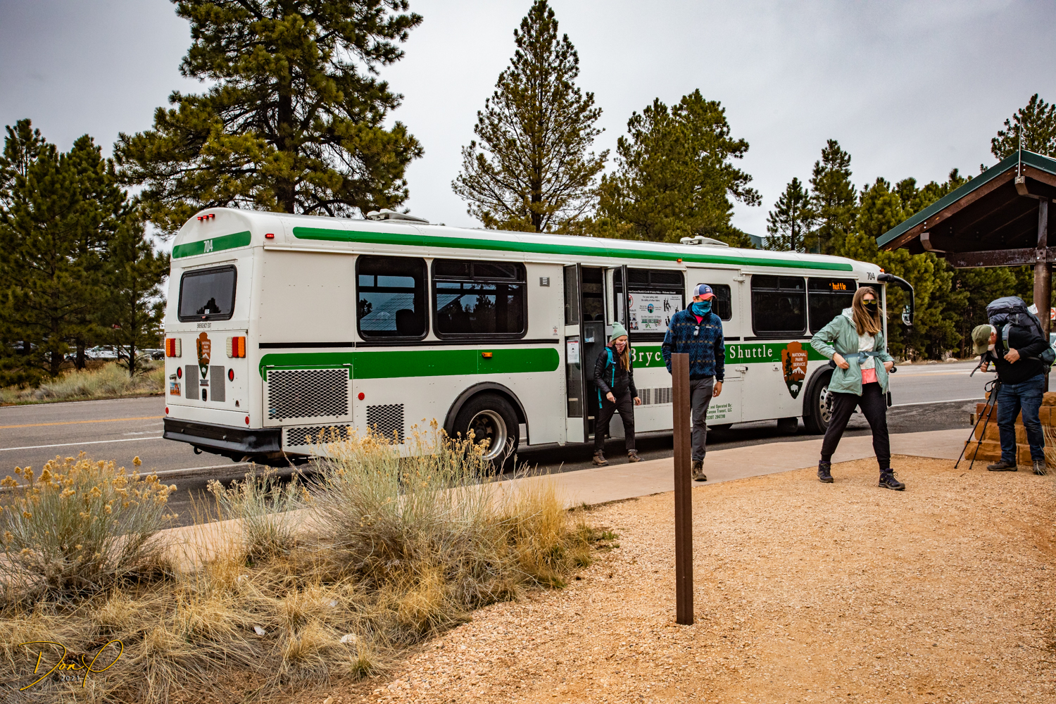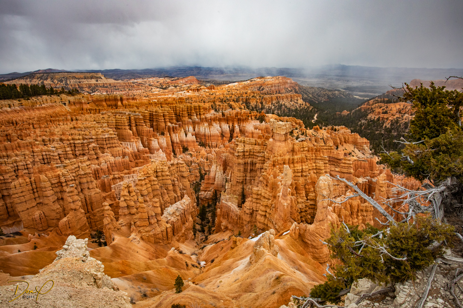 We decide we need to move along, so we get on the next Shuttle and ride it back to the Visitor Center where The Beast is parked. As we prepare to drive out a snowstorm begins and we watch the spectacle as the swirling snowflakes increase in volume. We drive away, windshield wipers pushing the snow aside. As we leave the Park the road goes downhill and the snow stops.