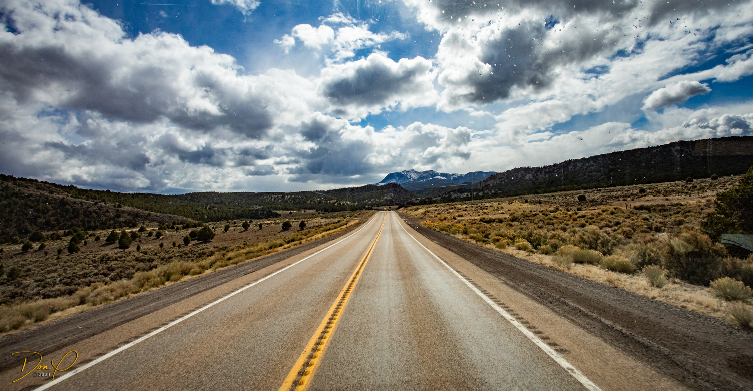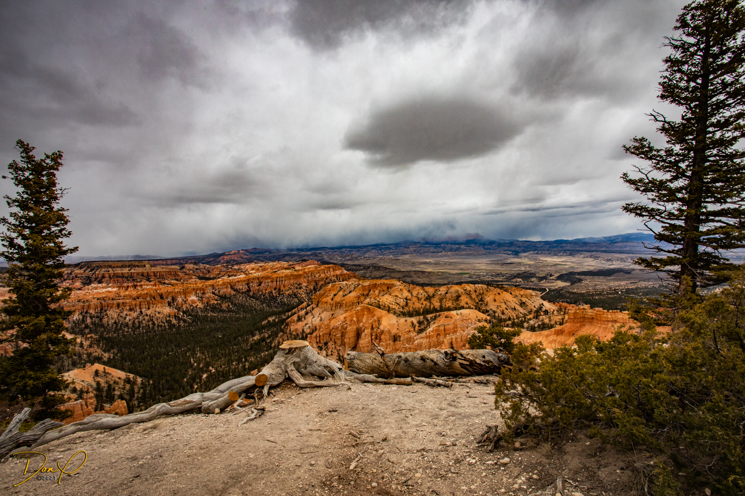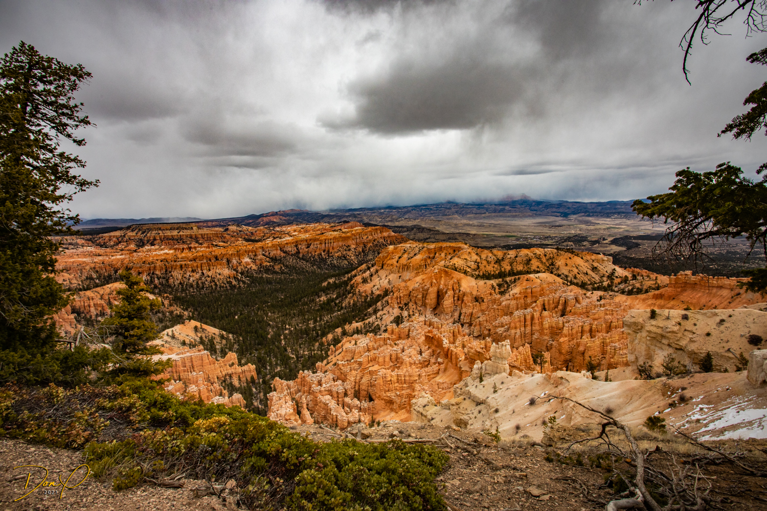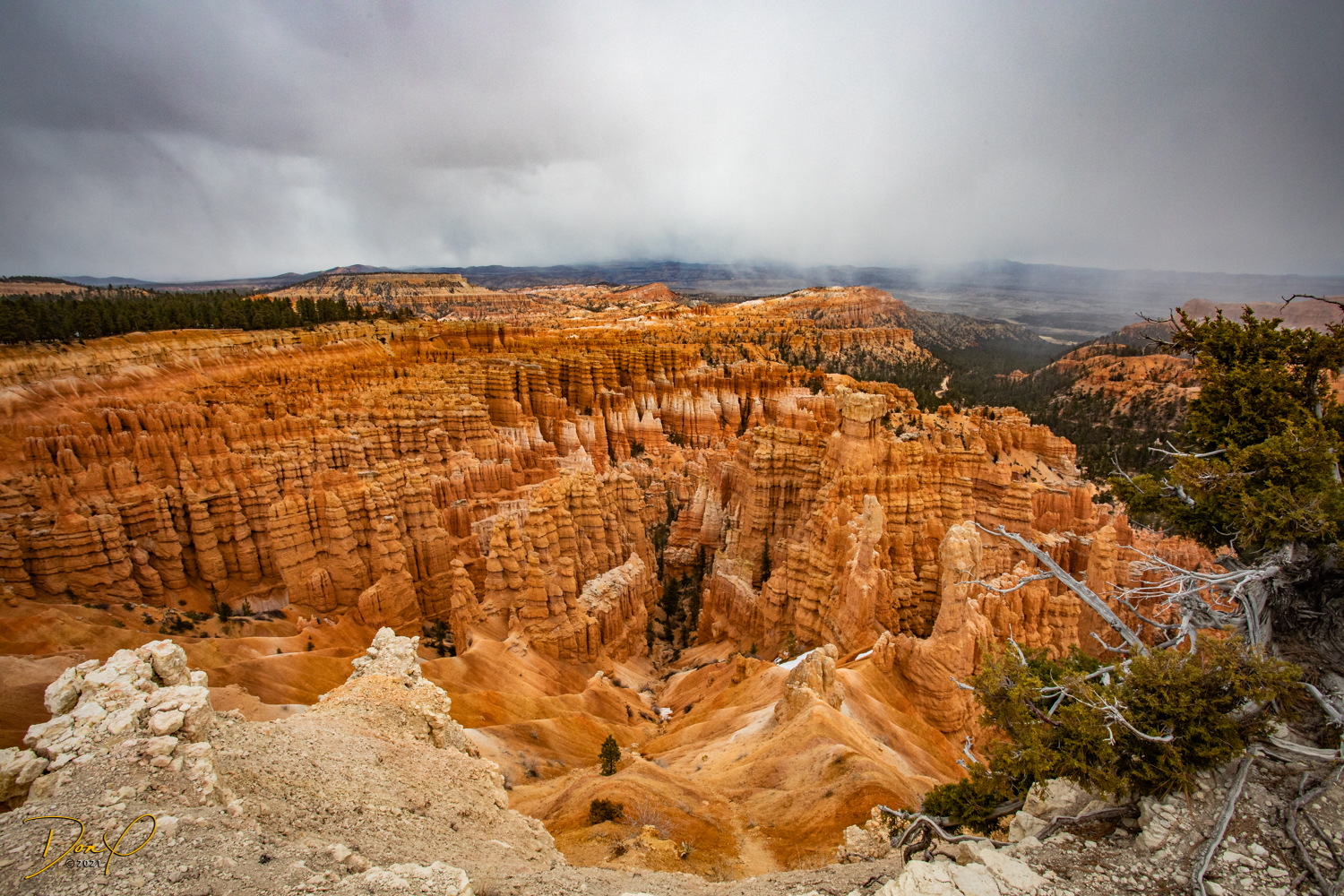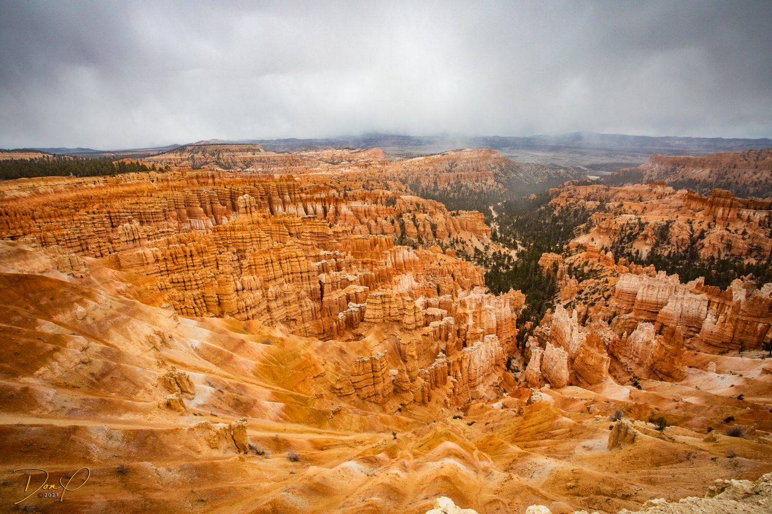 We decide we need to move along, so we get on the next Shuttle and ride it back to the Visitor Center where The Beast is parked. As we prepare to drive out a snowstorm begins and we watch the spectacle as the swirling snowflakes increase in volume. We drive away, windshield wipers pushing the snow aside. As we leave the Park the road goes downhill and the snow stops.