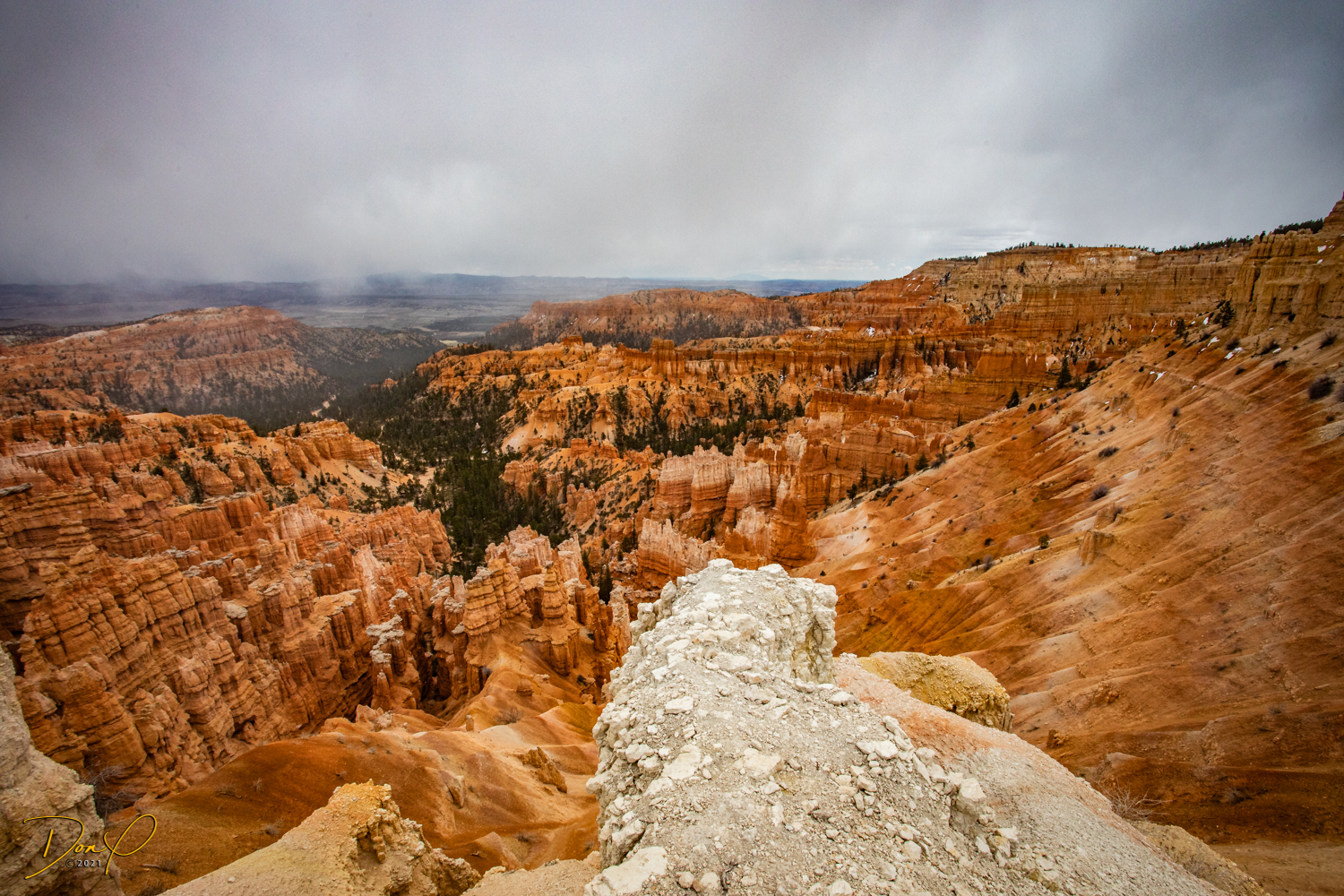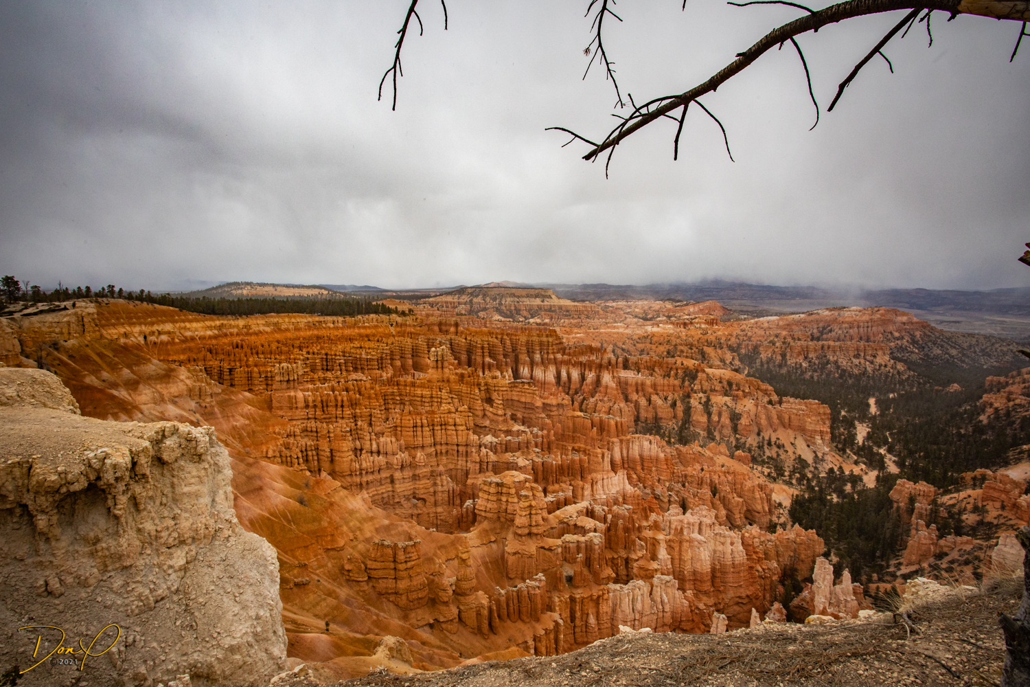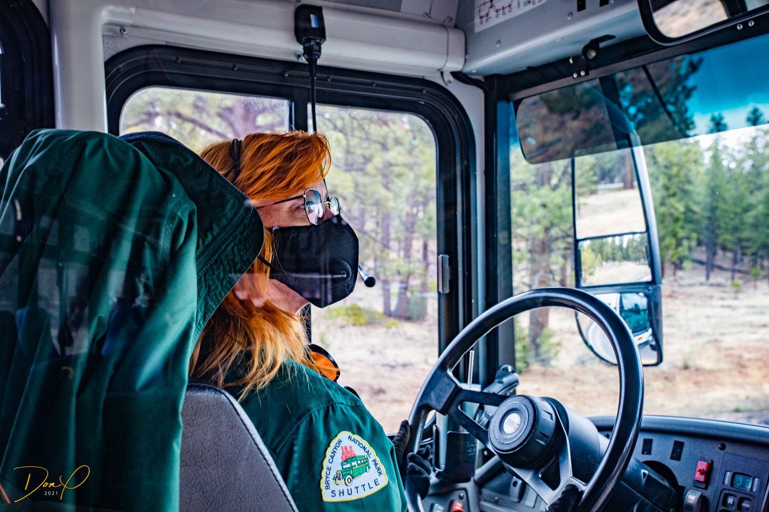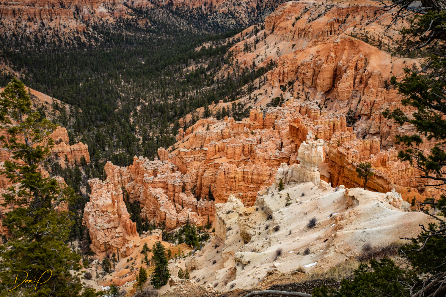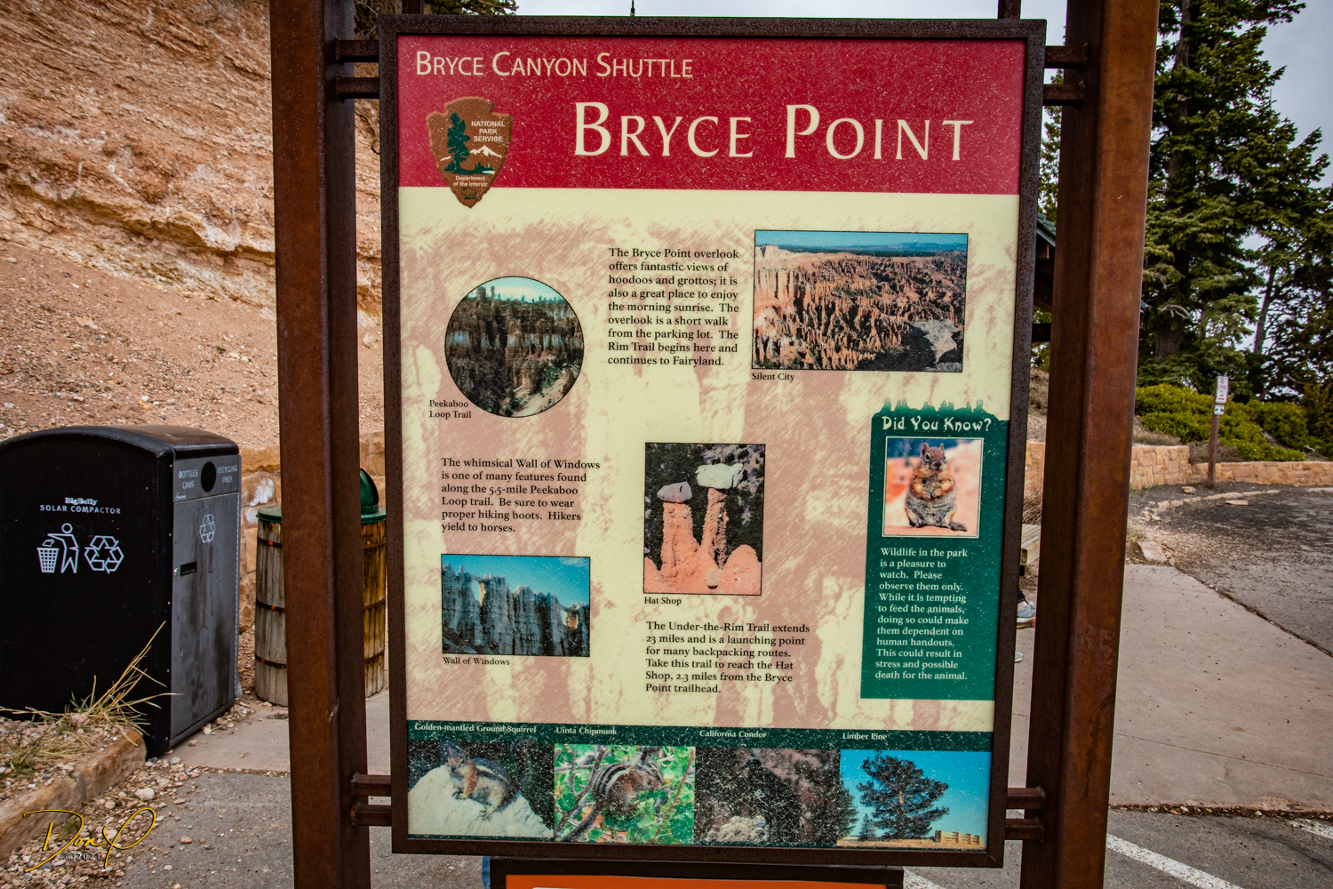 But now it is hike or take the Shuttle. The Shuttle wins. It is free and takes you around to all the viewing sites! They run every 10-15 minutes like clockwork. We get out at the farthest site, Bryce Point, that we are taken to first and we get off and walk around and thrill our cameras with activity! We wanted to hike the Rim Trail back to the next site, but this section is closed due to snow and ice, even though it is still April.