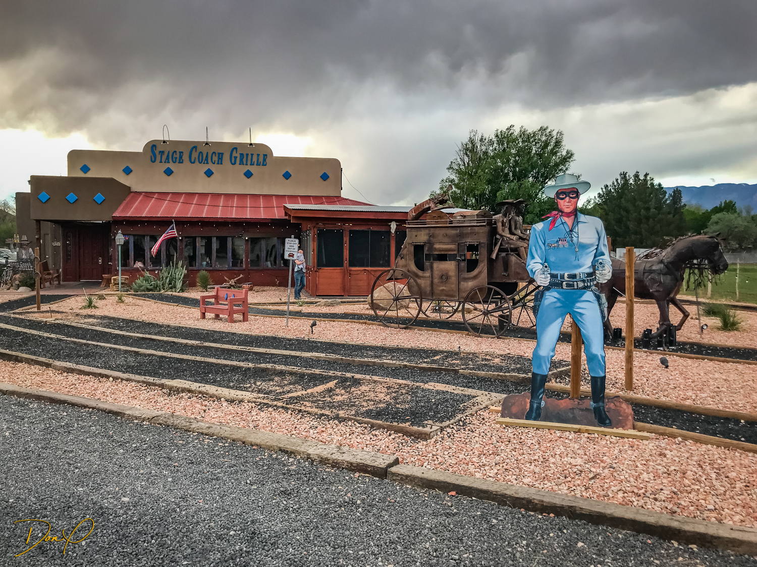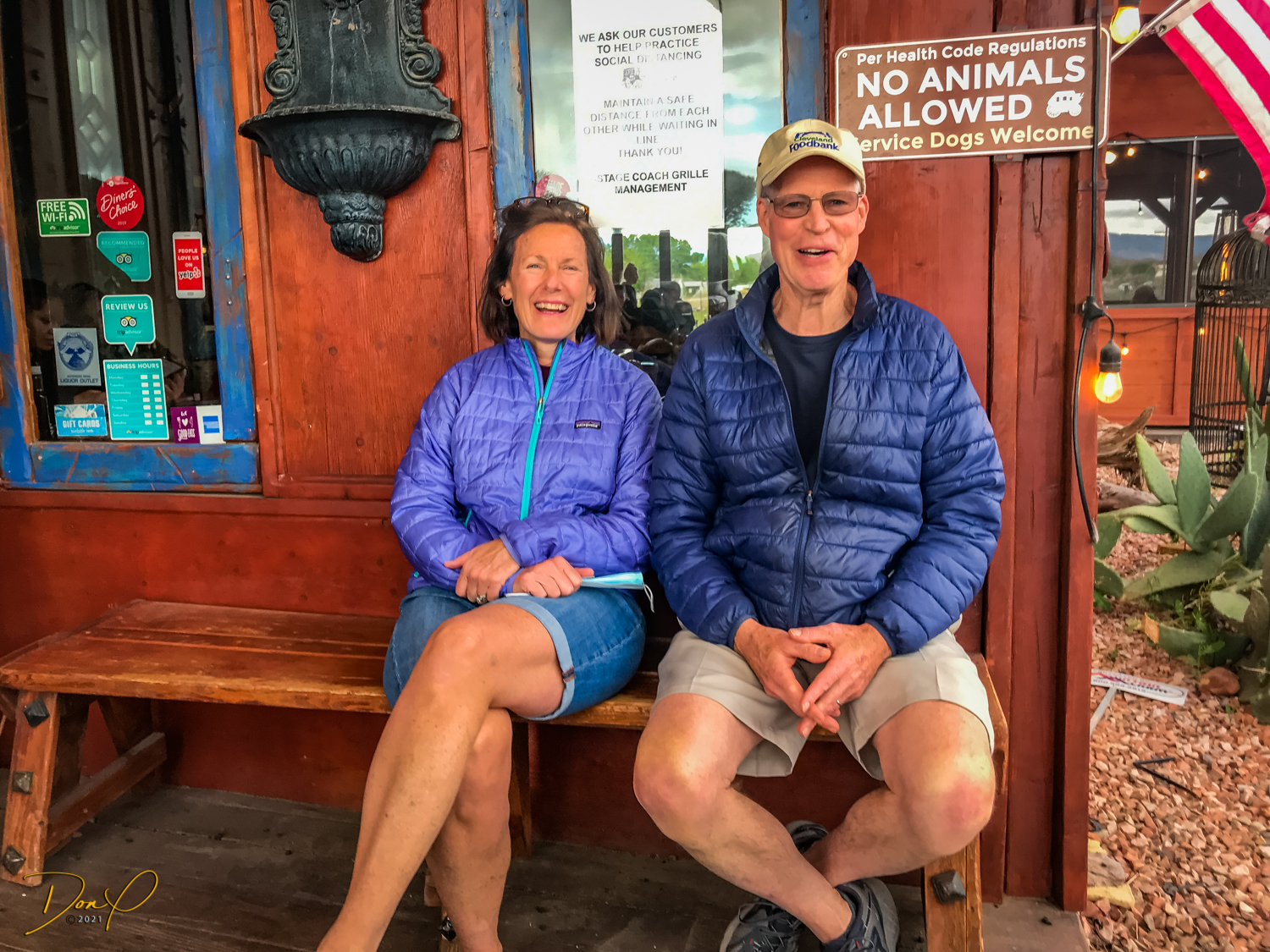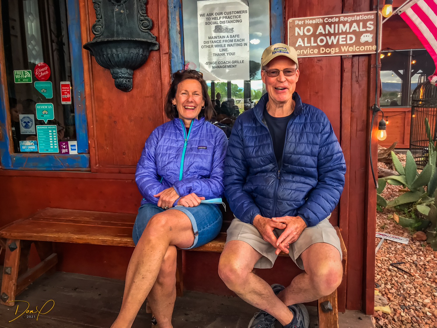 We find the “Stage Coach Grill” and are informed it it a 2 hour wait for a table. So we put our names in and sit outside in the cool air to wait. We chat amicably with a couple from Cleveland, Ohio, that has the same dilemma that we do and we get along great! Someone has a great idea and the gentleman we are chatting with goes inside. He comes out with great news that if we share a table and eat together, the wait won’t even be an hour! It is chilly and we invite them to come to our RV and visit while we wait. We no sooner get in the RV and pop out the side and begin to visit and we get the call that our table is ready! So we all go in the restaurant and continue our visit over dinner. Are we worried about Covid, you may ask? Not at all! Elee and I are long since vaccinated and so is the other couple. We spend a very fun evening making new friends!