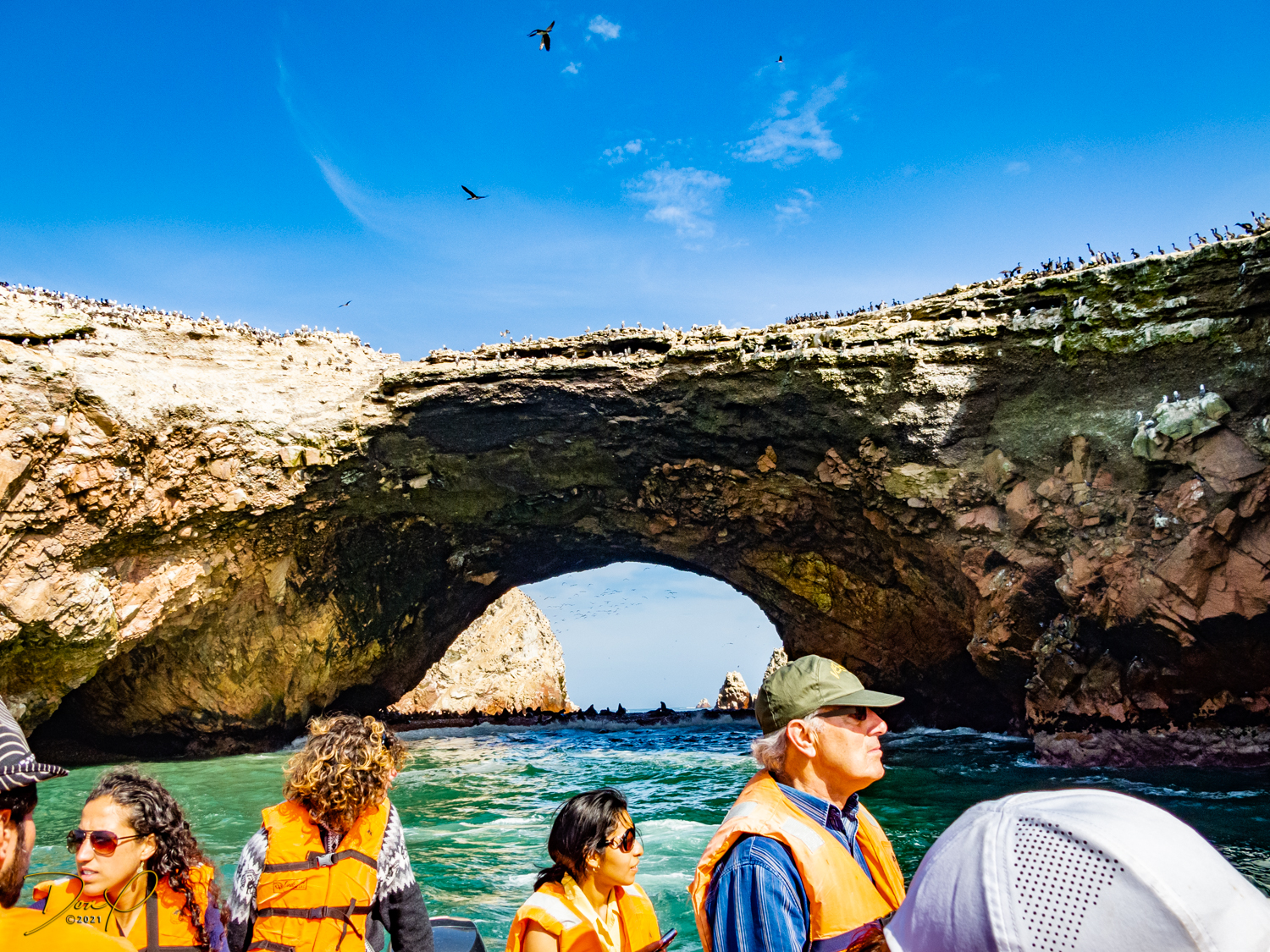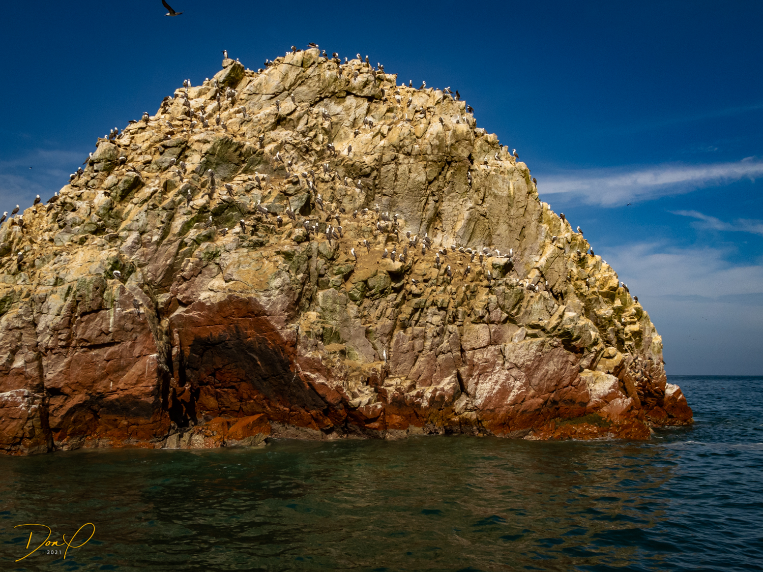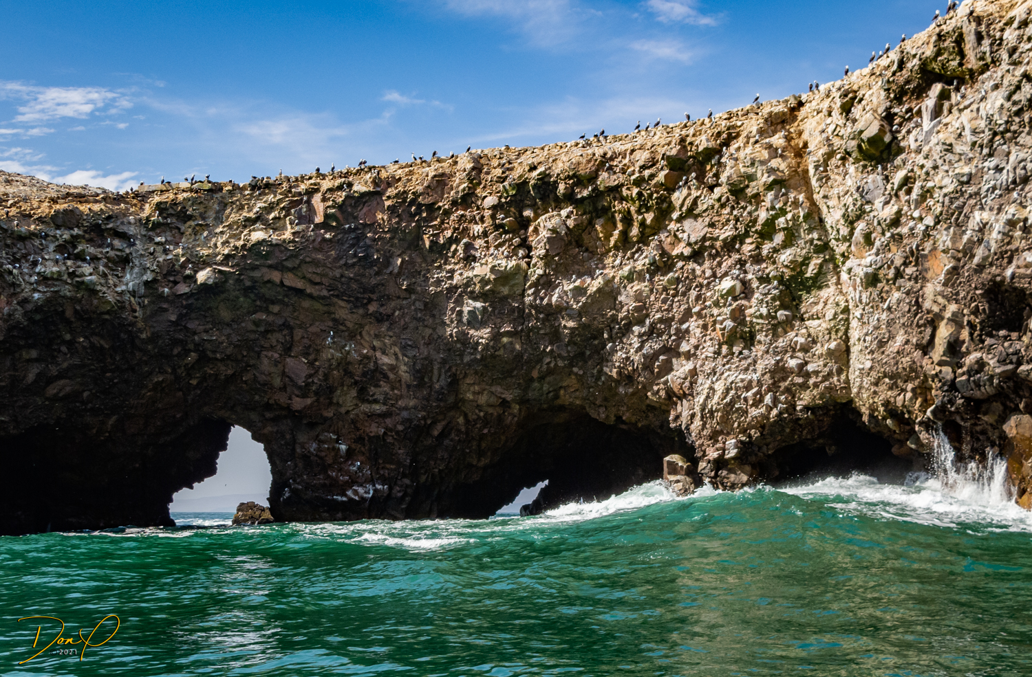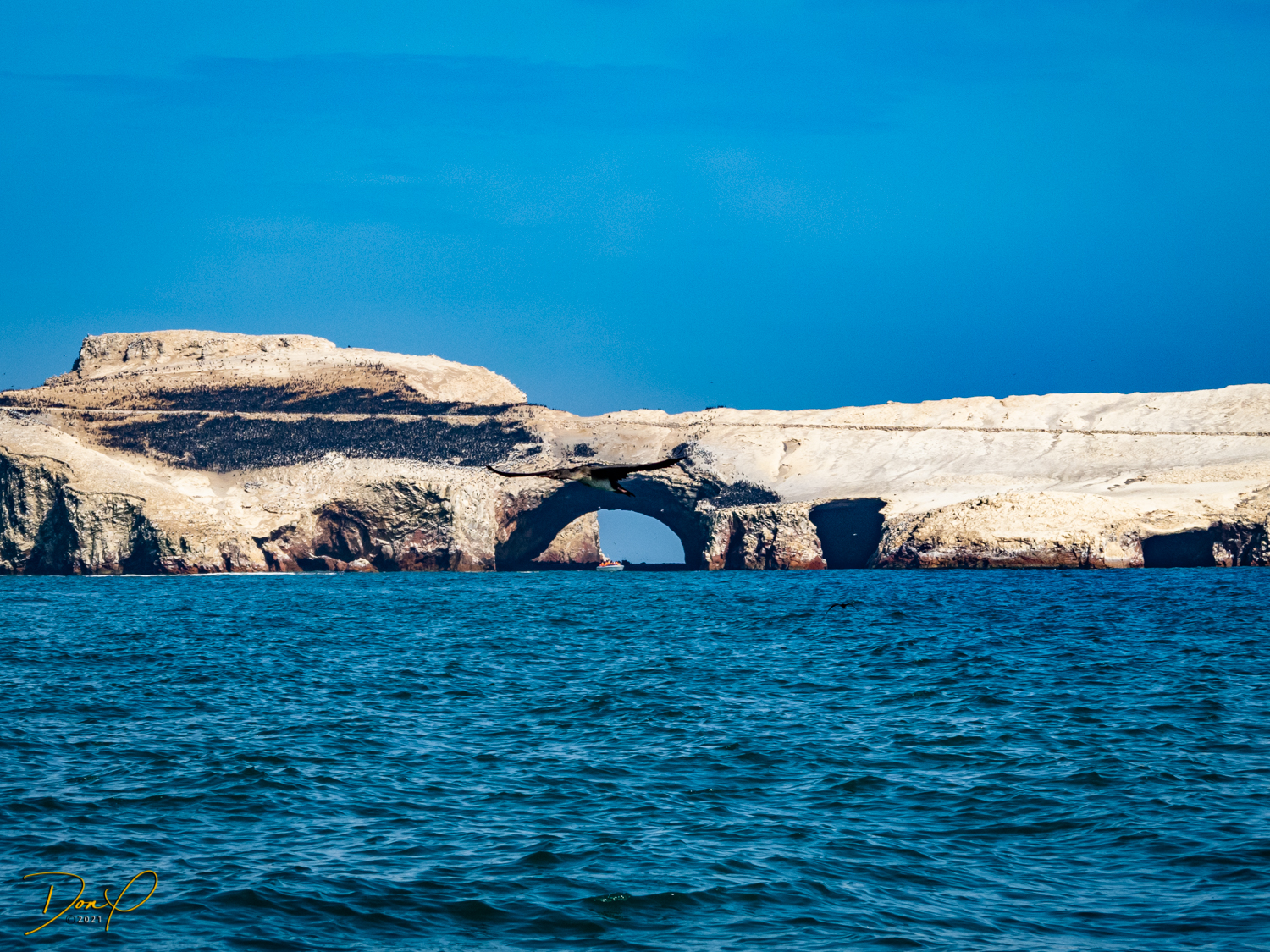 As we continue out to sea, we get glimpses of flocks of migrating birds, even a Yellow Albatross. We arrive at the Ballestas Islands and enjoy sights of many sea caves and tunnels and the islands are topped with flocks of Cormorants, Albatross and many other birds.
