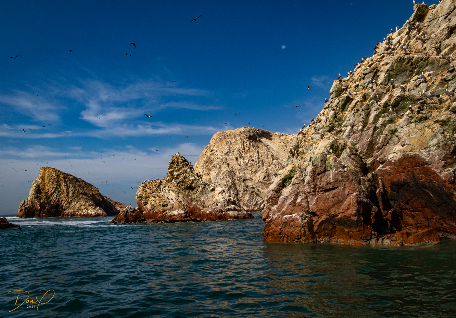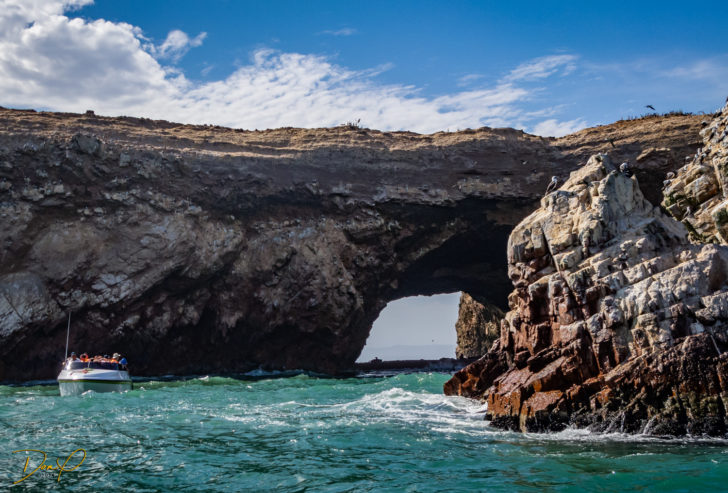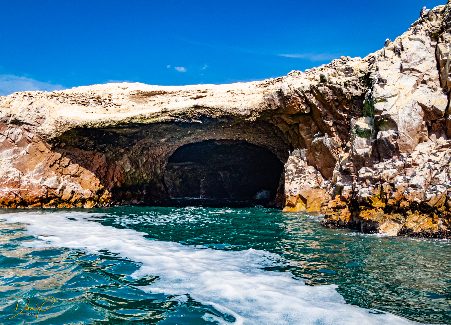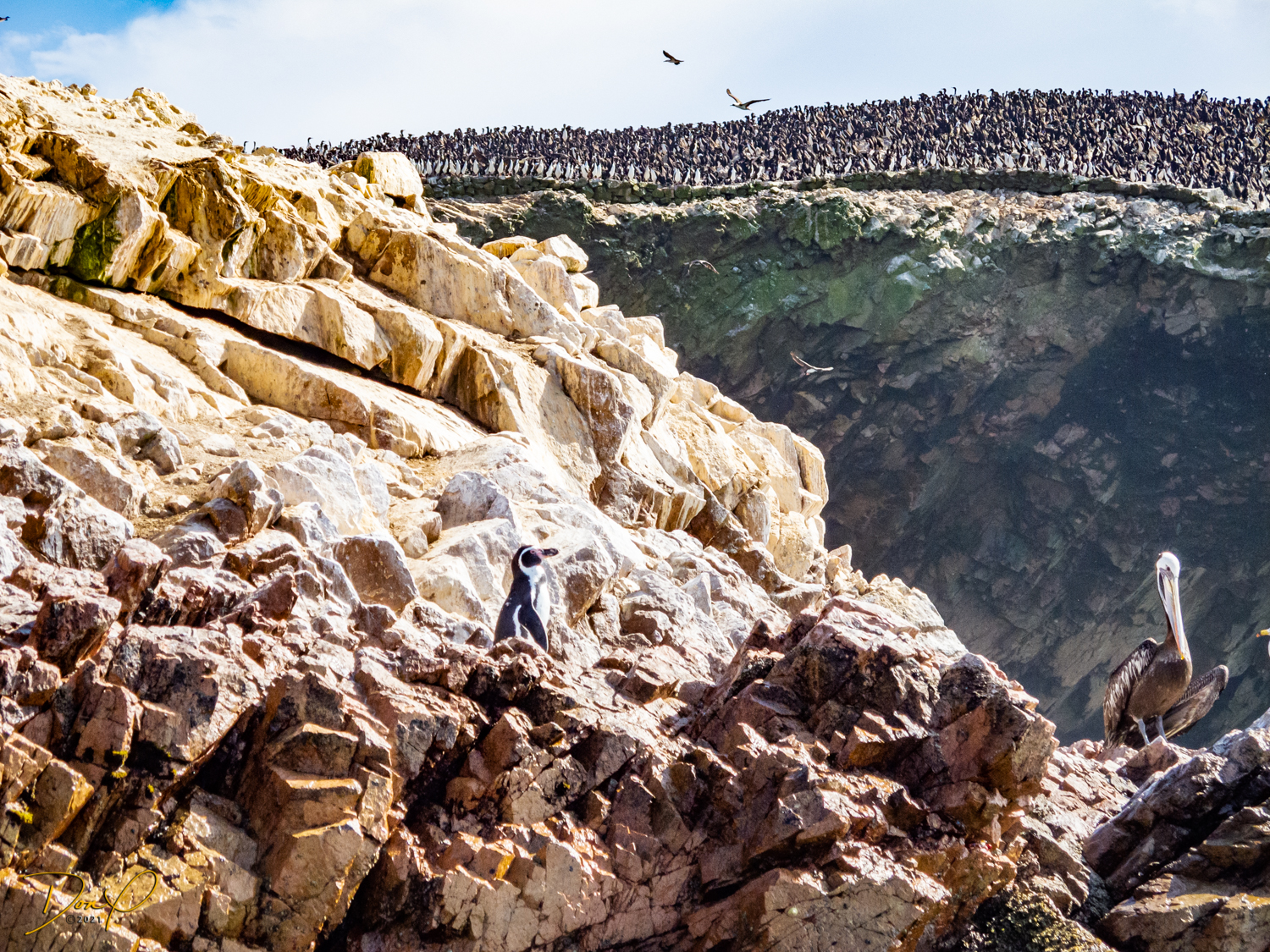 As we continue out to sea, we get glimpses of flocks of migrating birds, even a Yellow Albatross. We arrive at the Ballestas Islands and enjoy sights of many sea caves and tunnels and the islands are topped with flocks of Cormorants, Albatross and many other birds.