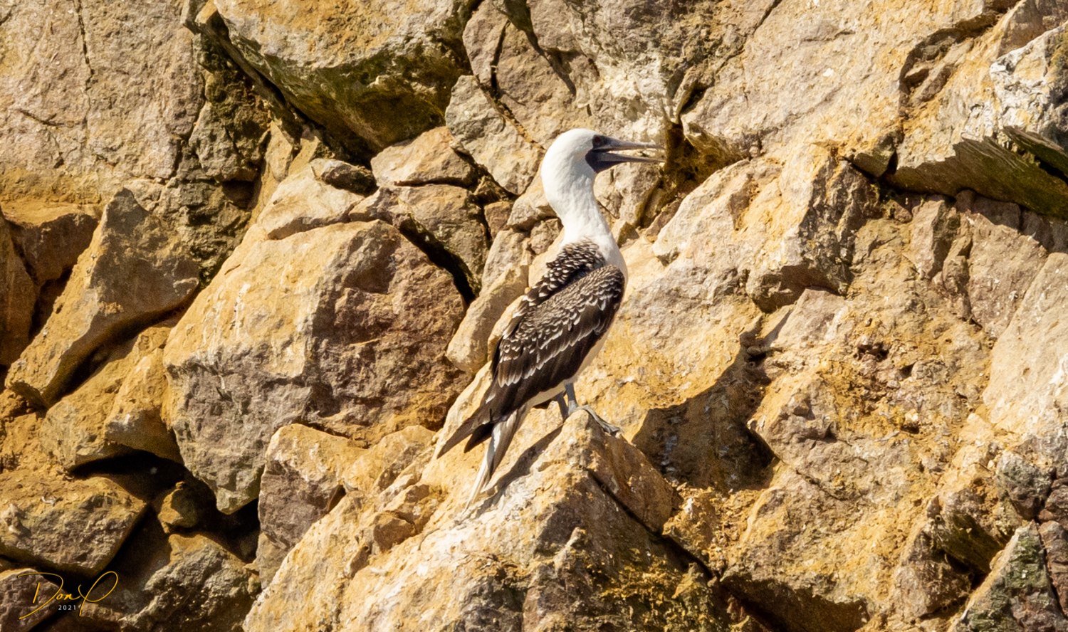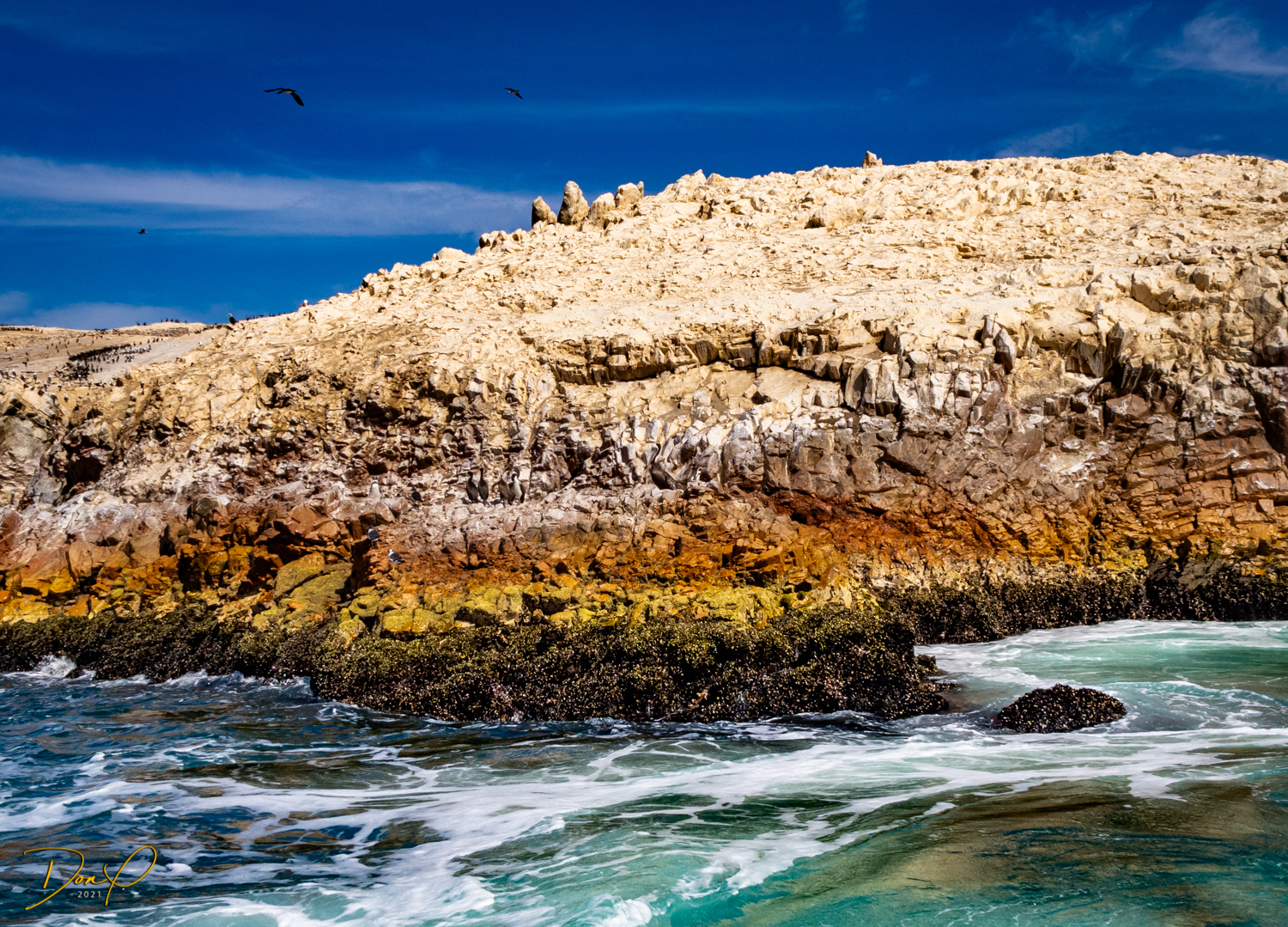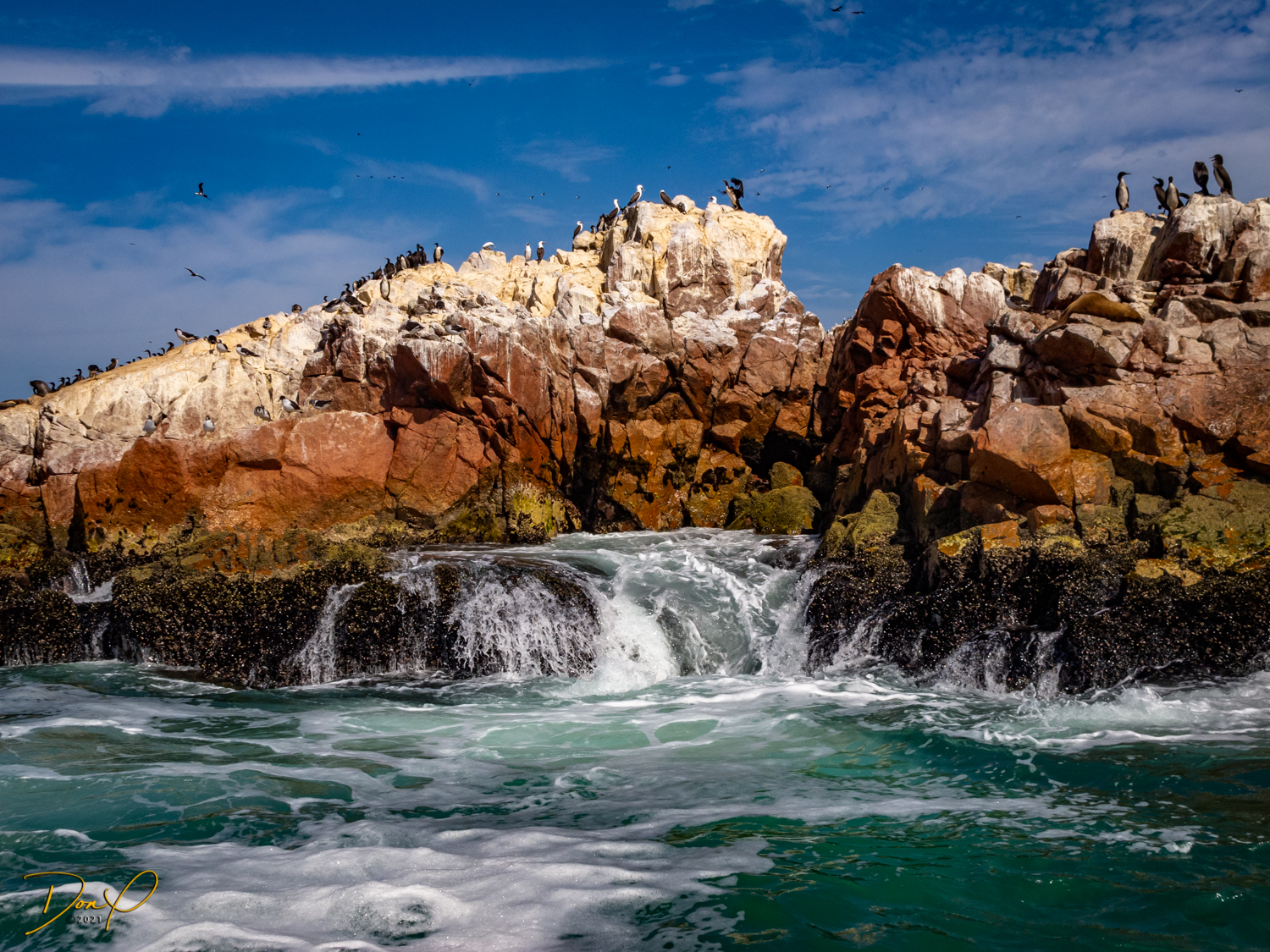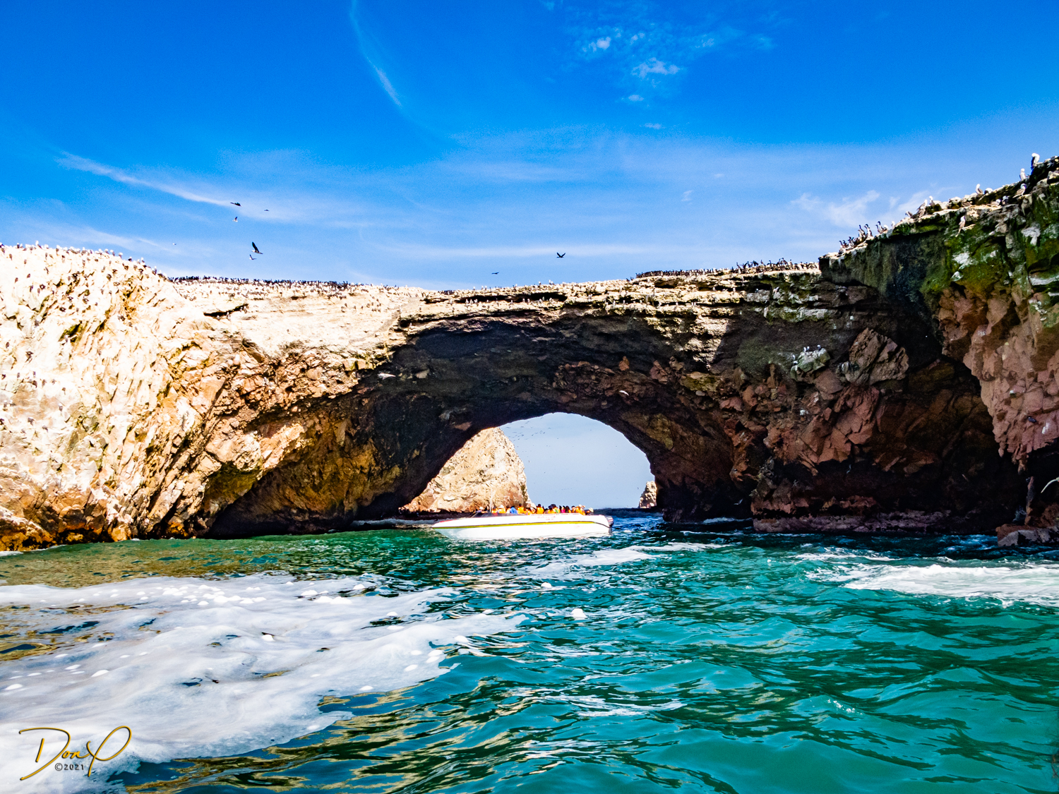 As we continue out to sea, we get glimpses of flocks of migrating birds, even a Yellow Albatross. We arrive at the Ballestas Islands and enjoy sights of many sea caves and tunnels and the islands are topped with flocks of Cormorants, Albatross and many other birds.