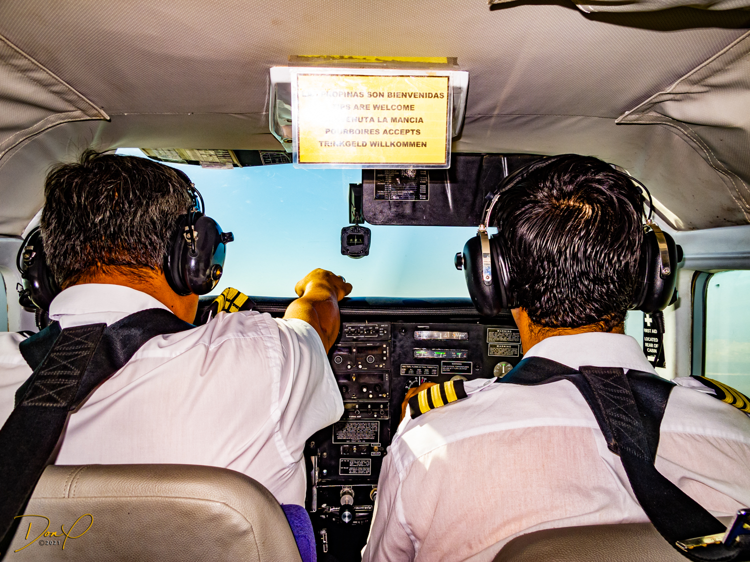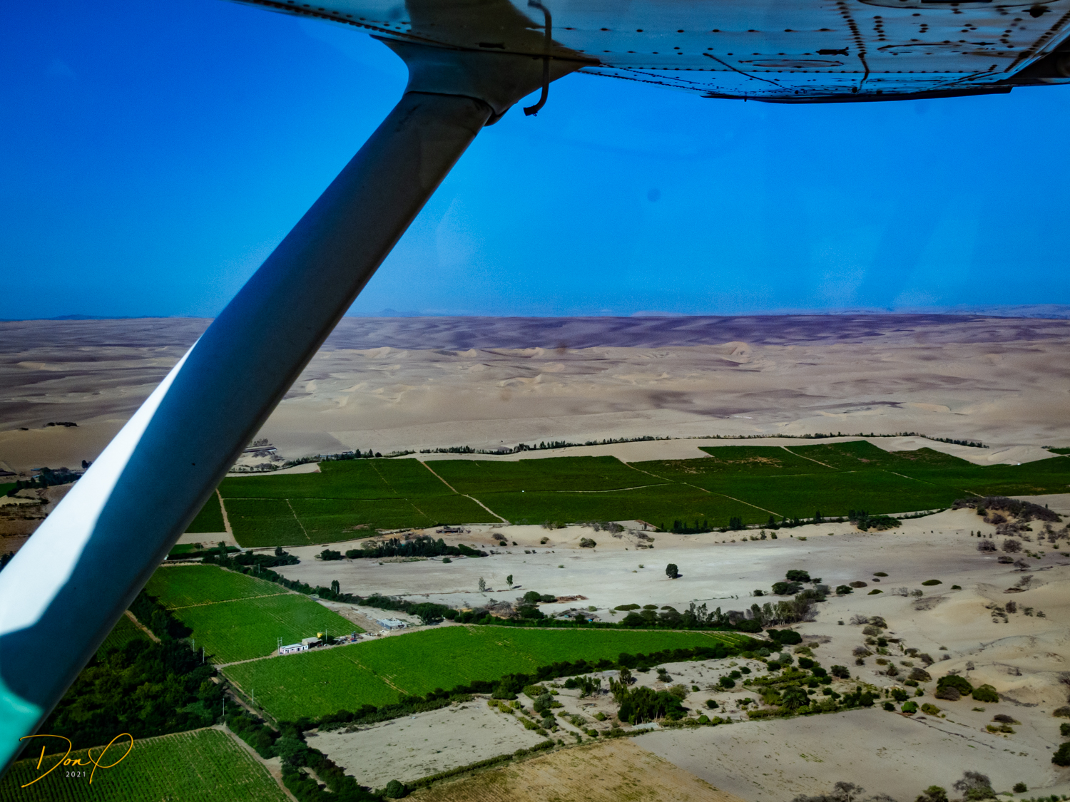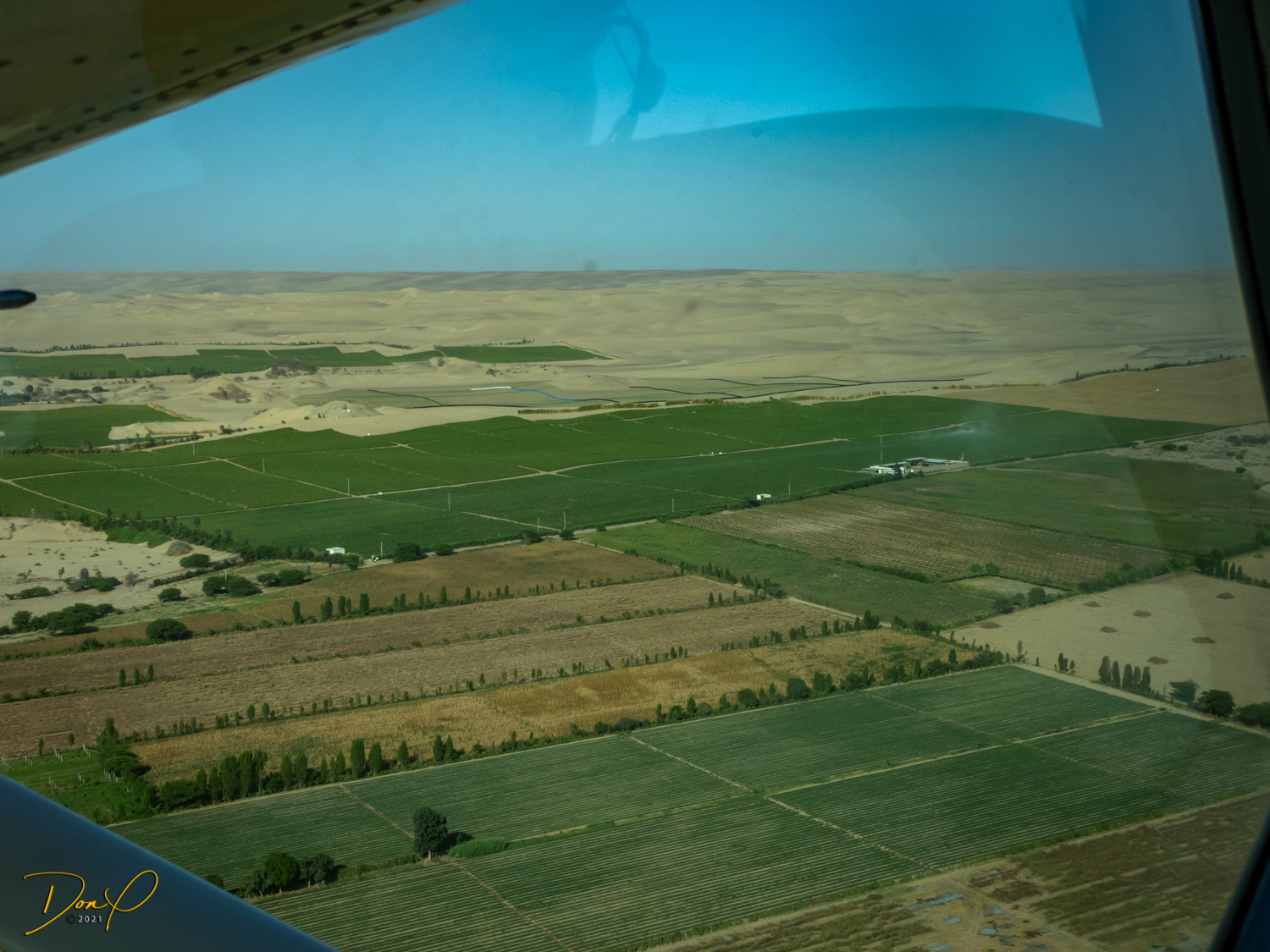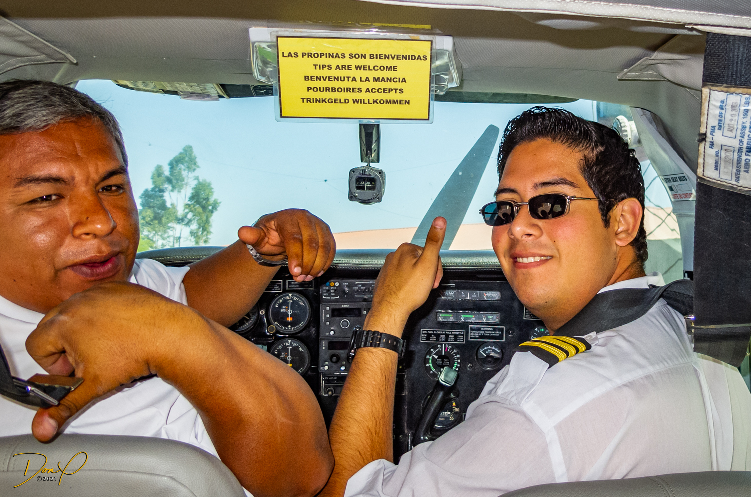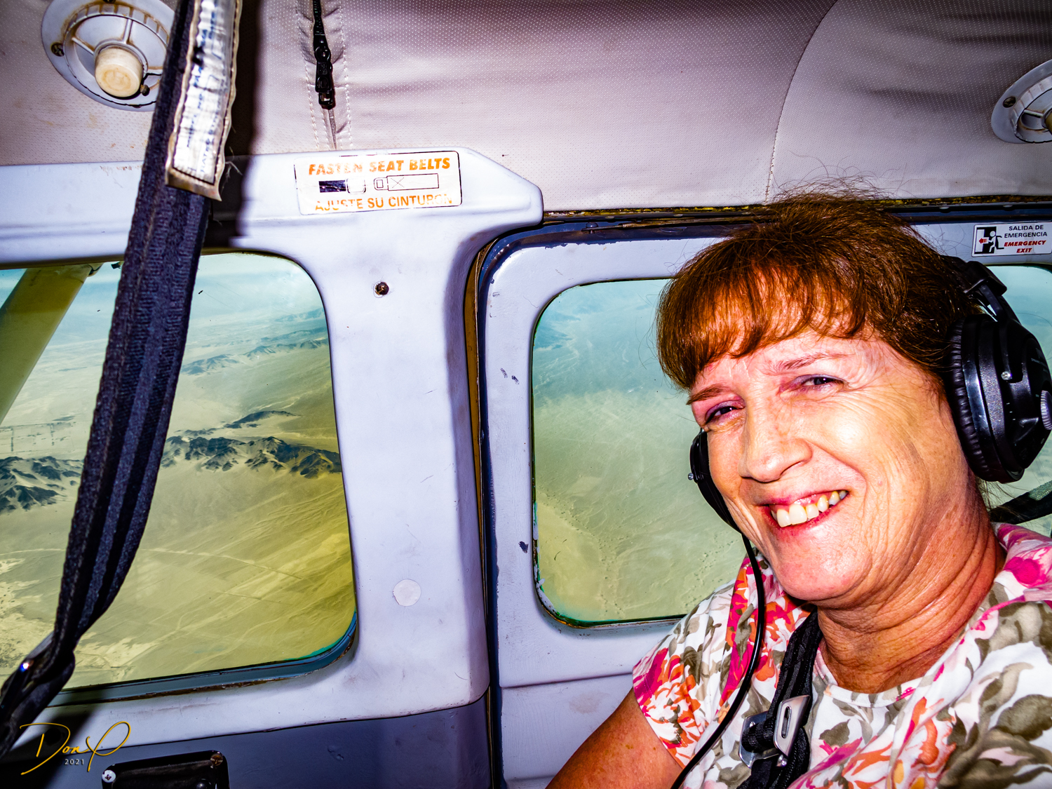 Our taxi this morning takes us to the Ica Airport (pronounced Eeek-a) for a flight over the Nazca Lines. You can also fly out of Nazca Airport, but when we checked before we started this trip, we found government warnings about higher crime in Nazca. So we chose to fly out of Ica instead. We get there and check in for our flight. There are two other passengers waiting also, and luckily, they give us the two seats right behind the pilots. They are personable and speak decent English and the flight begins.