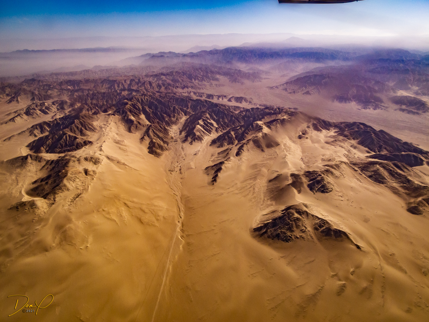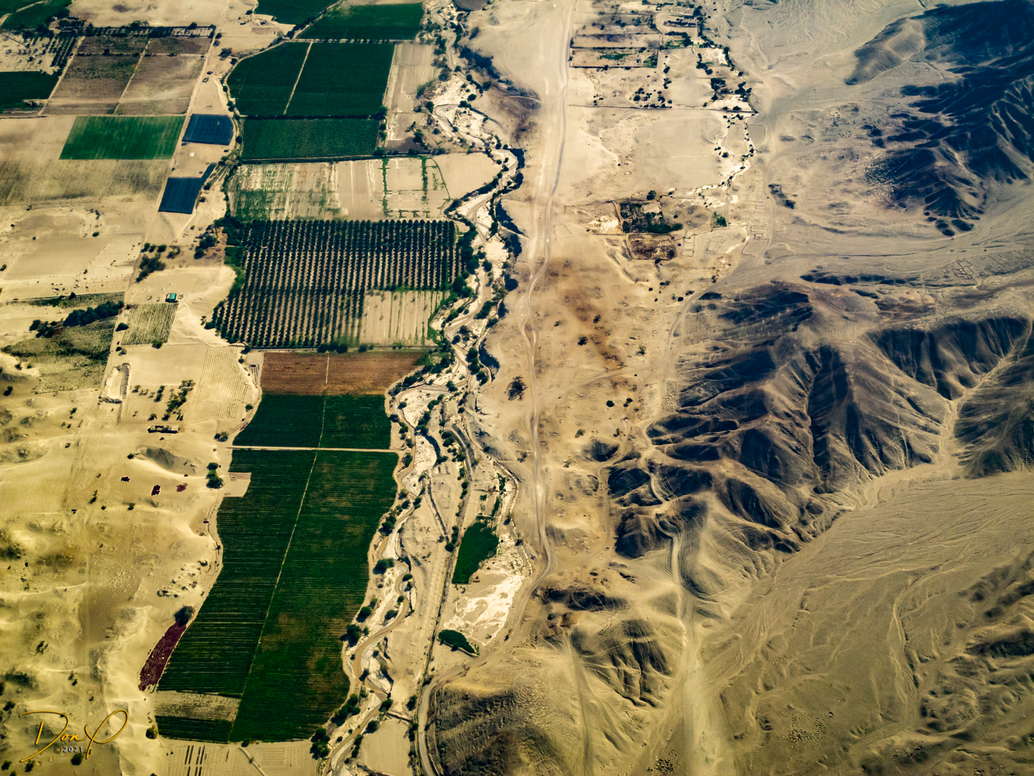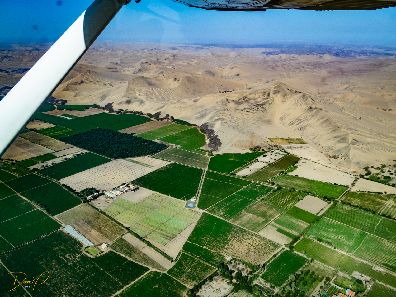 We first fly over lush green farms that are obviously irrigated. We learned from our hotel concierge that it never rains here. The hotel lobby was open to the sky and I asked what they do when it rains. The concierge chuckled and informed me that the last time it rained was in 1955 and they got a whopping one tenth of an inch! We do fly over what appears to be a resort that is an oasis in the desert for real. Can you spot it? The rest of the desert has only been eroded by the wind!