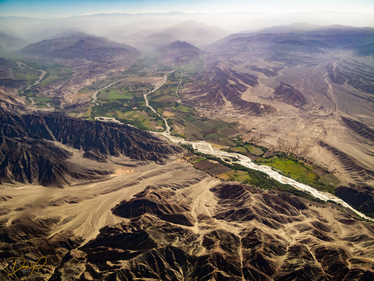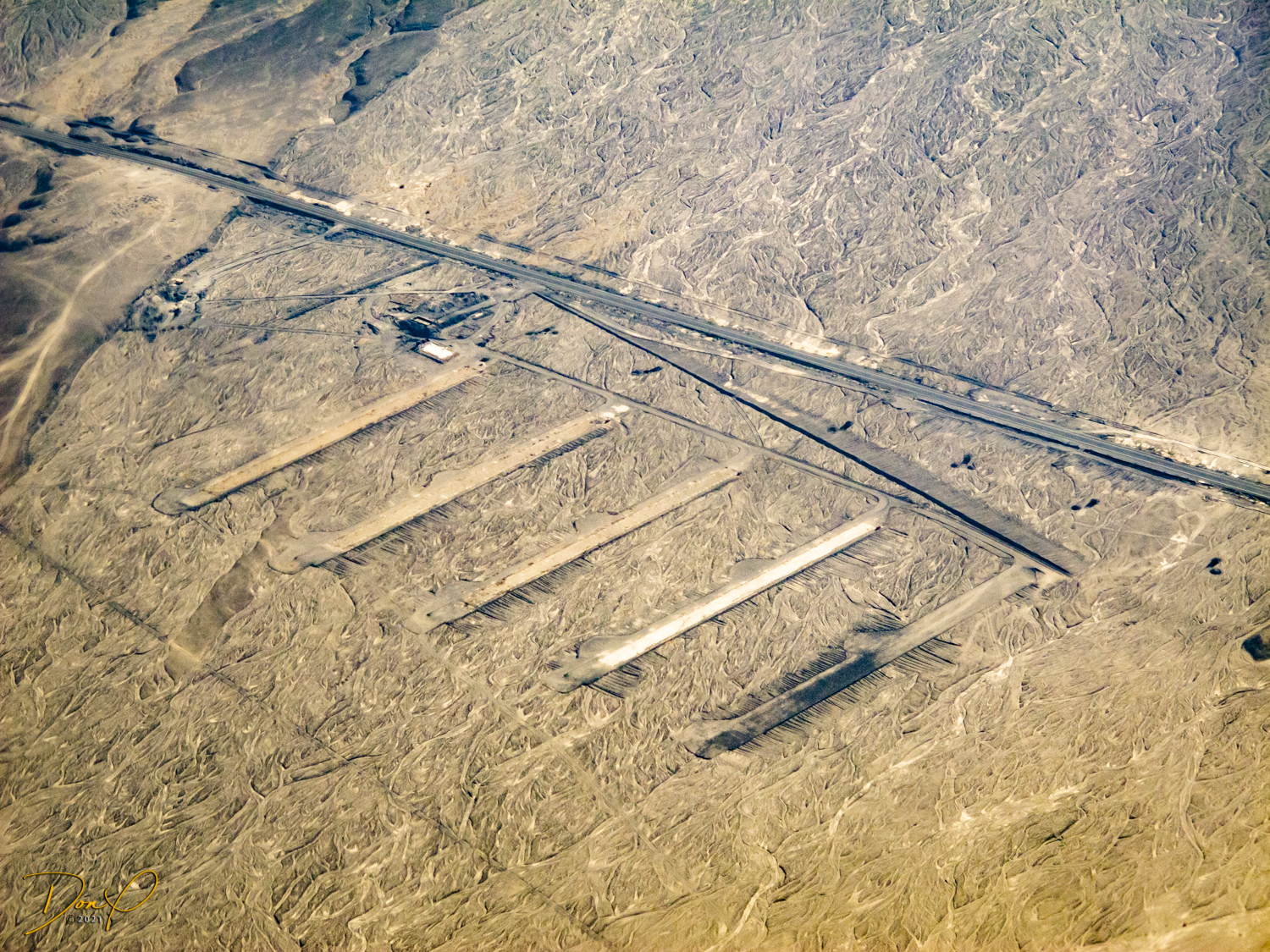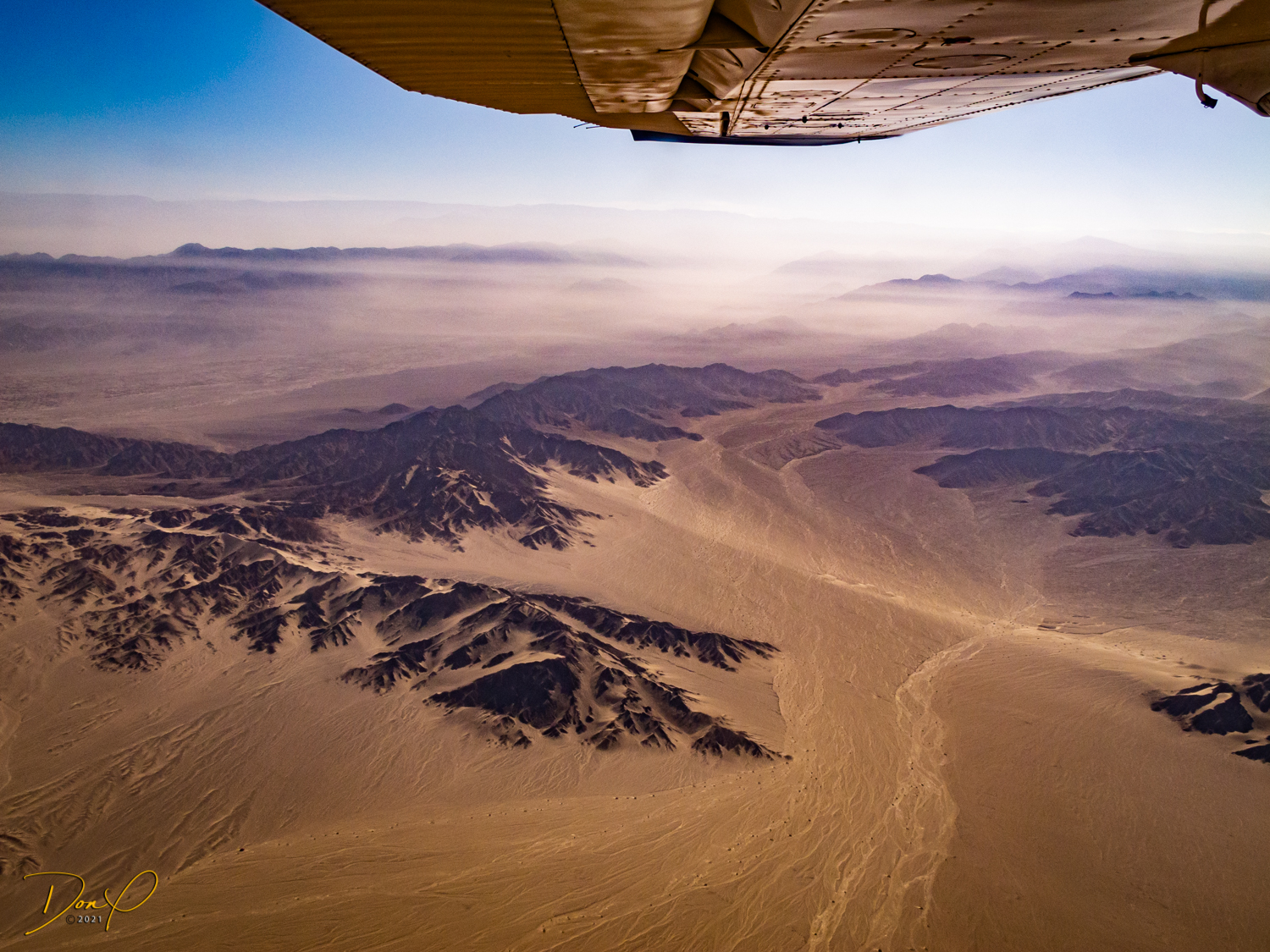 We first fly over lush green farms that are obviously irrigated. We learned from our hotel concierge that it never rains here. The hotel lobby was open to the sky and I asked what they do when it rains. The concierge chuckled and informed me that the last time it rained was in 1955 and they got a whopping one tenth of an inch! We do fly over what appears to be a resort that is an oasis in the desert for real. Can you spot it? The rest of the desert has only been eroded by the wind!