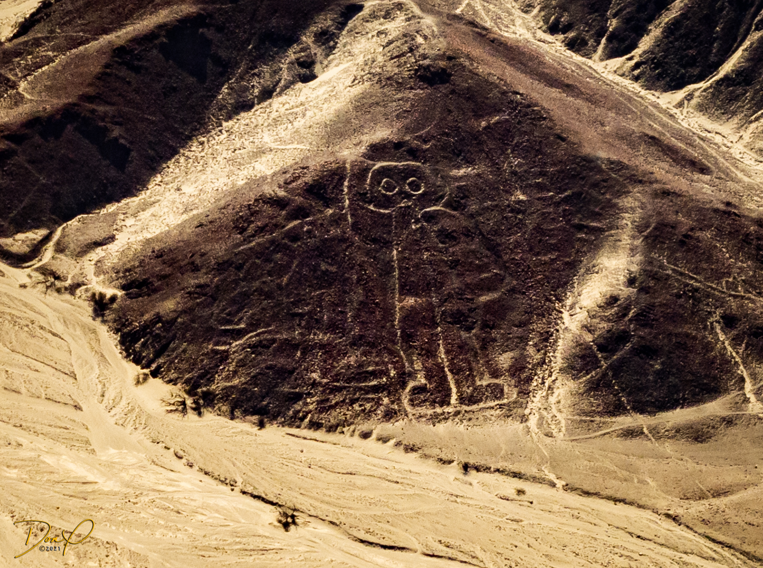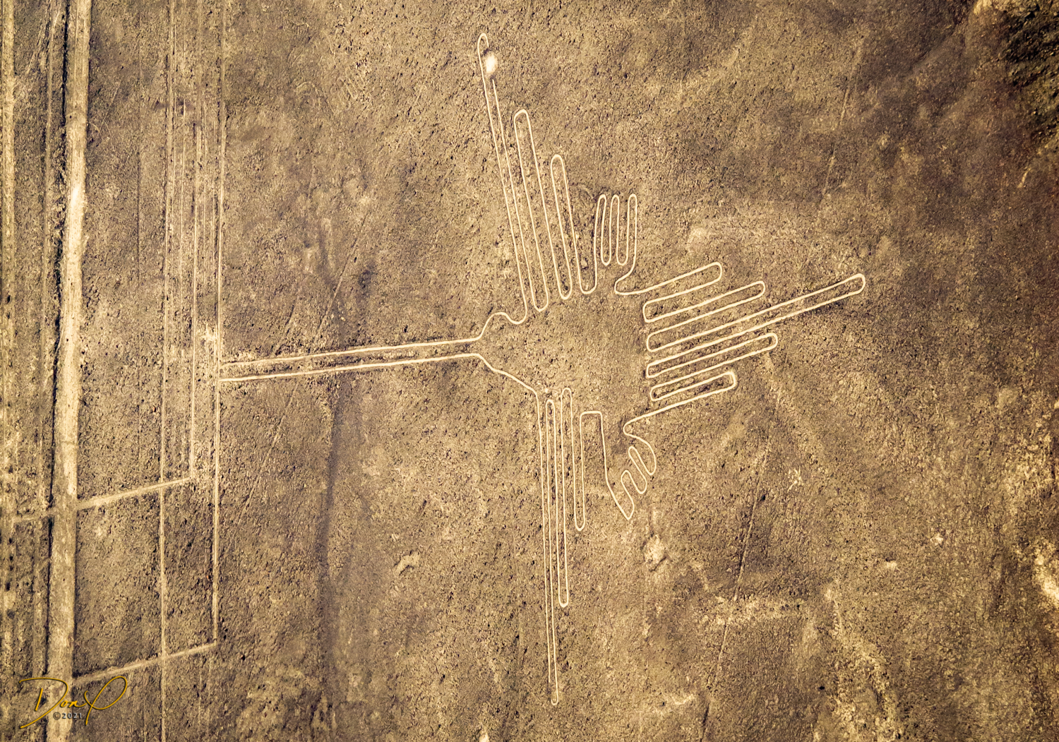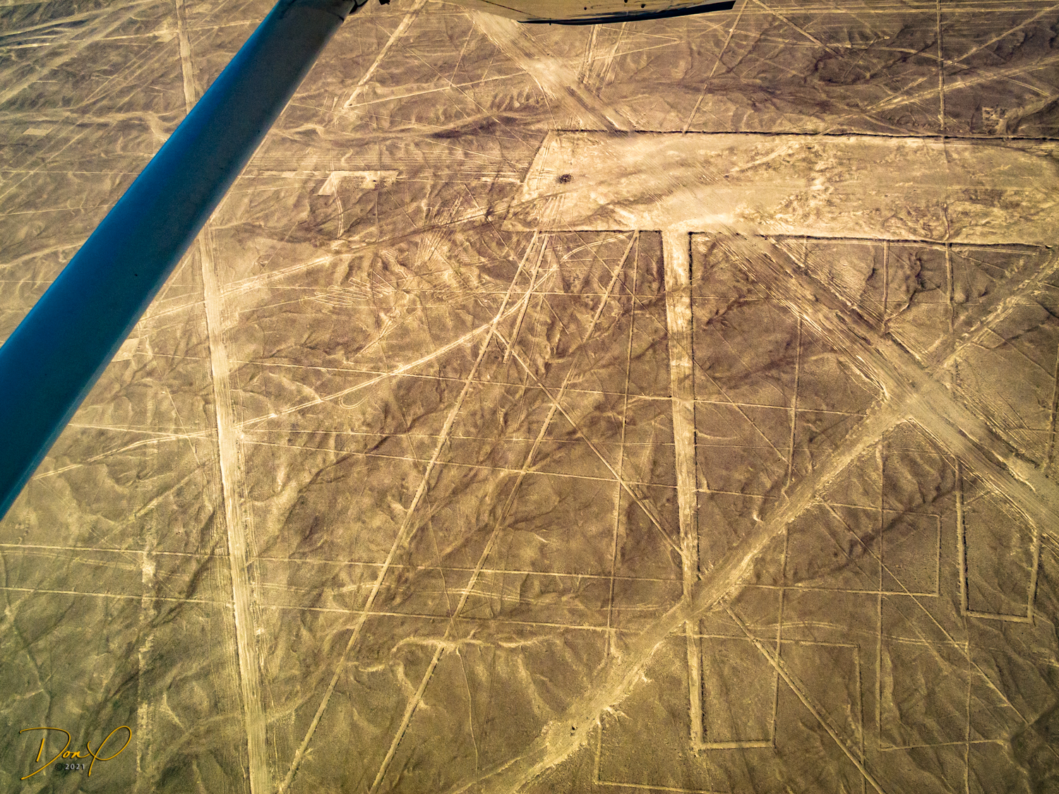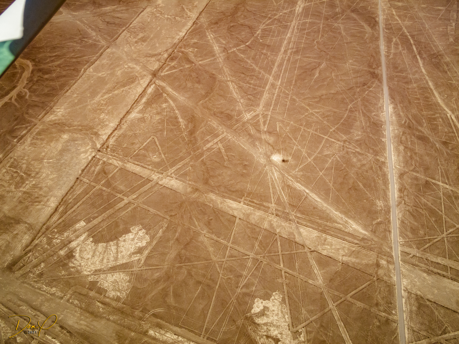 We finally reach the area they call the “Nazca Lines”! This is a spectacular day! A lot of the lines are seemingly random geometrical lines that criss-cross the desert without specific patterns. Now I feel it important to point out that all of the Nazca Lines were made in these deserts over 3000 years ago! Long before the concept of flight was even a glimmer in the most educated scholar of the day’s mind! Now as you will see in the photos, some of these lines and patterns go for miles, much farther than the eye can see on the ground! Also know that the lowest we flew was one mile up as per the aviation rules regarding this area!