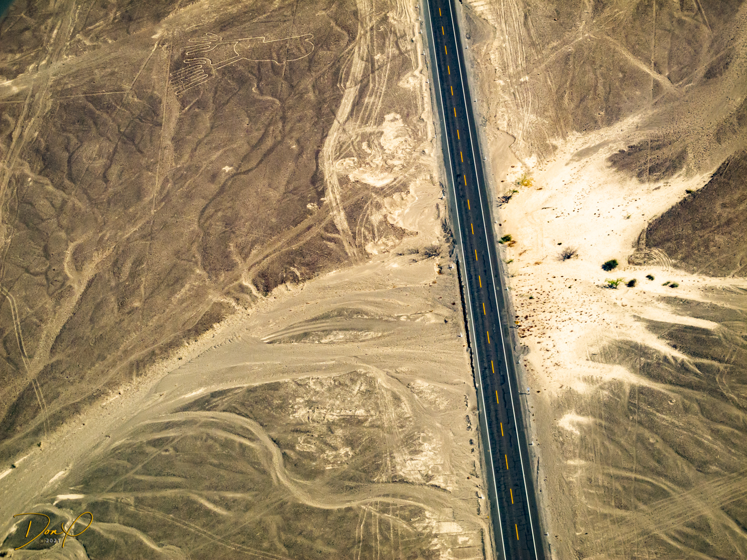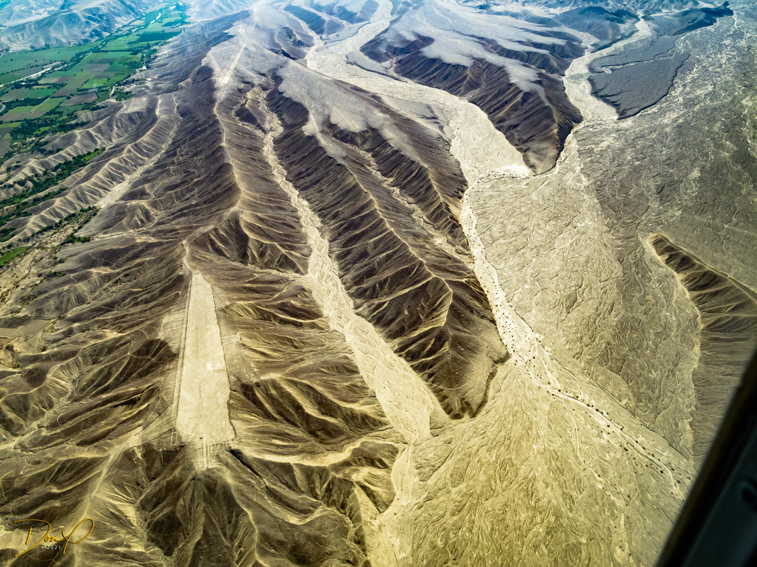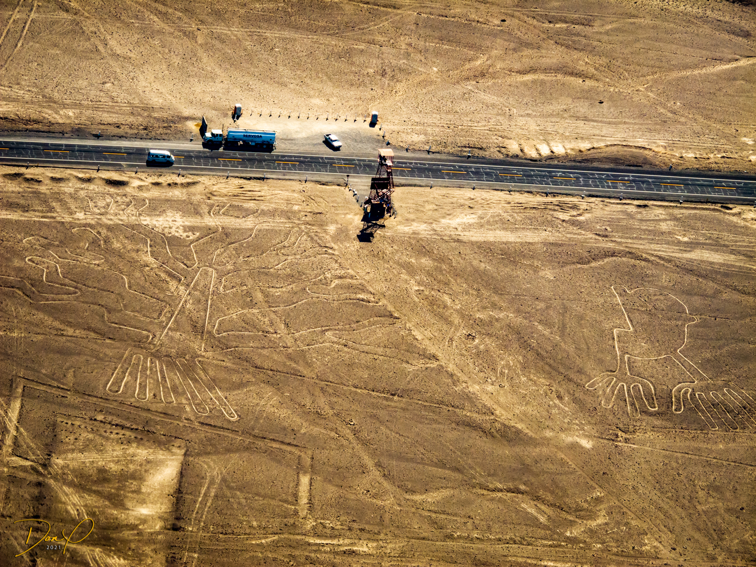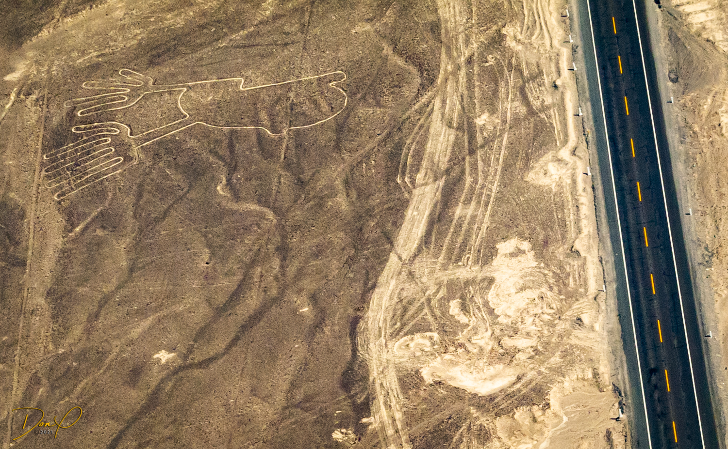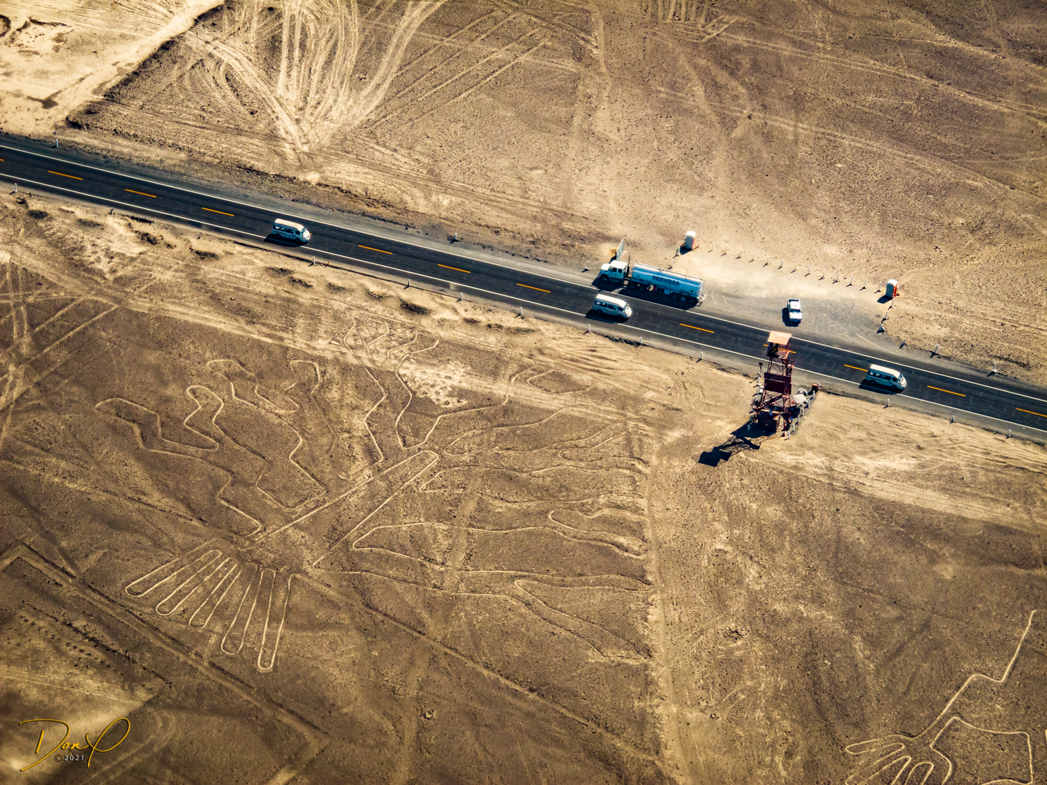 We finally reach the area they call the “Nazca Lines”! This is a spectacular day! A lot of the lines are seemingly random geometrical lines that criss-cross the desert without specific patterns. Now I feel it important to point out that all of the Nazca Lines were made in these deserts over 3000 years ago! Long before the concept of flight was even a glimmer in the most educated scholar of the day’s mind! Now as you will see in the photos, some of these lines and patterns go for miles, much farther than the eye can see on the ground! Also know that the lowest we flew was one mile up as per the aviation rules regarding this area!