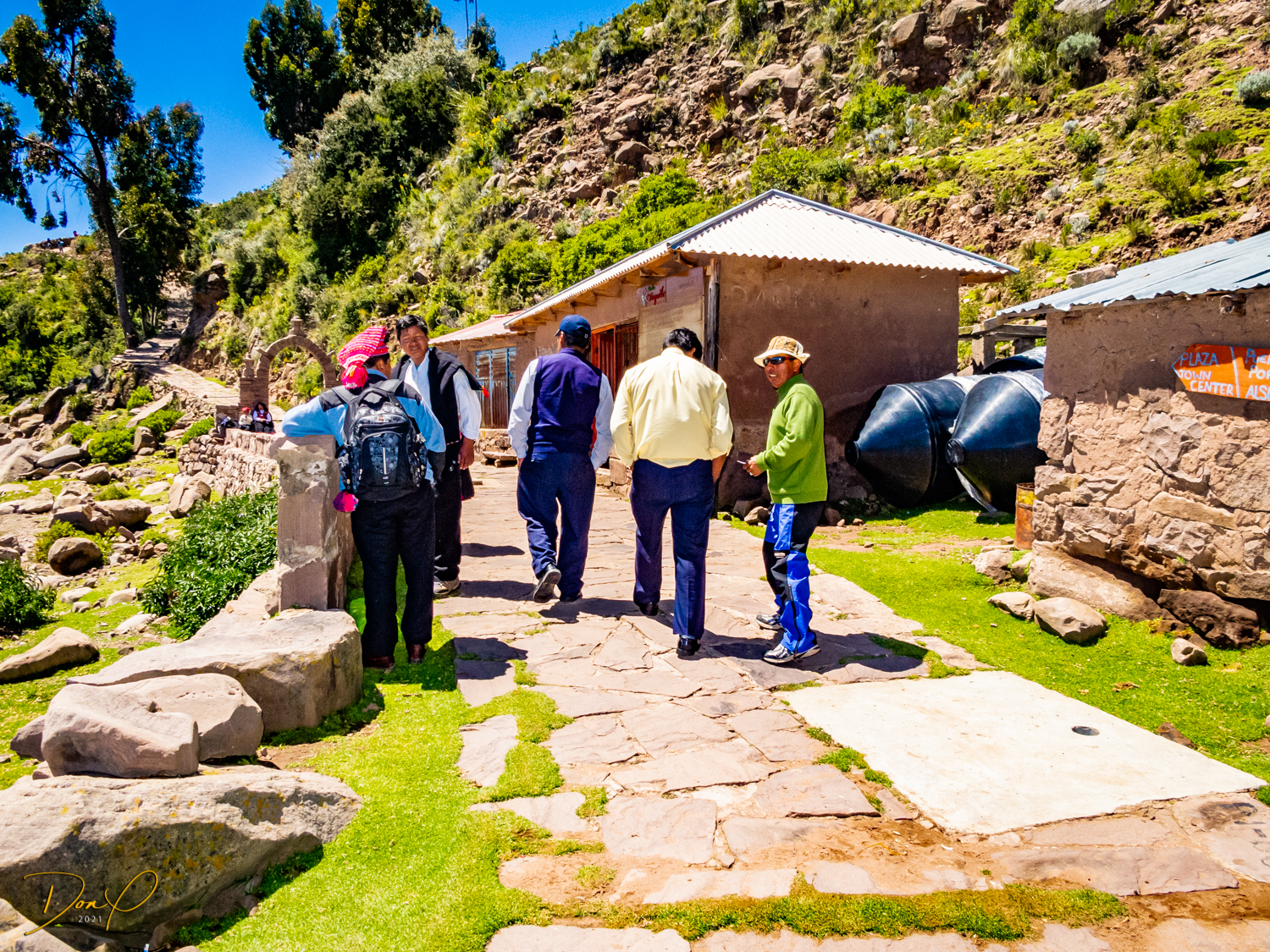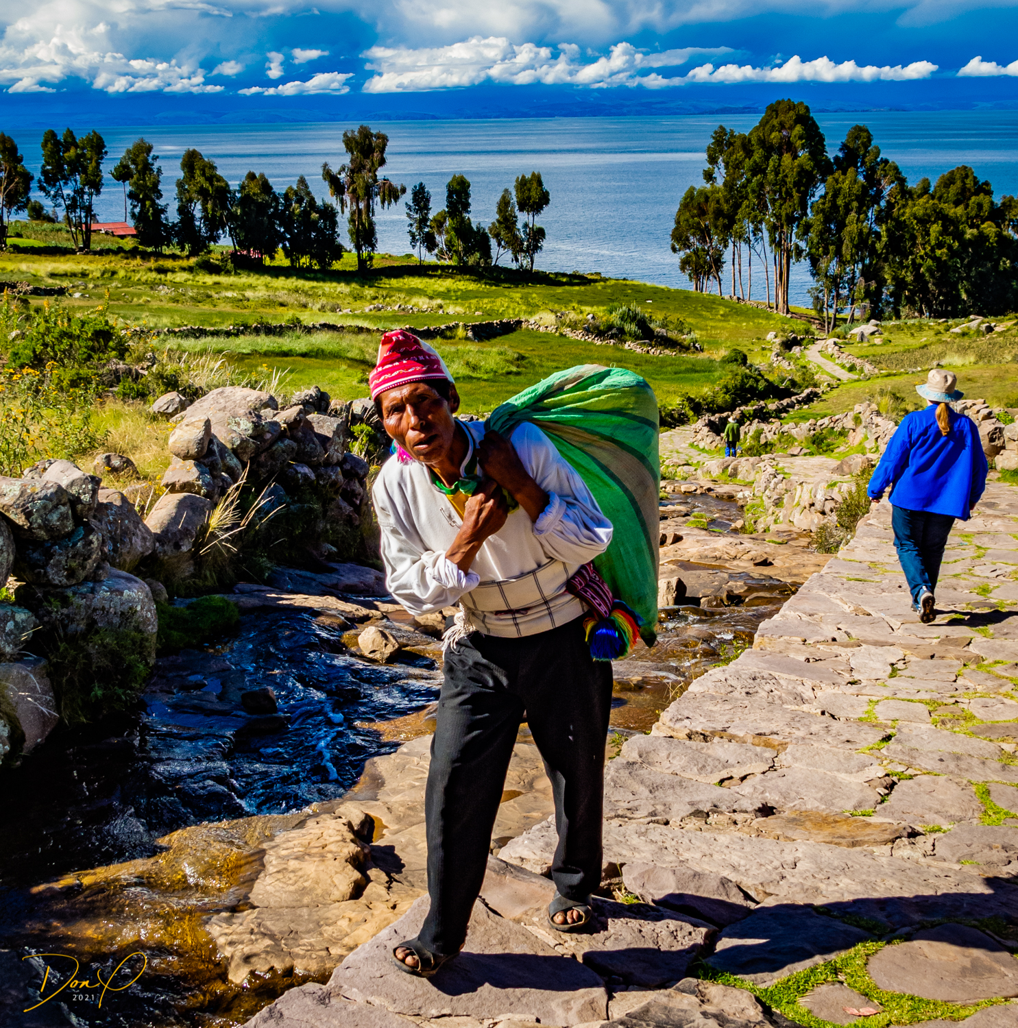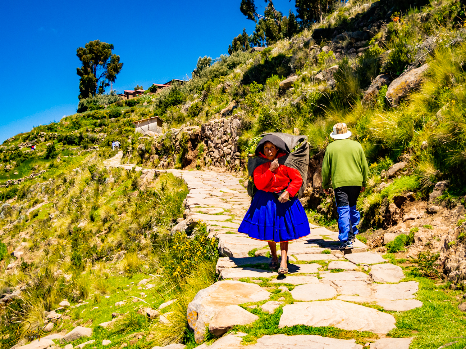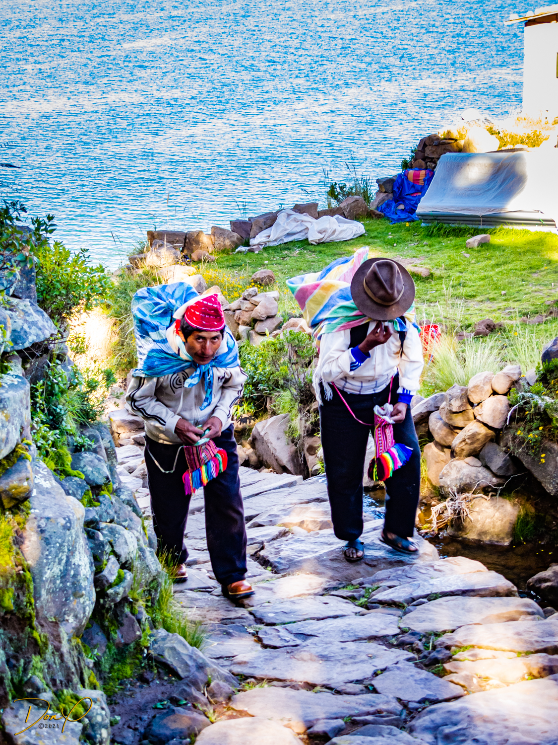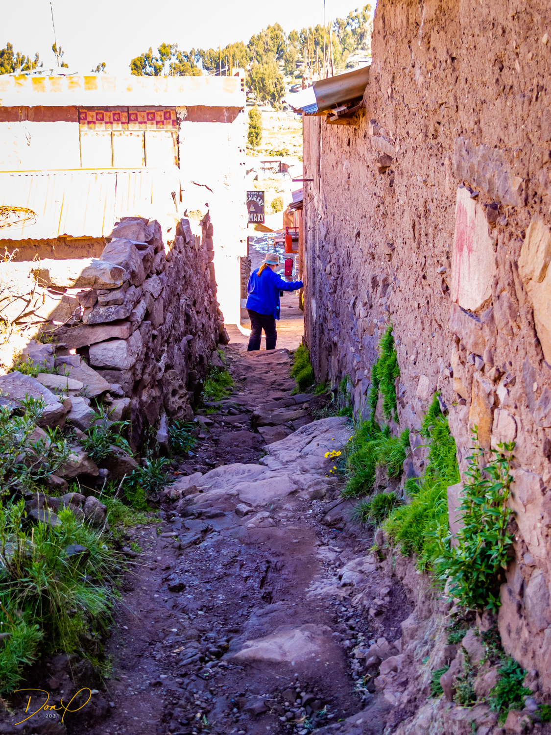 So now that we are totally exhausted, Our guide suggests lunch and we heartily agree! He says lunch is up on top of the island. What we don’t understand yet is the top of the island is 1200 vertical meters up or 4000 feet which puts the top of the island at 16,500 feet (5030 meters) which is the highest altitude of the entire trip! At least the path is somewhat smooth. So, after exerting yourself in kayaks for 4 miles at high altitude, how do you climb this path? Simple, one foot after the other! So we climb and climb and climb. There are no vehicles on this island, everything is foot powered. We see several people and sights along the way and our cameras do their best to capture the good shots!