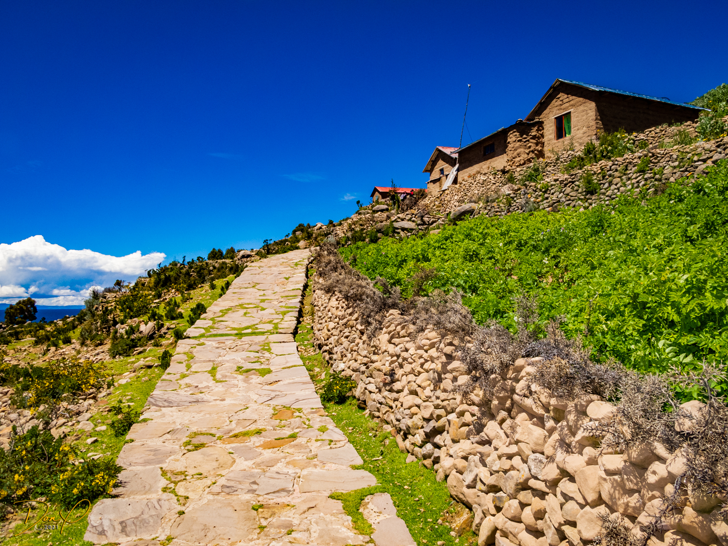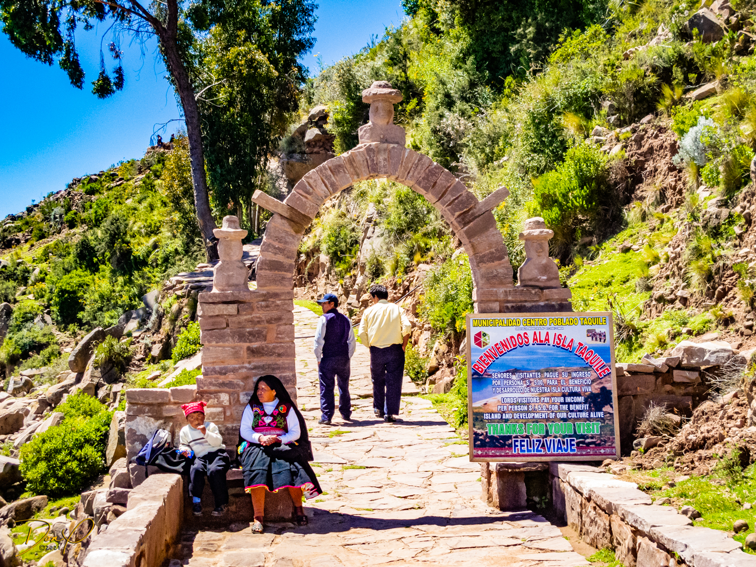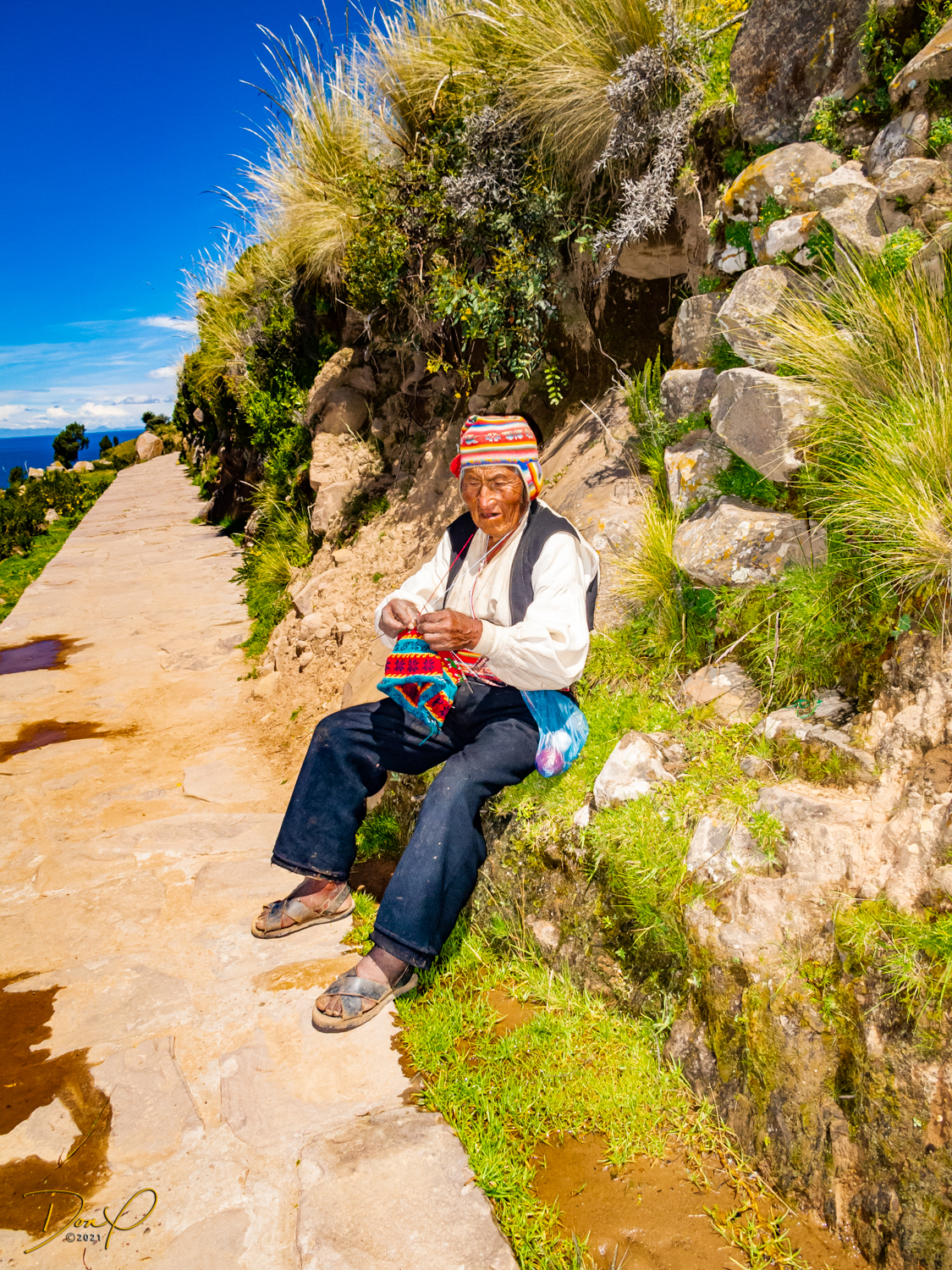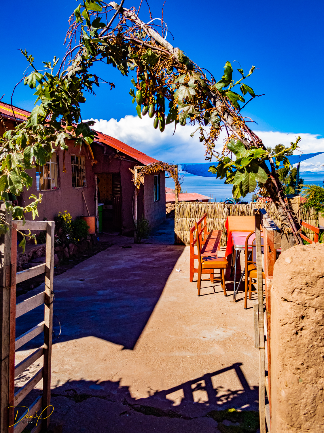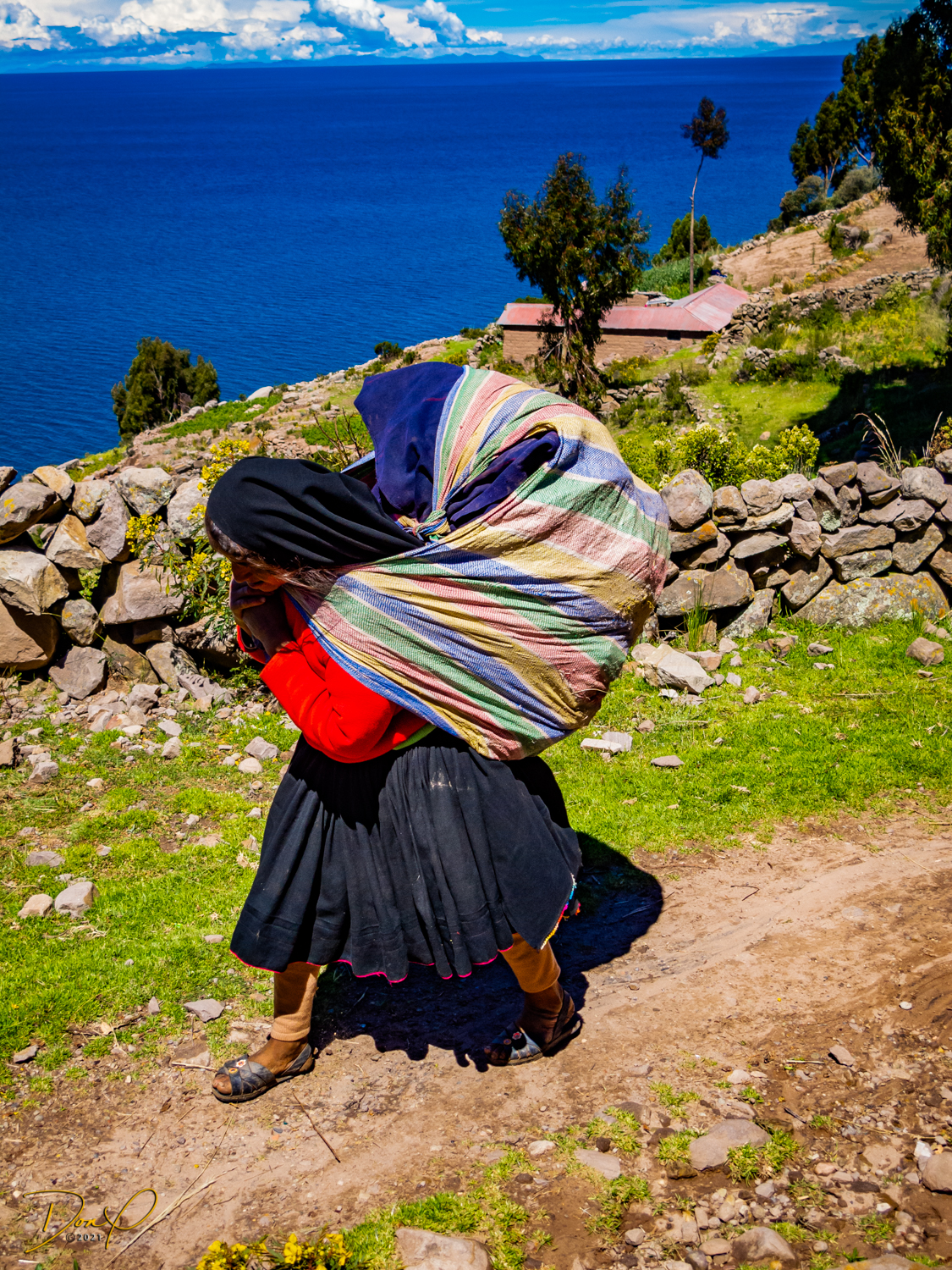 So now that we are totally exhausted, Our guide suggests lunch and we heartily agree! He says lunch is up on top of the island. What we don’t understand yet is the top of the island is 1200 vertical meters up or 4000 feet which puts the top of the island at 16,500 feet (5030 meters) which is the highest altitude of the entire trip! At least the path is somewhat smooth. So, after exerting yourself in kayaks for 4 miles at high altitude, how do you climb this path? Simple, one foot after the other! So we climb and climb and climb. There are no vehicles on this island, everything is foot powered. We see several people and sights along the way and our cameras do their best to capture the good shots!