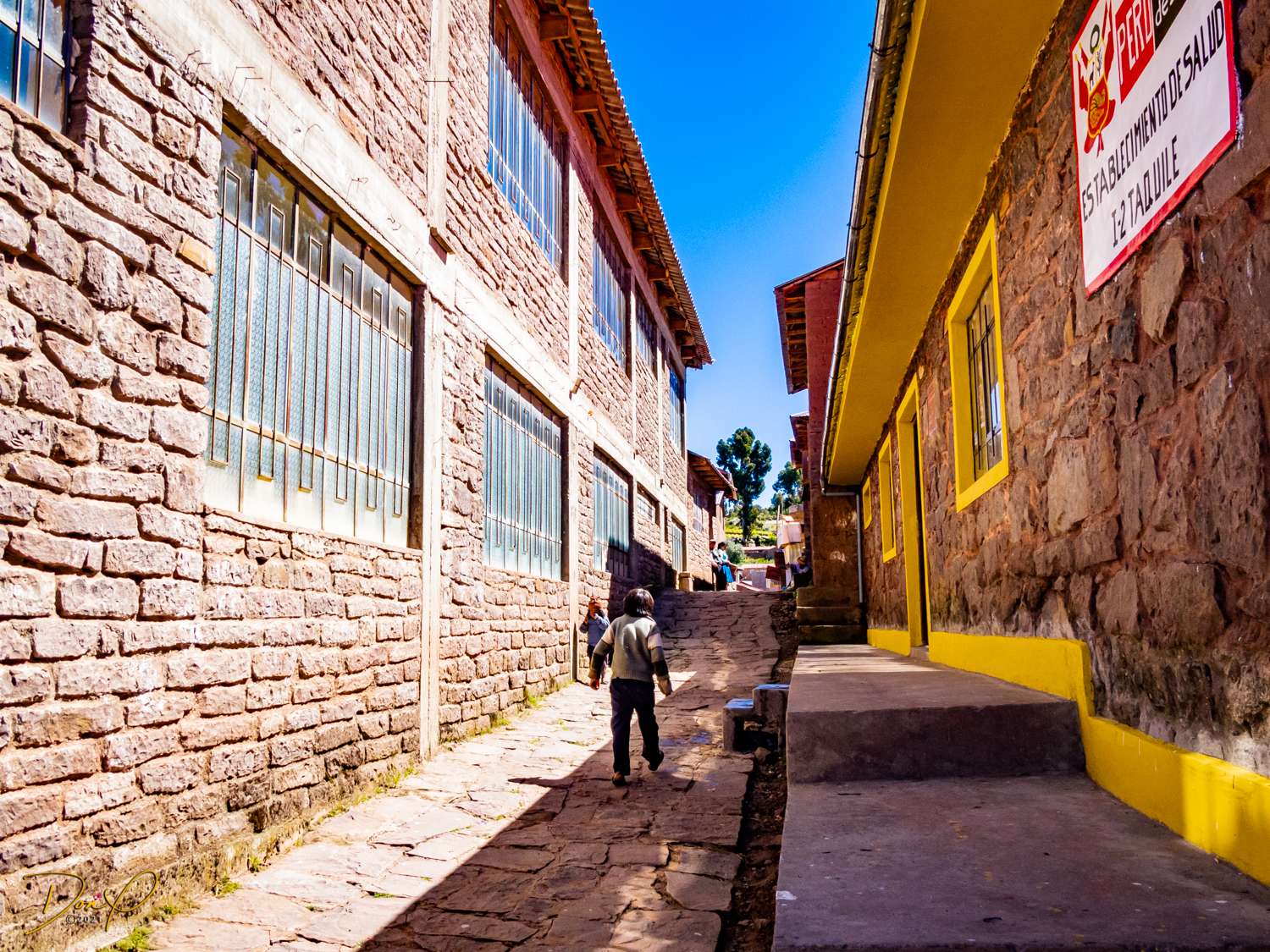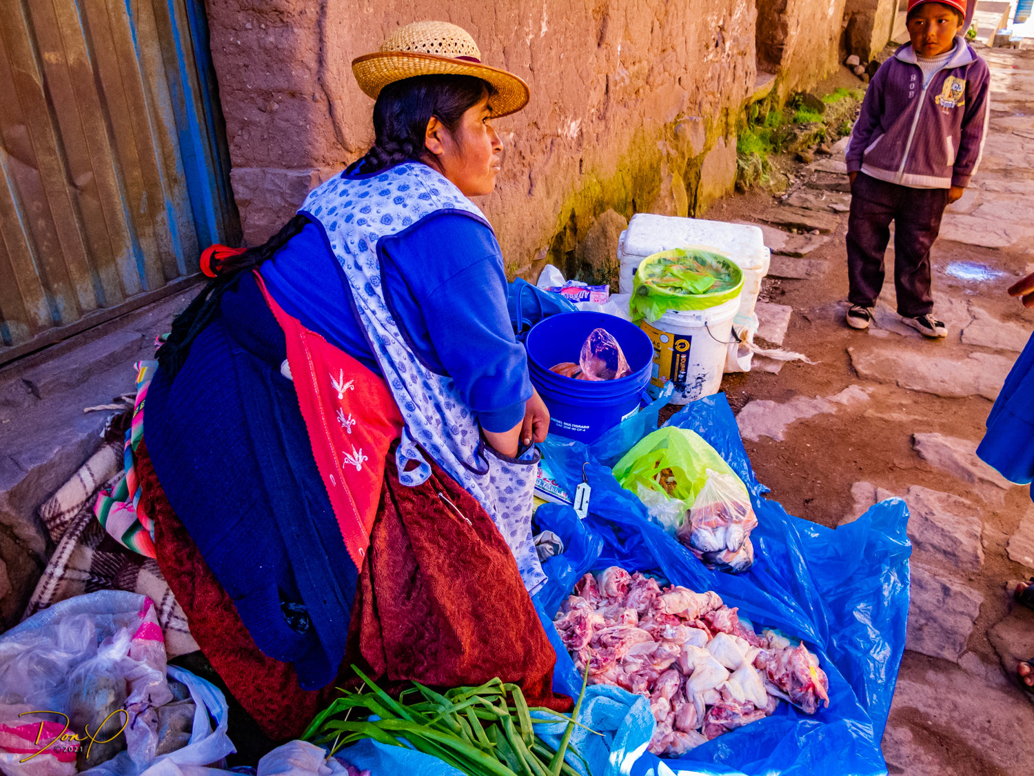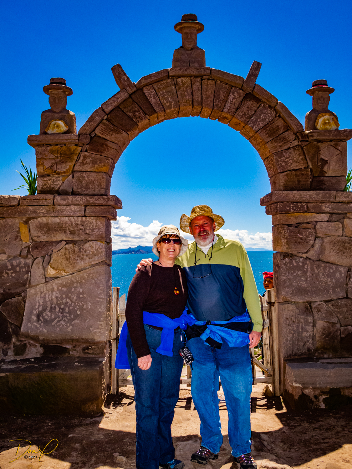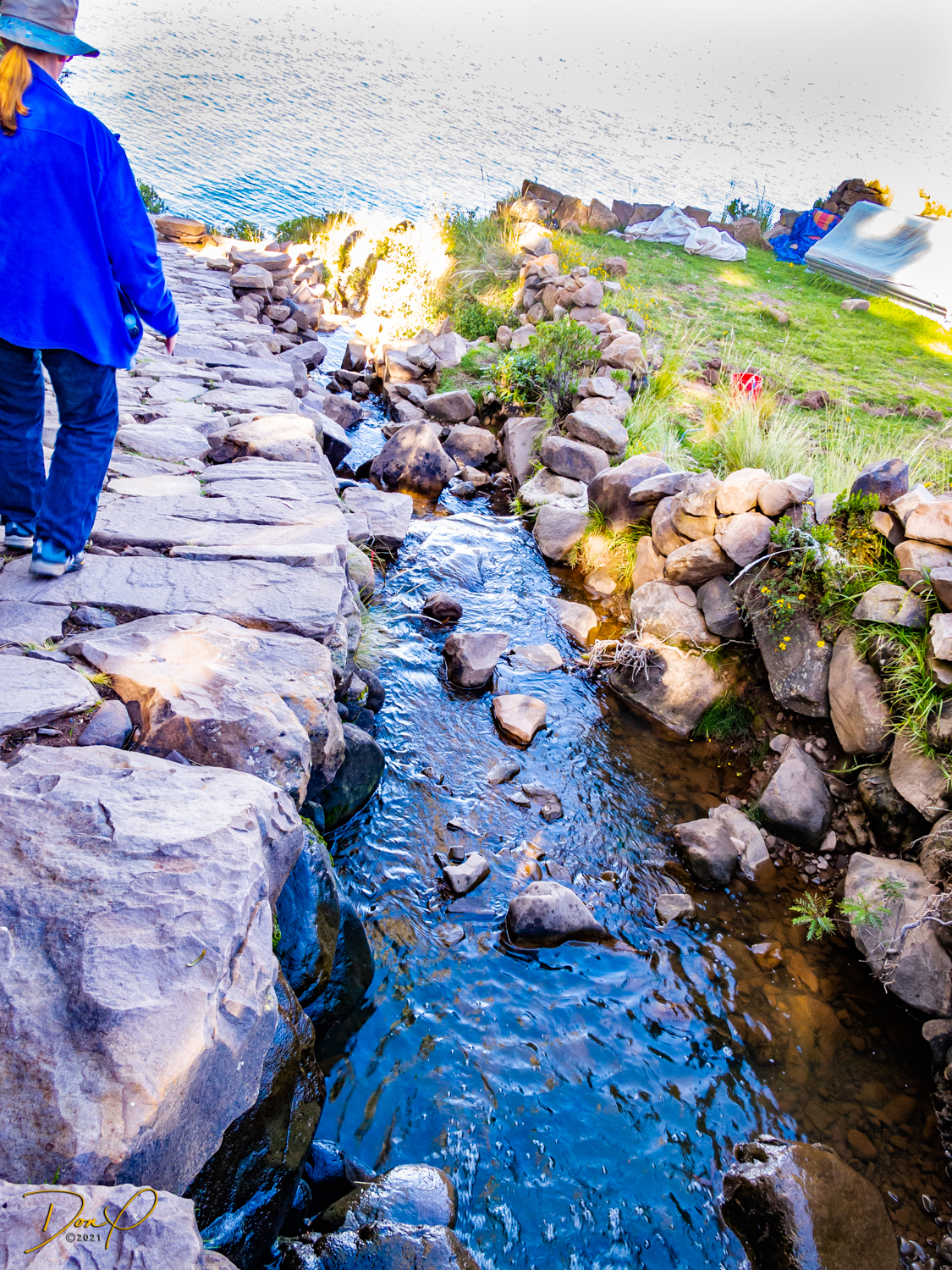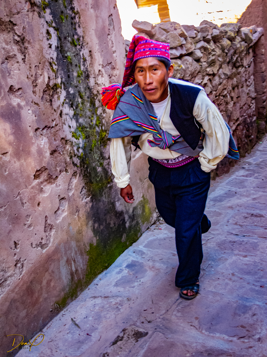 So now that we are totally exhausted, Our guide suggests lunch and we heartily agree! He says lunch is up on top of the island. What we don’t understand yet is the top of the island is 1200 vertical meters up or 4000 feet which puts the top of the island at 16,500 feet (5030 meters) which is the highest altitude of the entire trip! At least the path is somewhat smooth. So, after exerting yourself in kayaks for 4 miles at high altitude, how do you climb this path? Simple, one foot after the other! So we climb and climb and climb. There are no vehicles on this island, everything is foot powered. We see several people and sights along the way and our cameras do their best to capture the good shots!