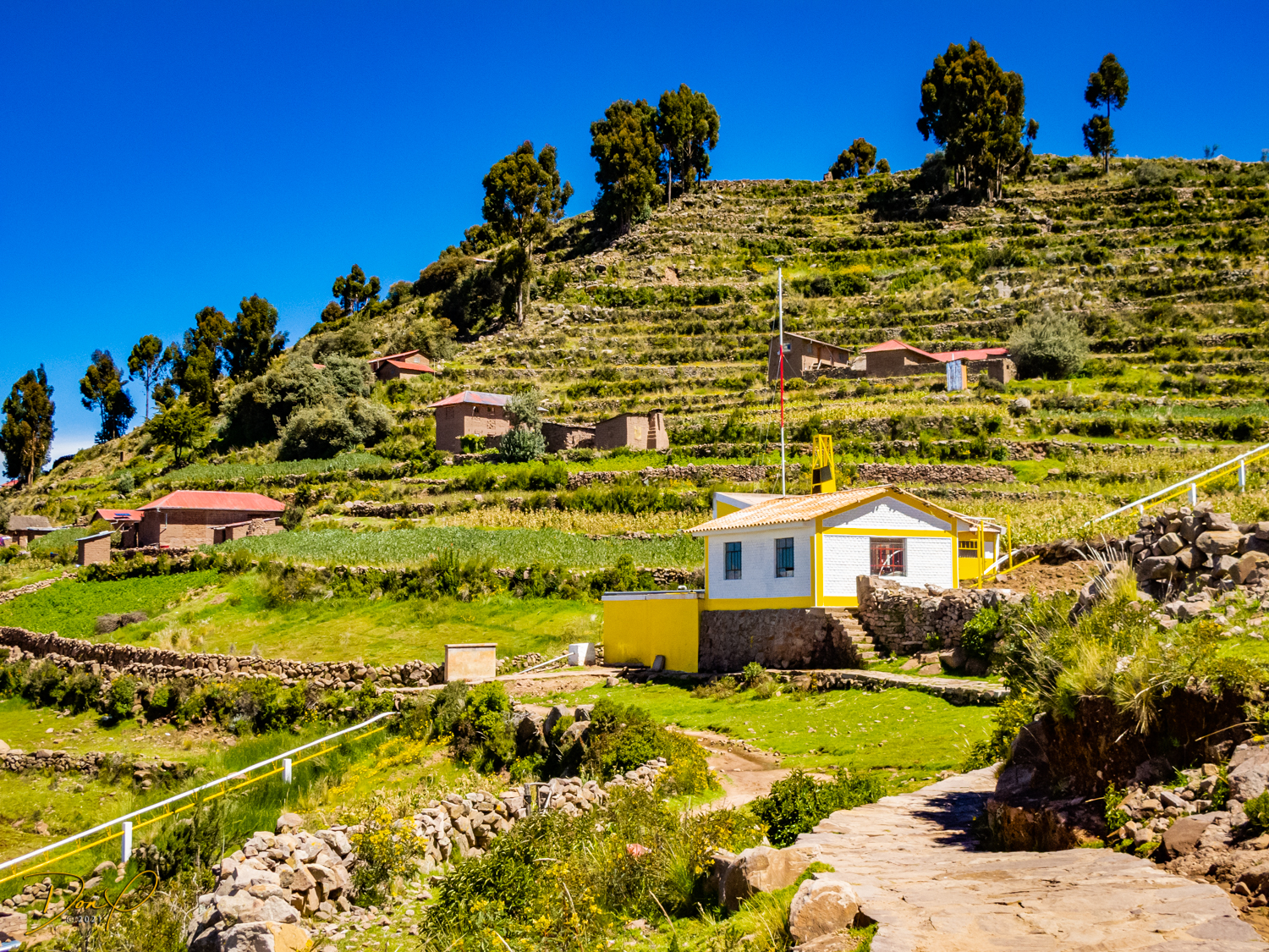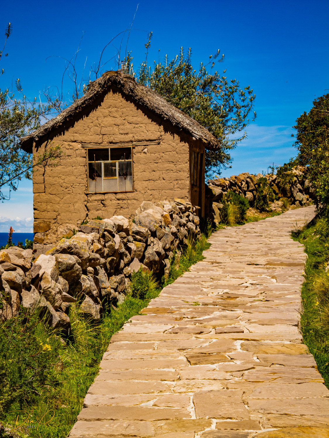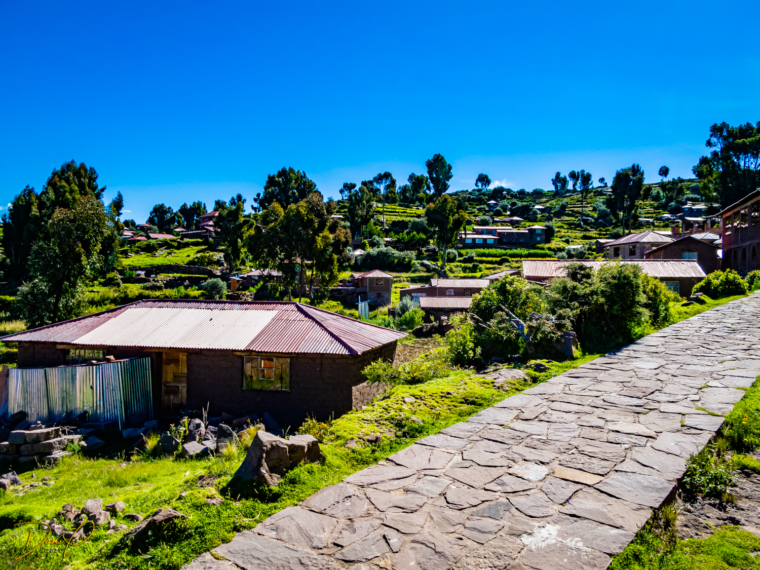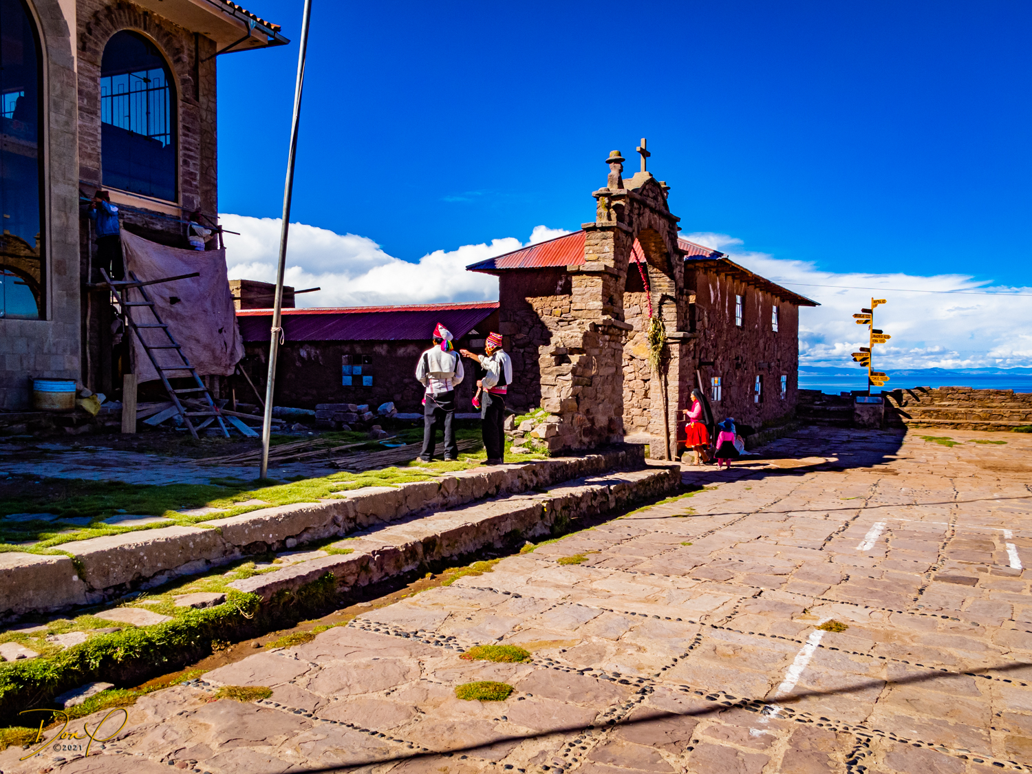 So now that we are totally exhausted, Our guide suggests lunch and we heartily agree! He says lunch is up on top of the island. What we don’t understand yet is the top of the island is 1200 vertical meters up or 4000 feet which puts the top of the island at 16,500 feet (5030 meters) which is the highest altitude of the entire trip! At least the path is somewhat smooth. So, after exerting yourself in kayaks for 4 miles at high altitude, how do you climb this path? Simple, one foot after the other! So we climb and climb and climb. There are no vehicles on this island, everything is foot powered. We see several people and sights along the way and our cameras do their best to capture the good shots!