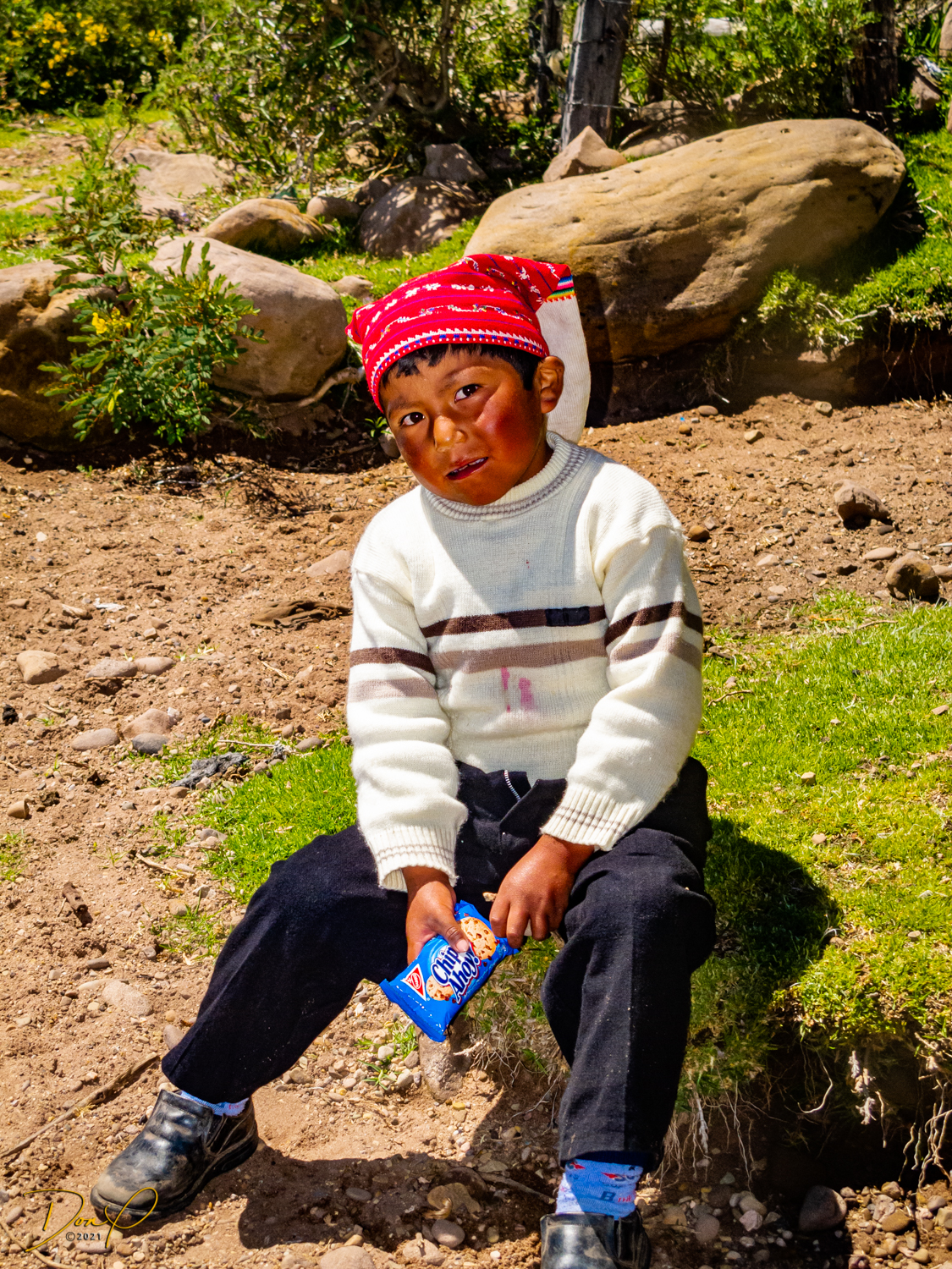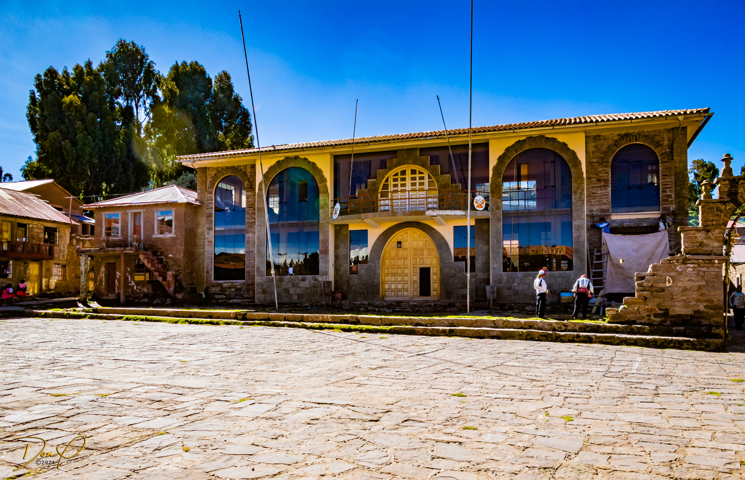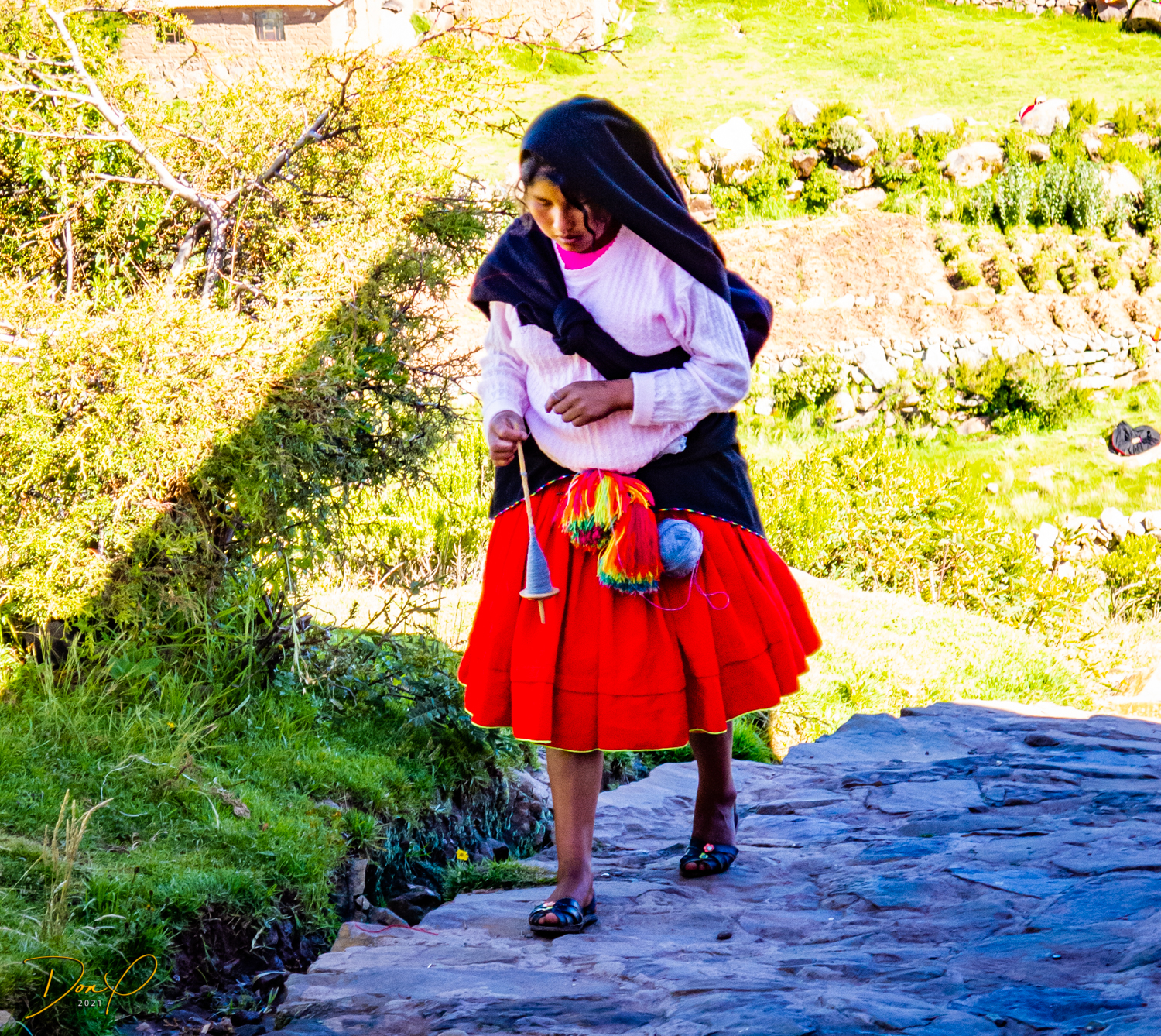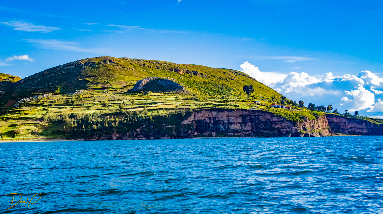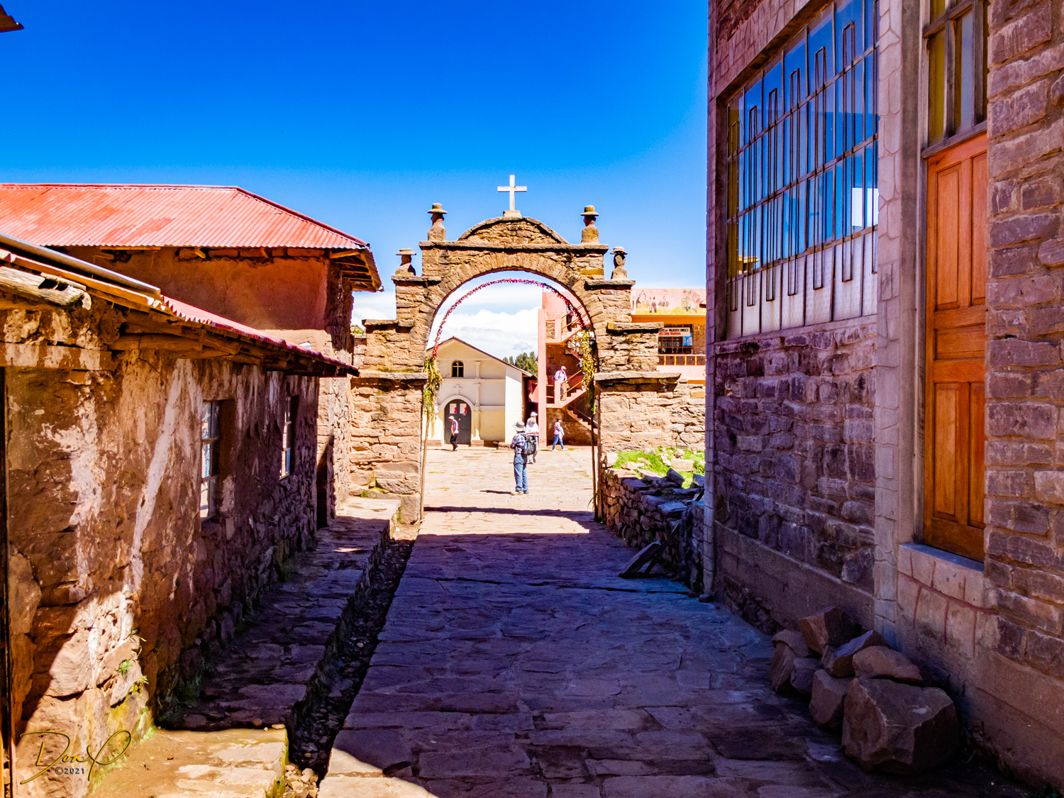 So now that we are totally exhausted, Our guide suggests lunch and we heartily agree! He says lunch is up on top of the island. What we don’t understand yet is the top of the island is 1200 vertical meters up or 4000 feet which puts the top of the island at 16,500 feet (5030 meters) which is the highest altitude of the entire trip! At least the path is somewhat smooth. So, after exerting yourself in kayaks for 4 miles at high altitude, how do you climb this path? Simple, one foot after the other! So we climb and climb and climb. There are no vehicles on this island, everything is foot powered. We see several people and sights along the way and our cameras do their best to capture the good shots!