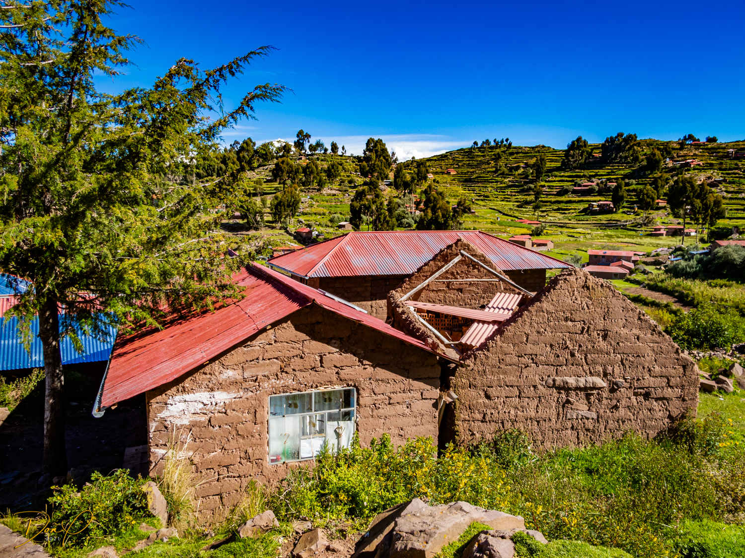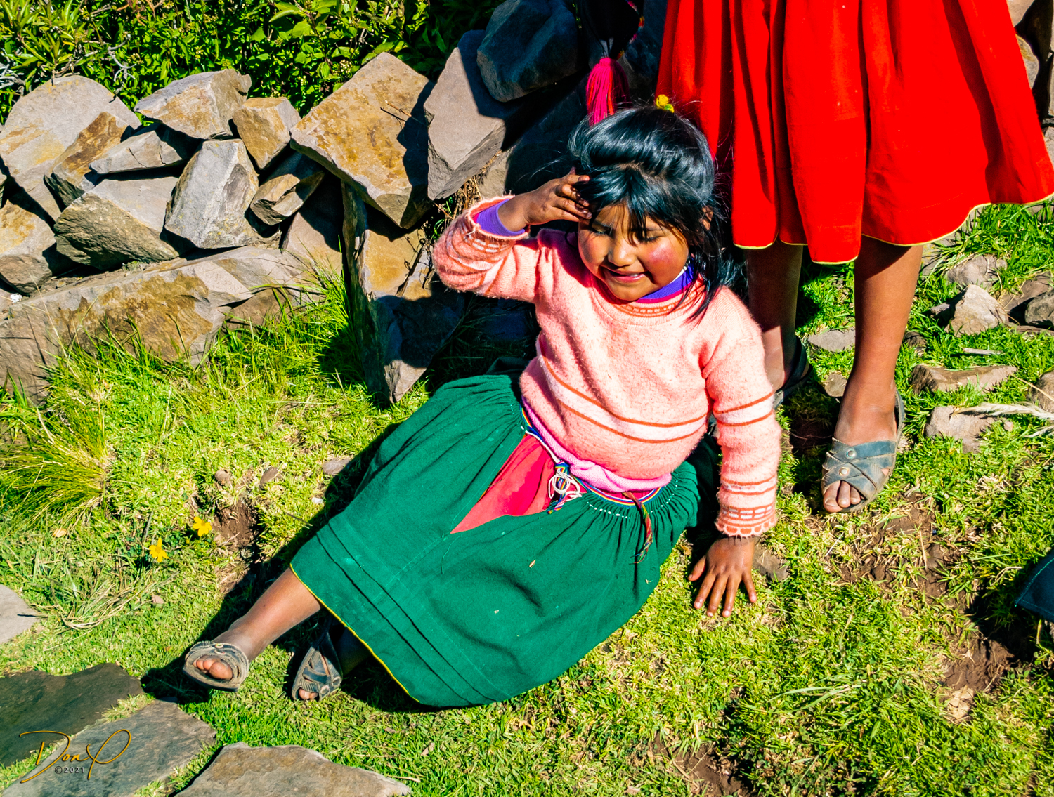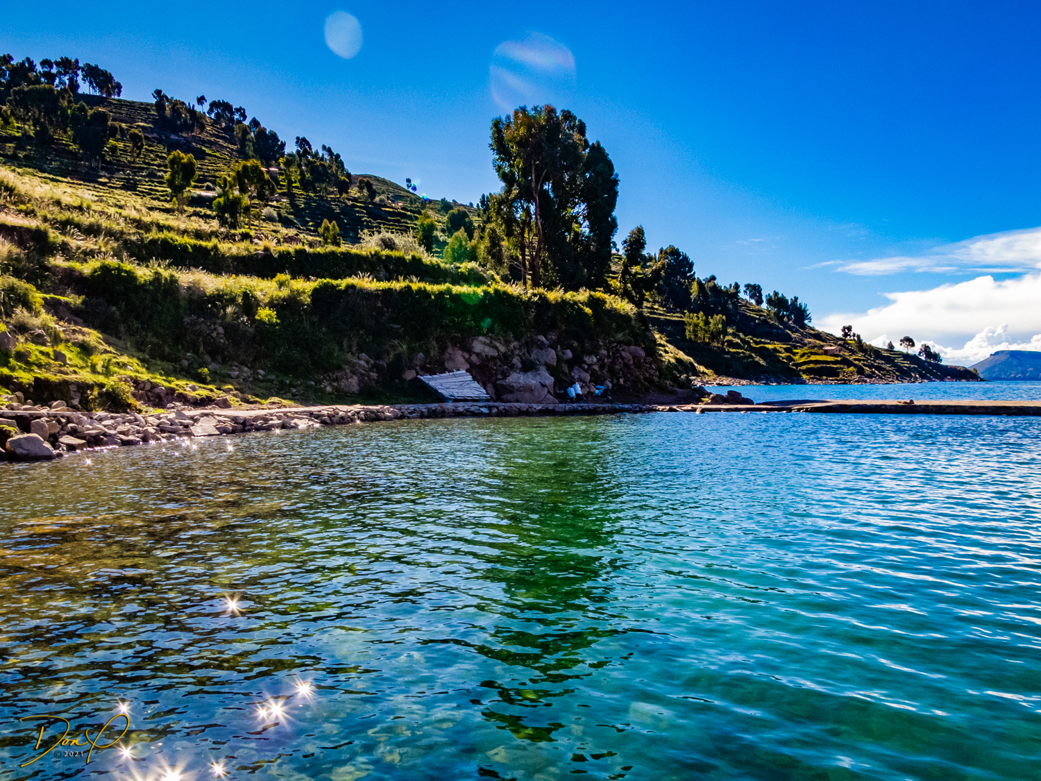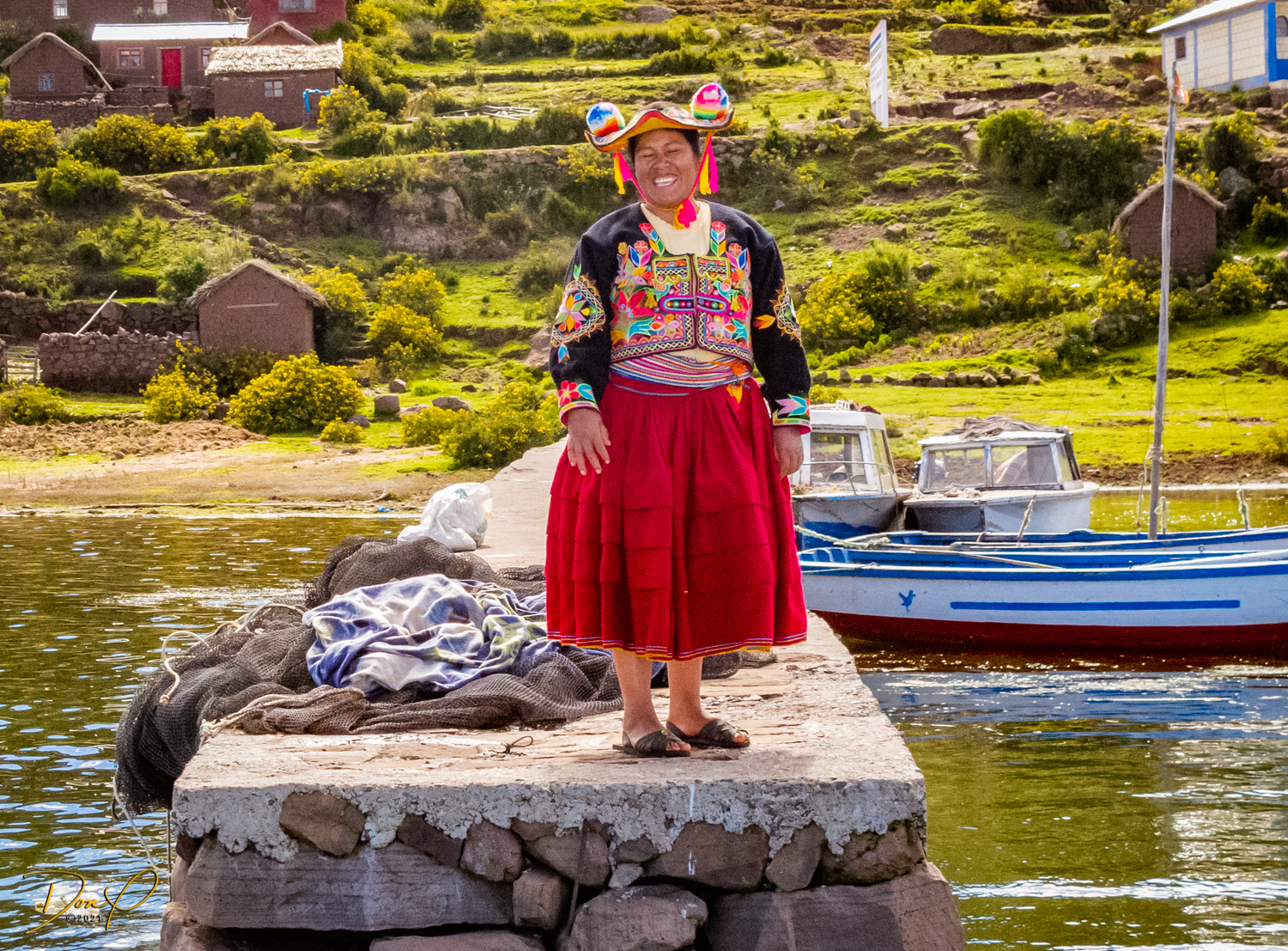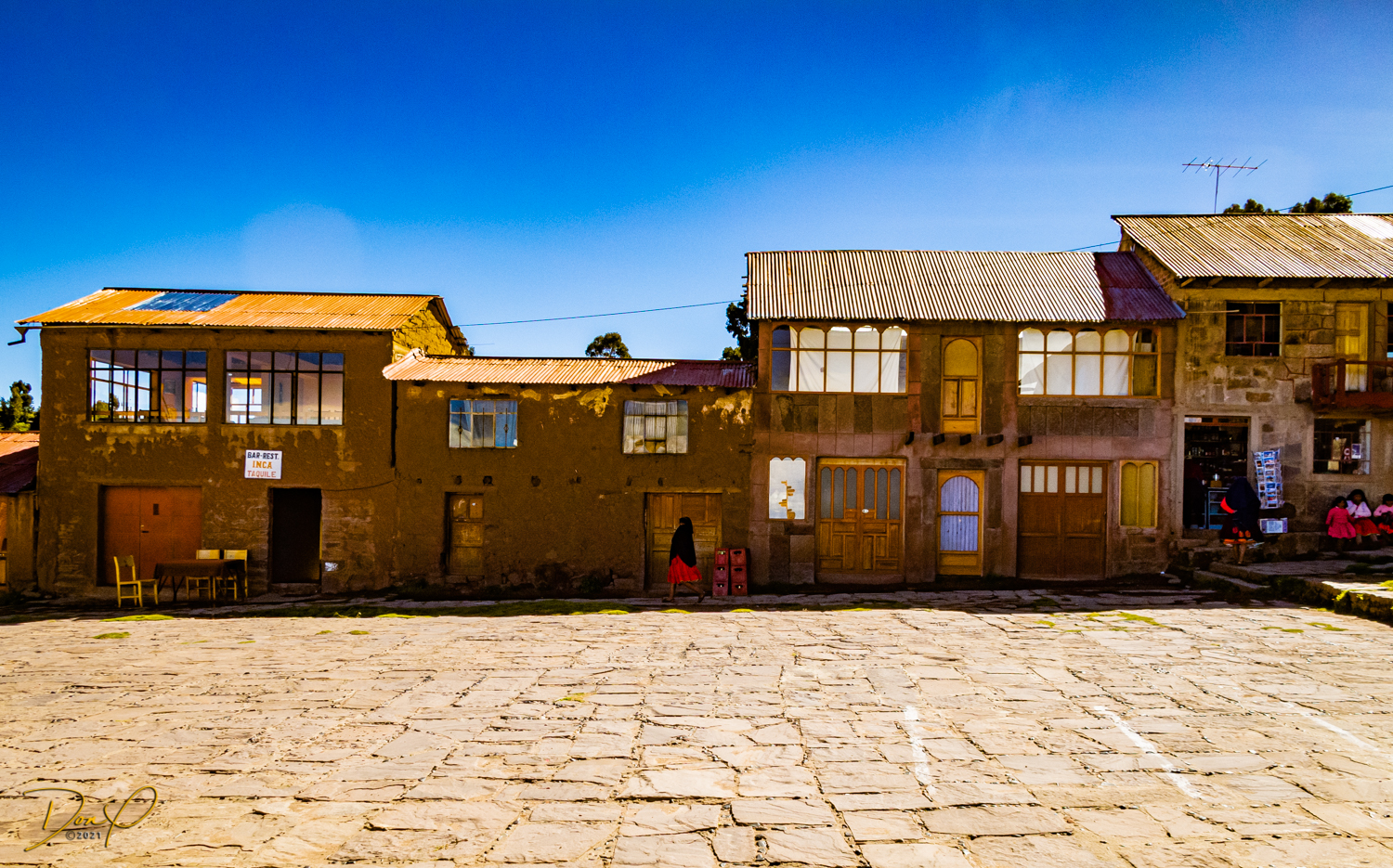 So now that we are totally exhausted, Our guide suggests lunch and we heartily agree! He says lunch is up on top of the island. What we don’t understand yet is the top of the island is 1200 vertical meters up or 4000 feet which puts the top of the island at 16,500 feet (5030 meters) which is the highest altitude of the entire trip! At least the path is somewhat smooth. So, after exerting yourself in kayaks for 4 miles at high altitude, how do you climb this path? Simple, one foot after the other! So we climb and climb and climb. There are no vehicles on this island, everything is foot powered. We see several people and sights along the way and our cameras do their best to capture the good shots!