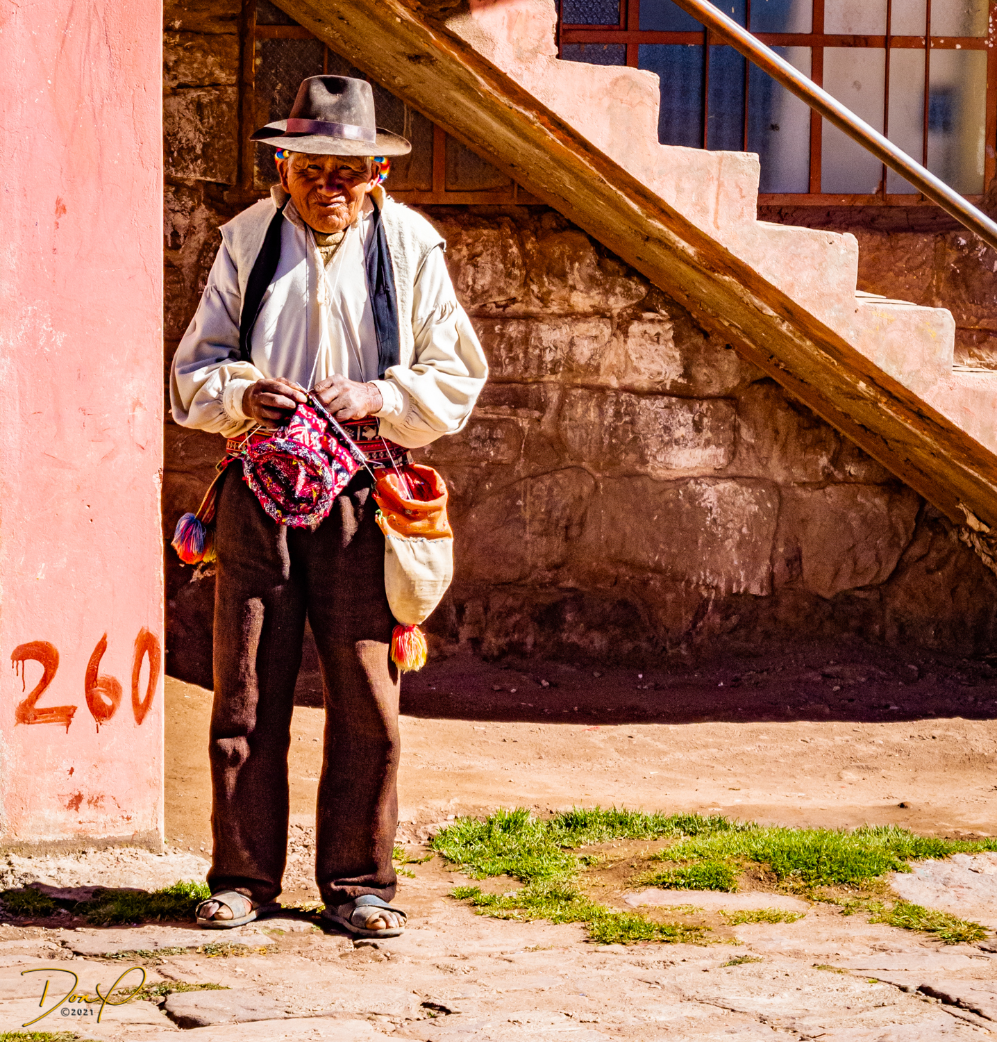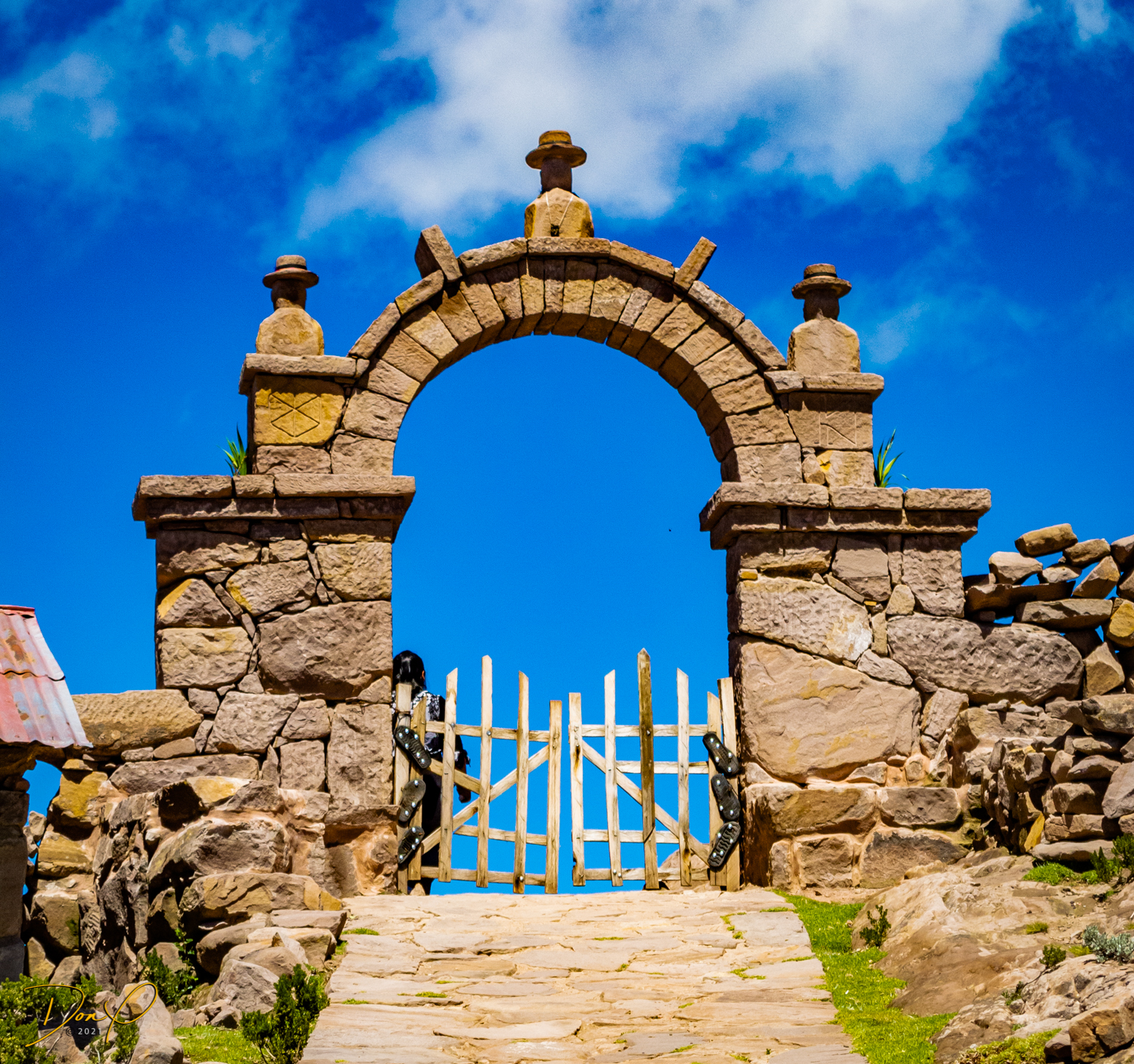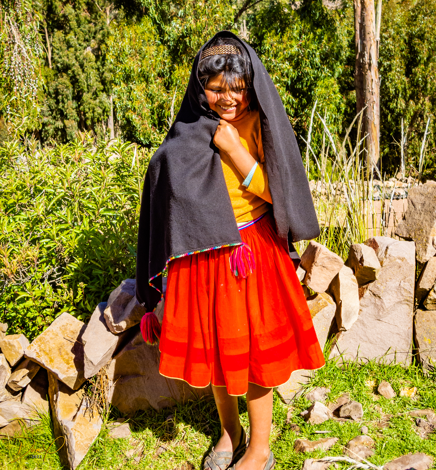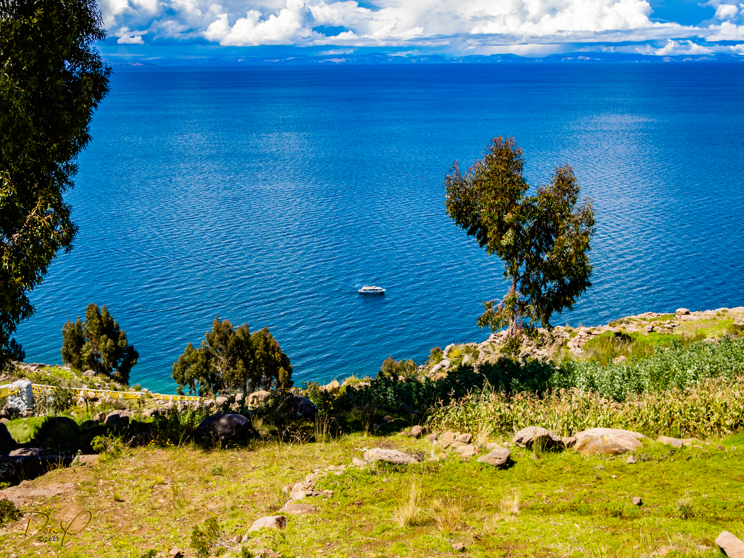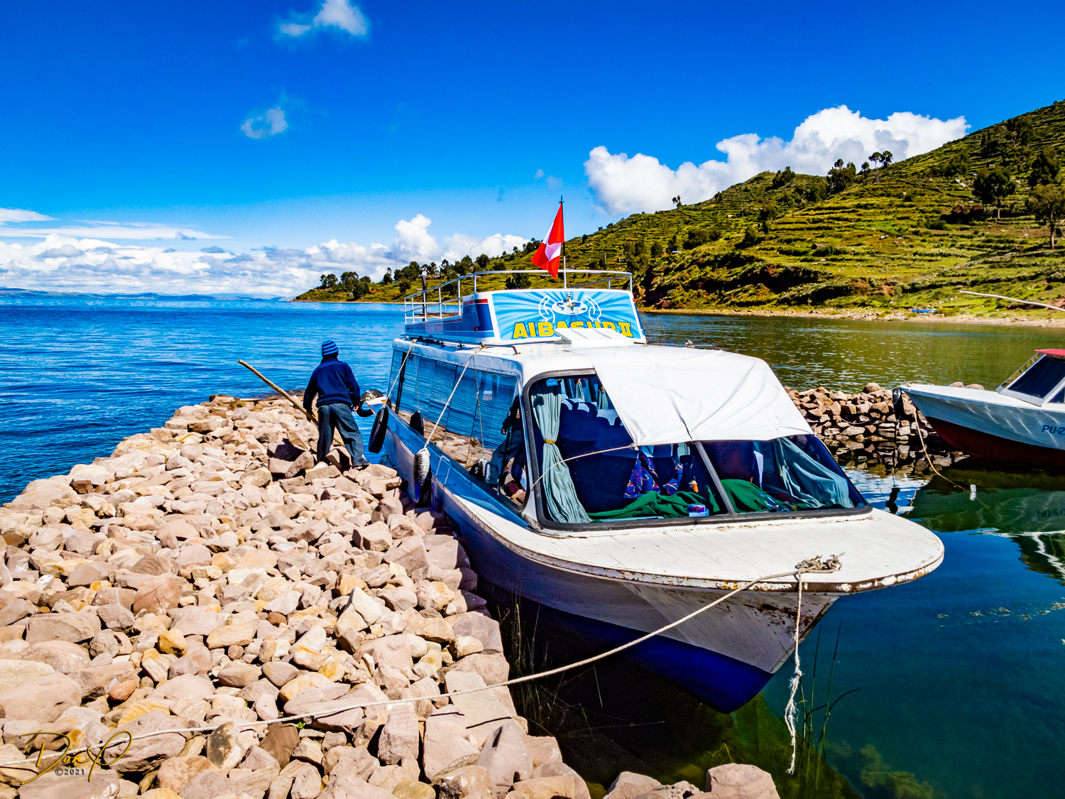 So now that we are totally exhausted, Our guide suggests lunch and we heartily agree! He says lunch is up on top of the island. What we don’t understand yet is the top of the island is 1200 vertical meters up or 4000 feet which puts the top of the island at 16,500 feet (5030 meters) which is the highest altitude of the entire trip! At least the path is somewhat smooth. So, after exerting yourself in kayaks for 4 miles at high altitude, how do you climb this path? Simple, one foot after the other! So we climb and climb and climb. There are no vehicles on this island, everything is foot powered. We see several people and sights along the way and our cameras do their best to capture the good shots!