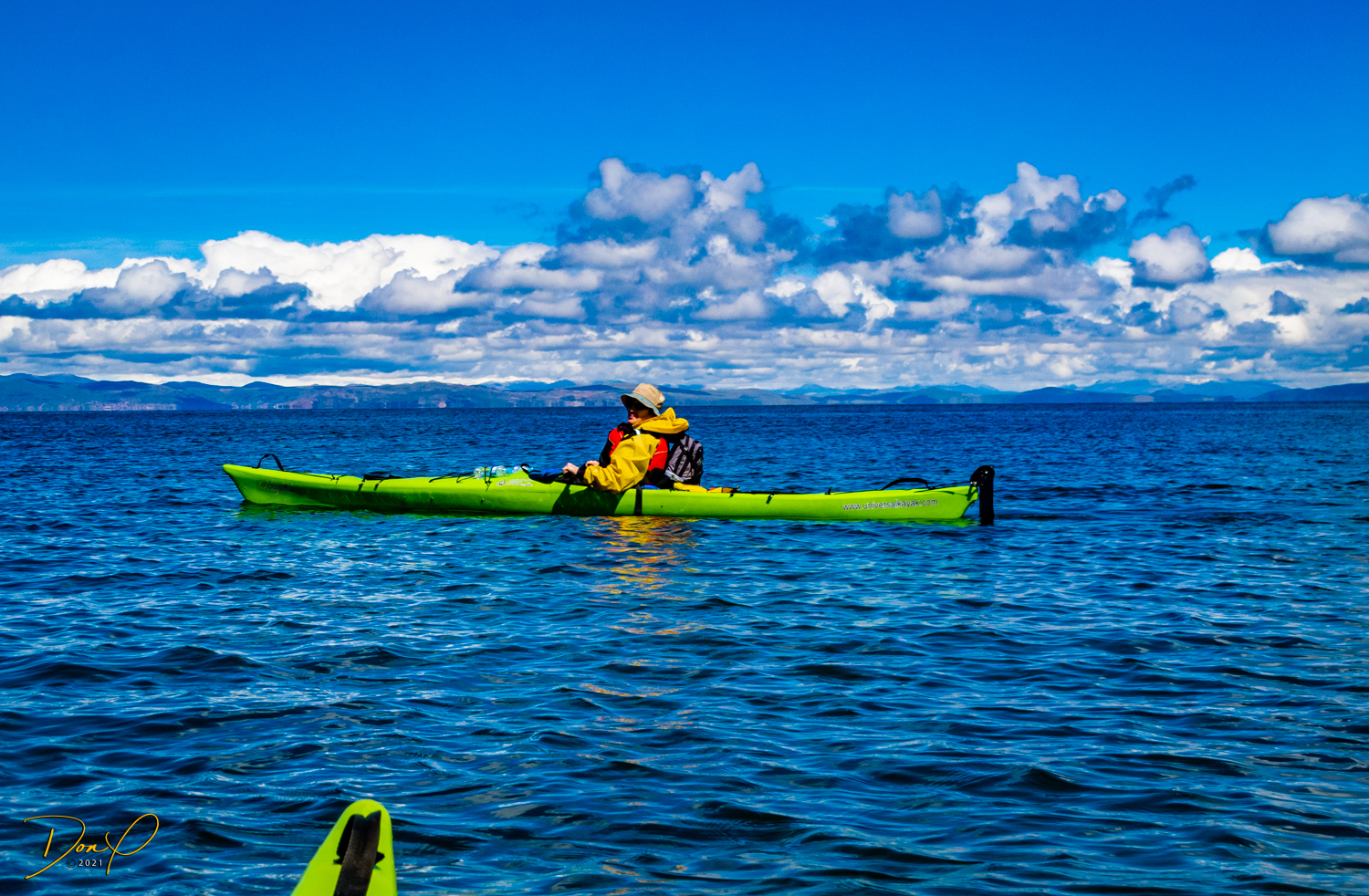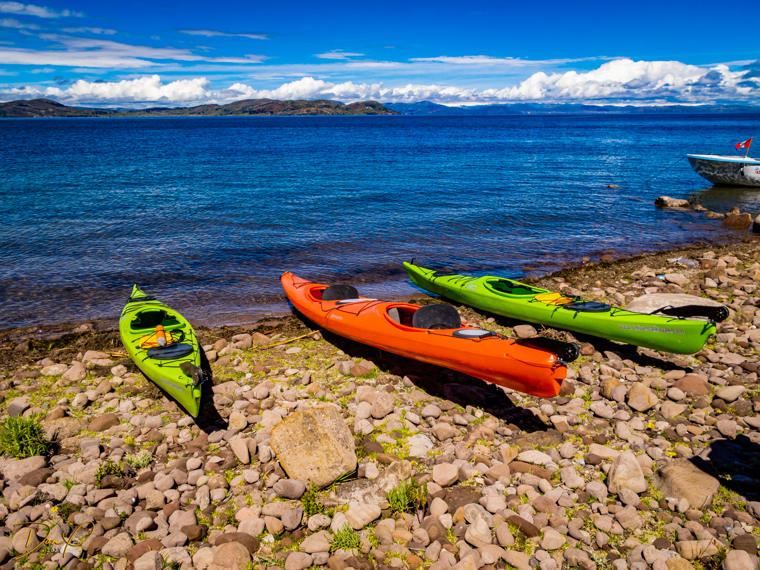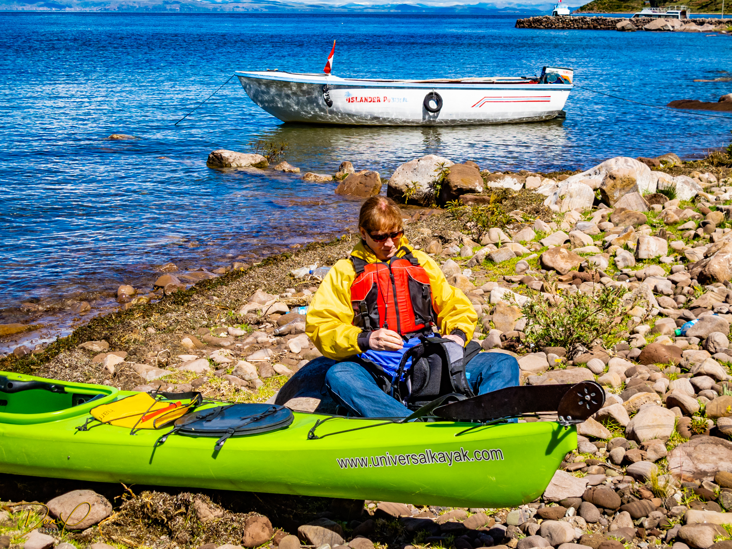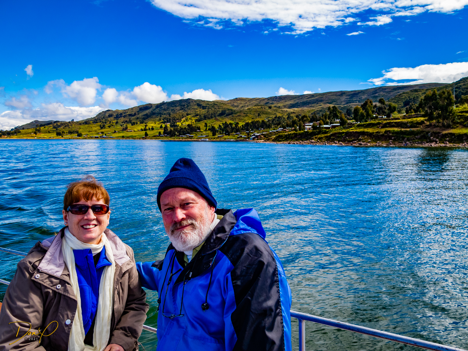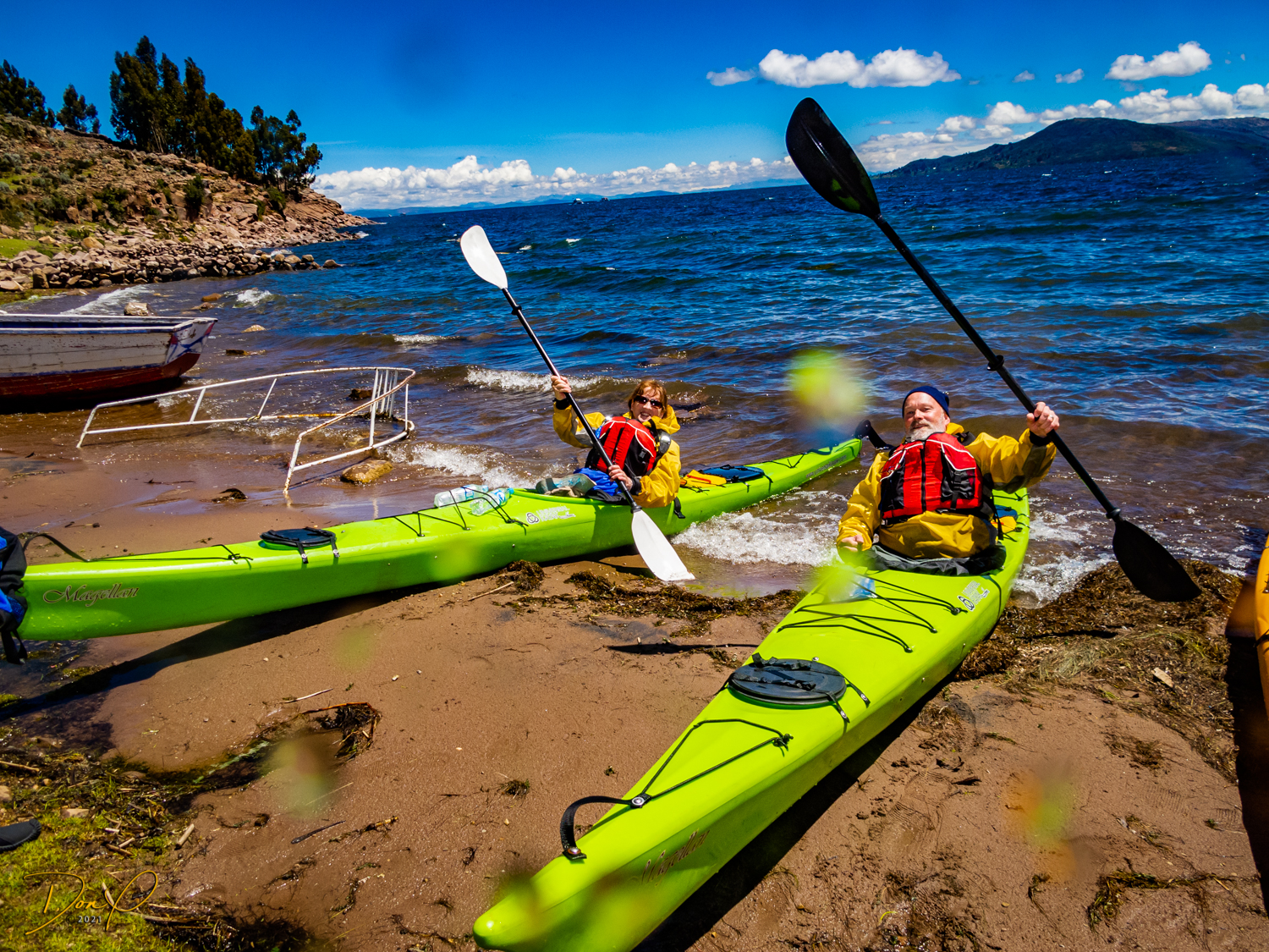 Now would be a good time to call us crazy! We are 59 years old and getting into sea kayaks for a 4 mile journey out to Taquile (pronounced Ta-kee lay) Island! Now add to that idea that the surface of Lake Titicaca is at 12,500 feet above sea level (3810 Meters for our friends around the world) and it is a given that breathing is challenging sitting still on dry land at this altitude! But not to worry! We can DO this! So we get suited up and get in the kayaks and get the sea boots sealed up. I have even put my camera in an underwater case for photos! But the exertion is such that not many photos get taken. My camera sobs with disappointment. Okay, so paddling… And paddling some more. I look back. Wow, we are about halfway as the shore in front and the shore in back look equidistant. But I am exhausted. I can rest here for a bit. Just stop paddling and rest for a few minutes. But I didn’t estimate the size of this lake. Calm waves are 18-24 inches. When you stop, they wash over you. It is severely uncomfortable. Have to paddle on… Is this silly excursion going to be my demise? Why am I thinking stupid thoughts?
