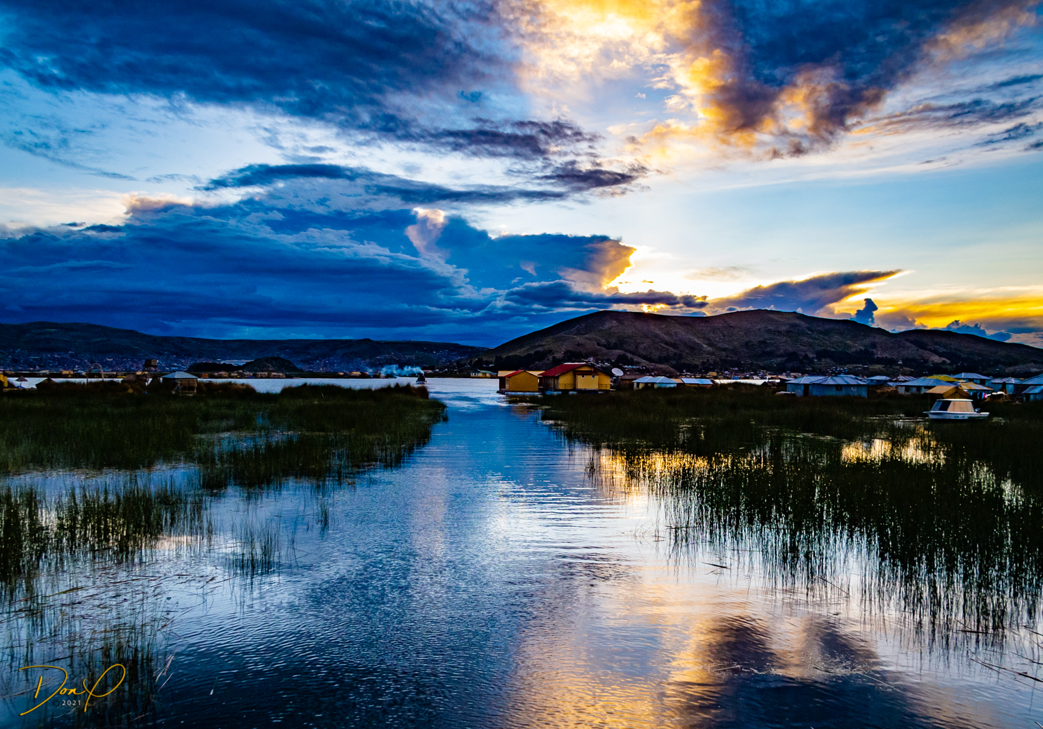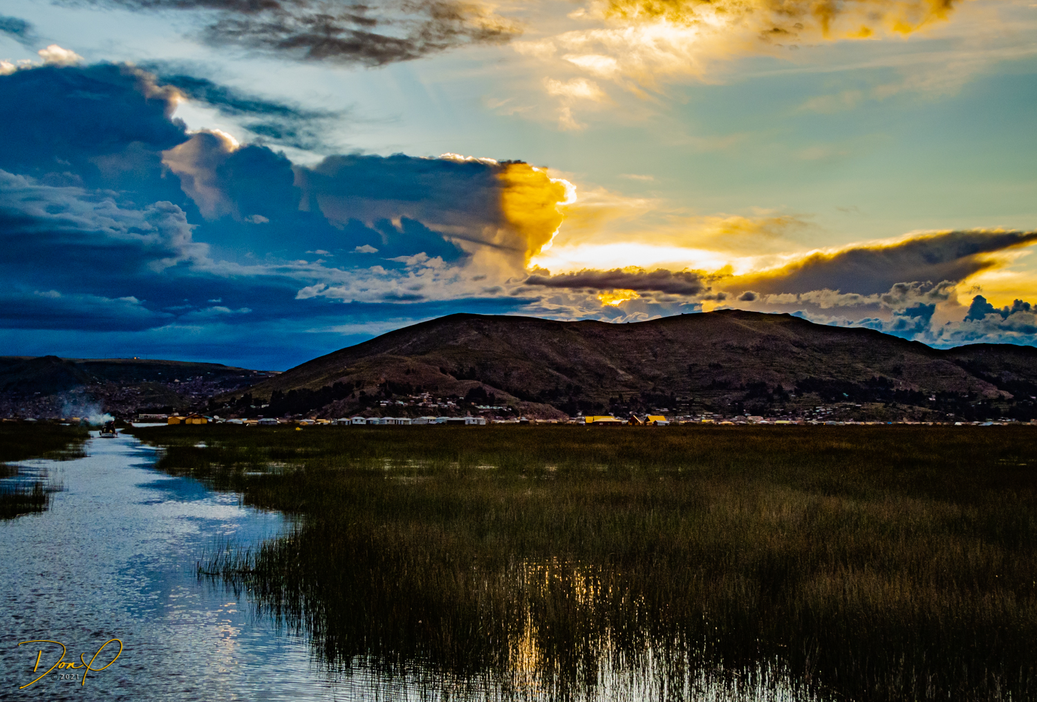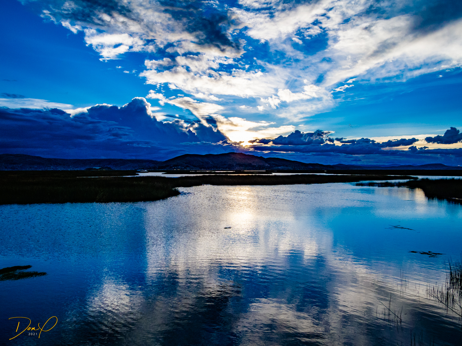 We make it to the Lake and board our 50 passenger boat for the trip back to Puno. we witness sunset as we pass back through the Islands of Uros and it has been a good, yet exhausting day! One of the last sights we see is a cloud shaped like a bear, fun to see!