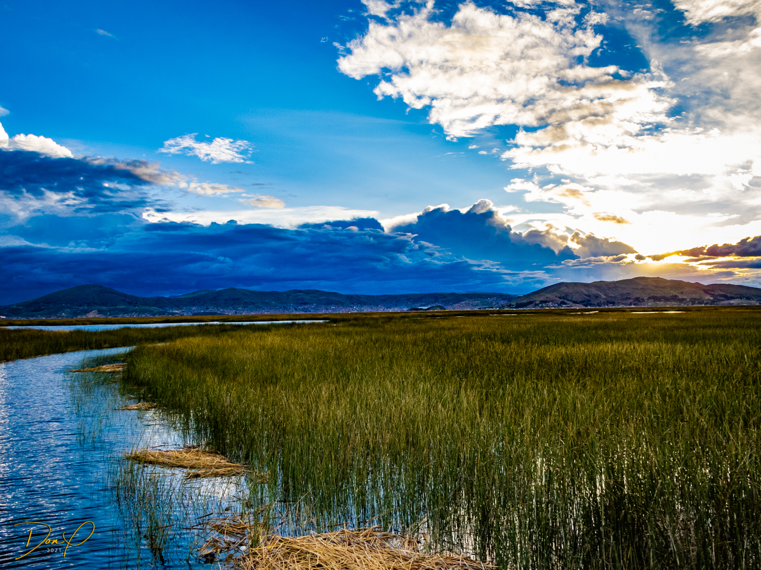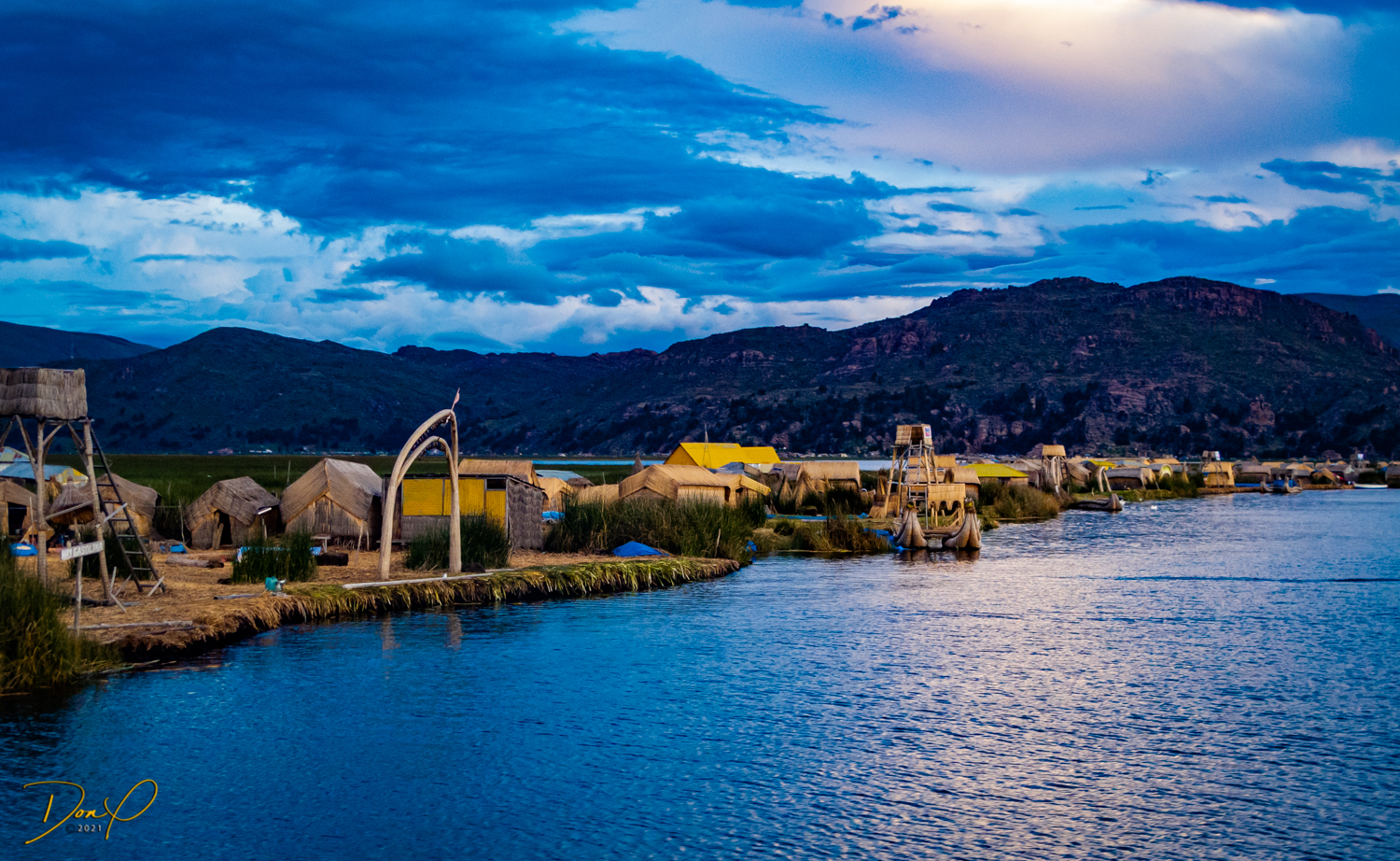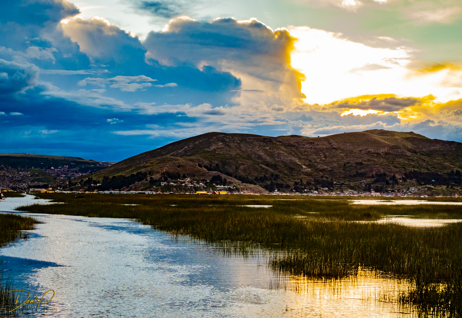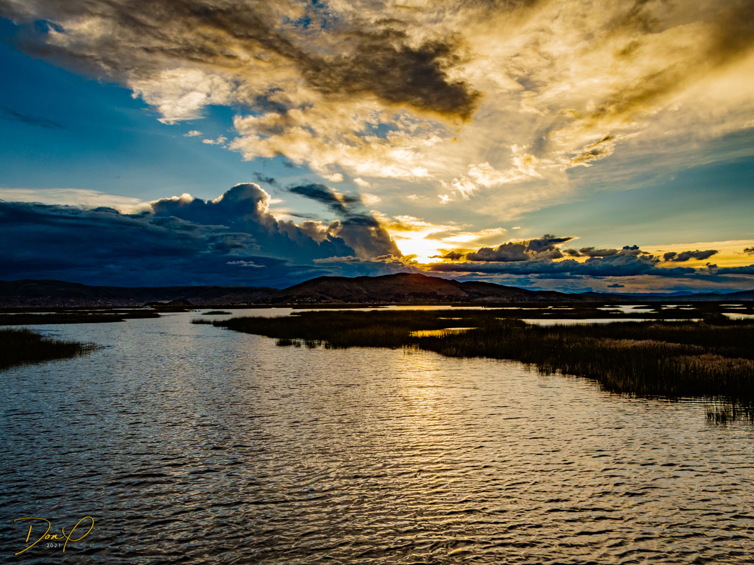 We make it to the Lake and board our 50 passenger boat for the trip back to Puno. we witness sunset as we pass back through the Islands of Uros and it has been a good, yet exhausting day! One of the last sights we see is a cloud shaped like a bear, fun to see!