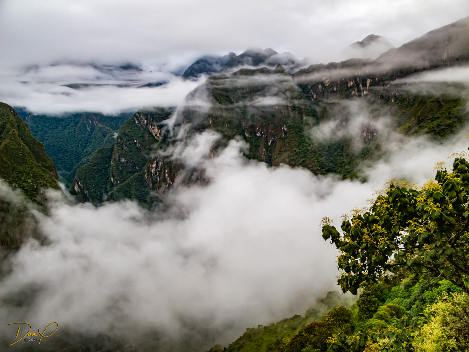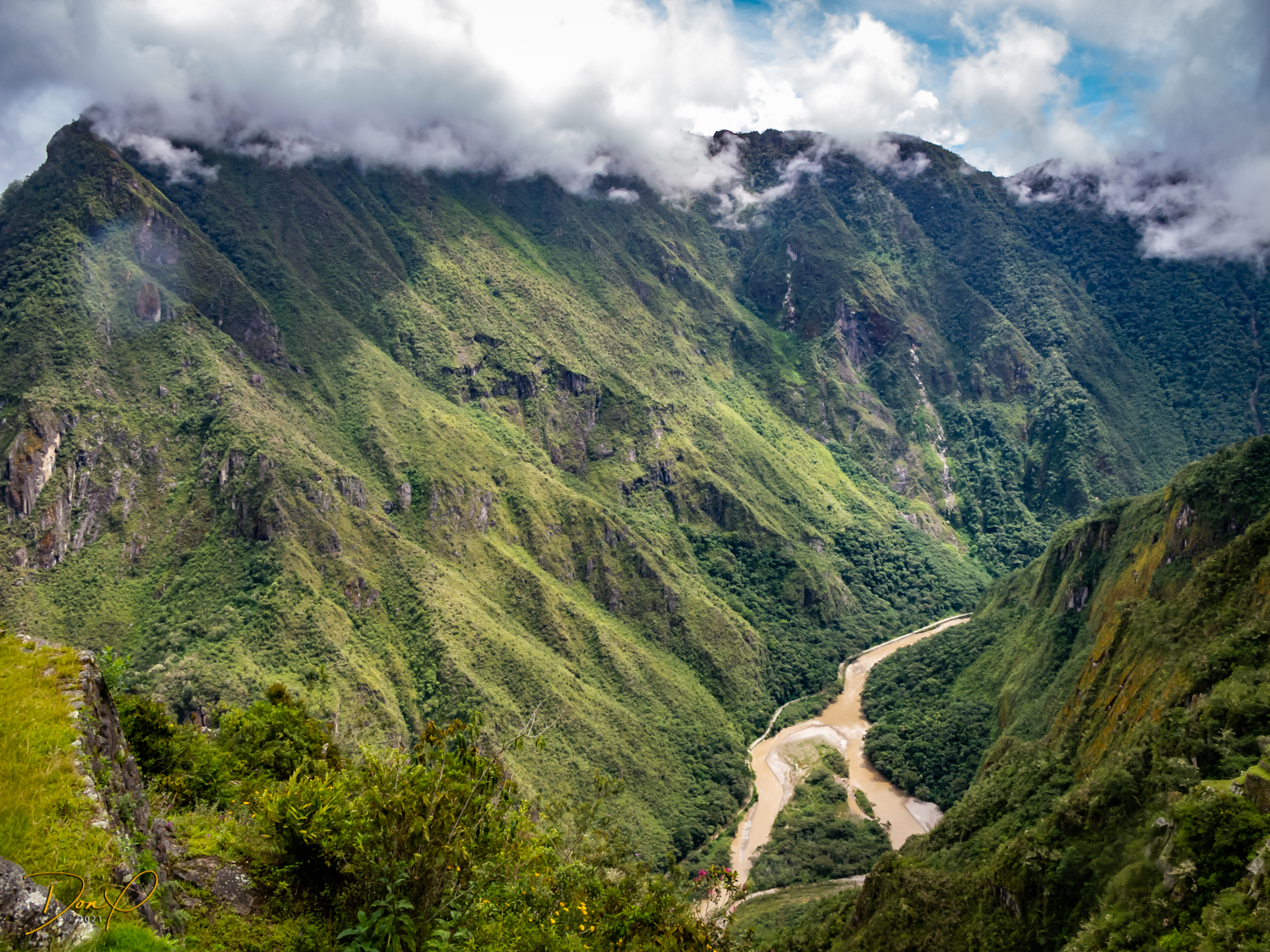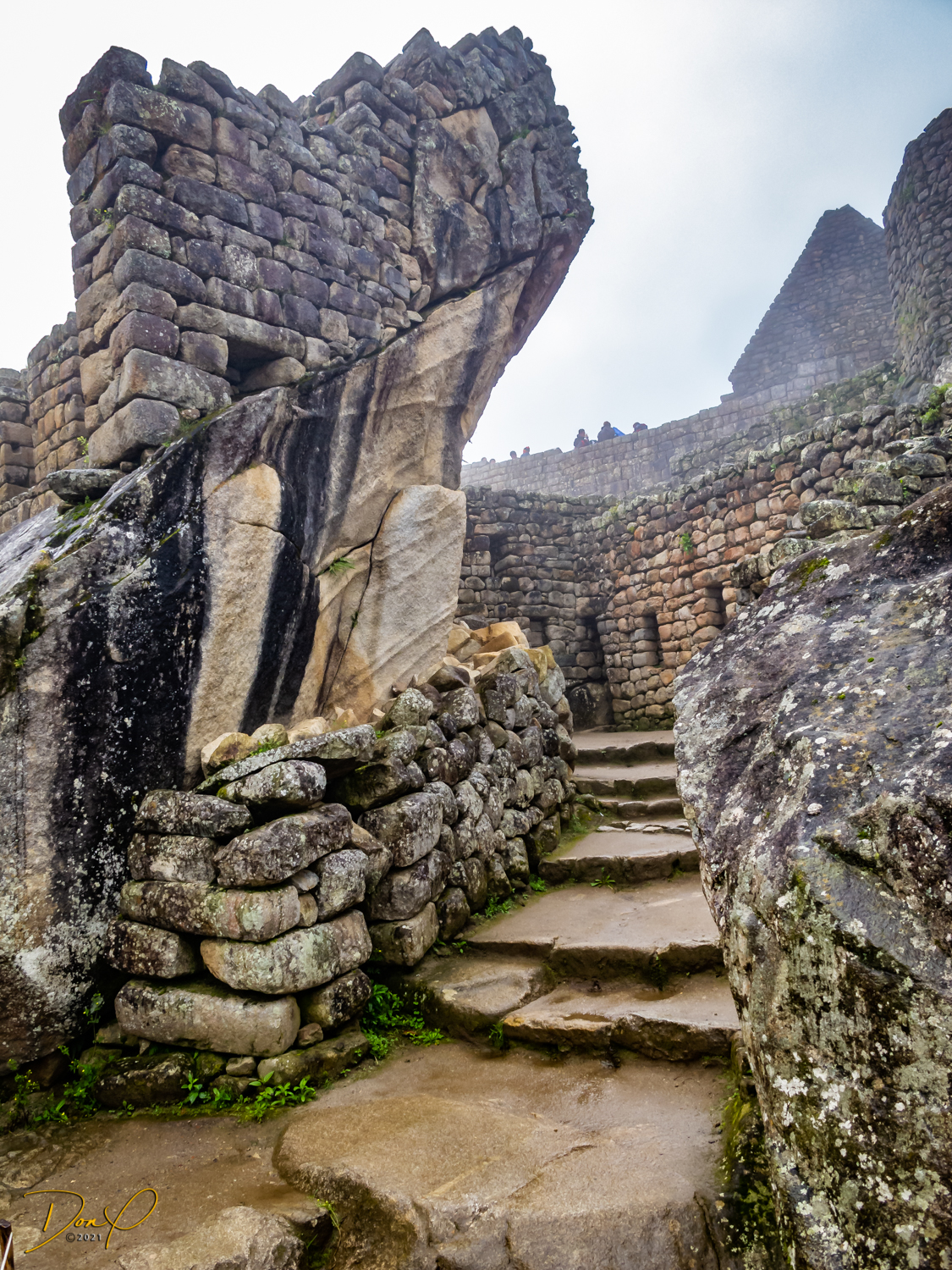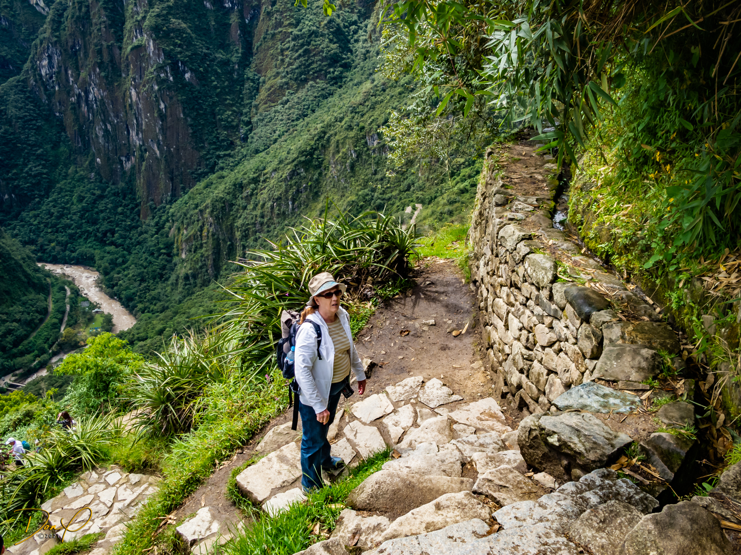 We continue on and the steps prove difficult. The steps vary from 3 inches high to knee height! And add to that the rains of yesterday and before have the trail soaked and nothing has dried up. Elee is having difficulty and tells me to continue on and she will either meet me or see me when I come down. I continue on. Some parts are easy and some parts are extremely steep. Some of the steeper parts have cables on the side to help you pull yourself up. At one point, shortly after a really steep and irregular set of steps, I turn and get a glimpse of Machu Picchu and it is quite the sight!