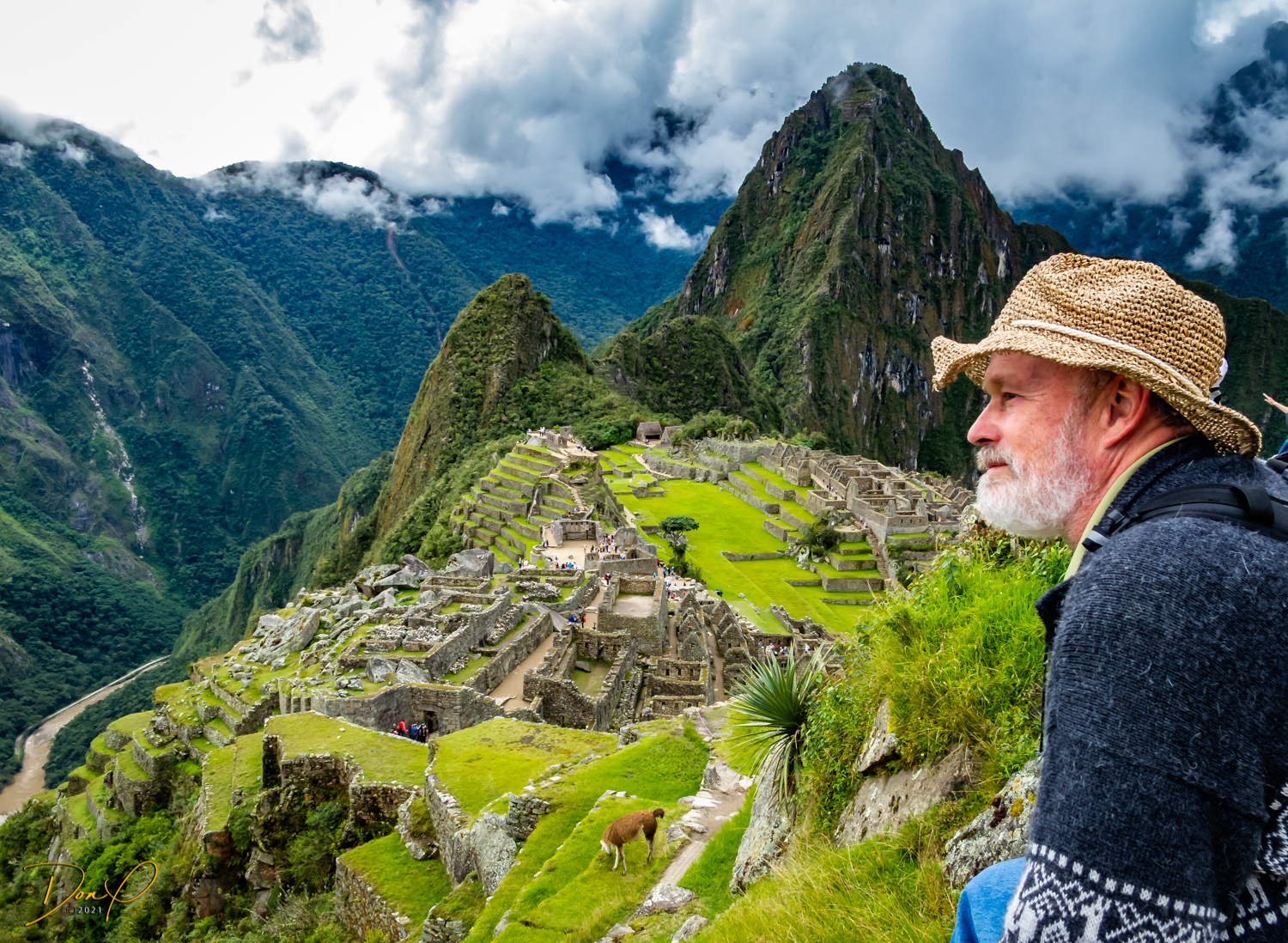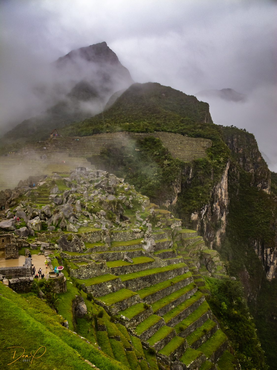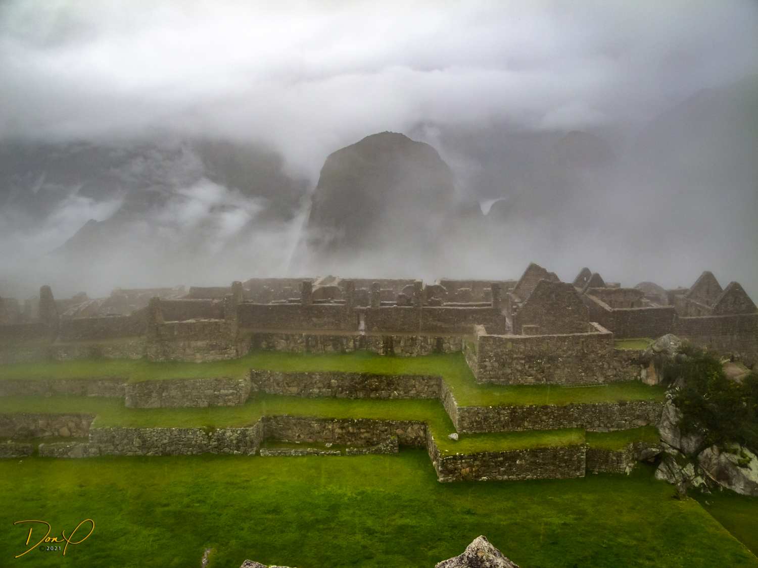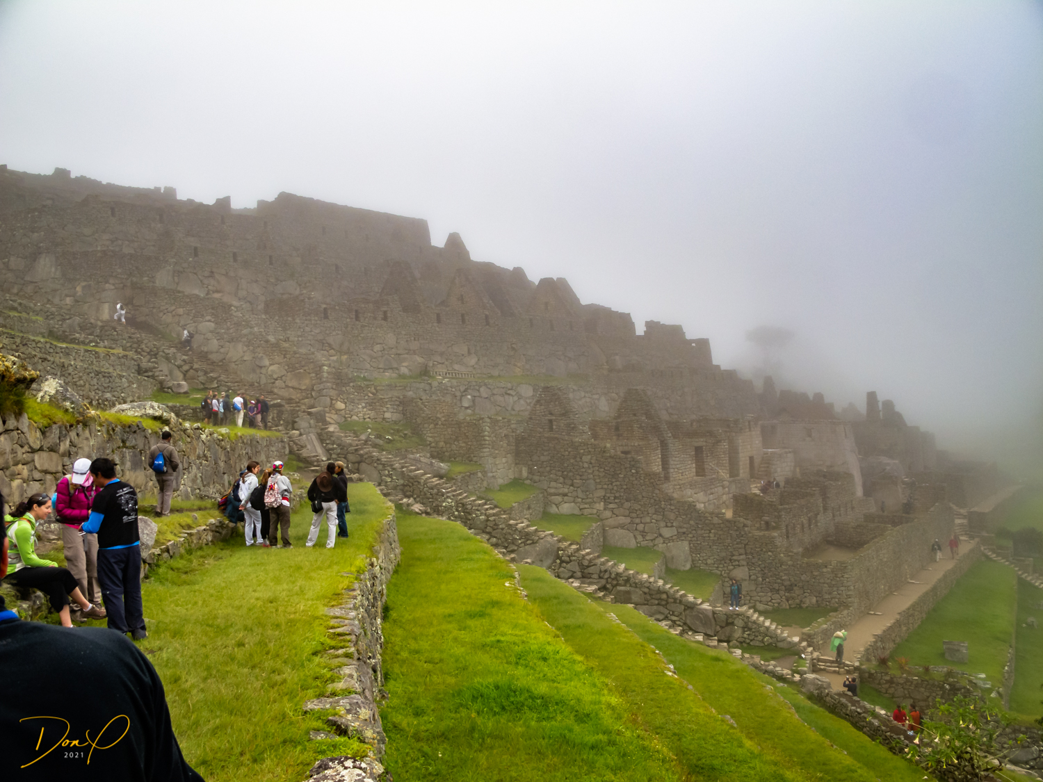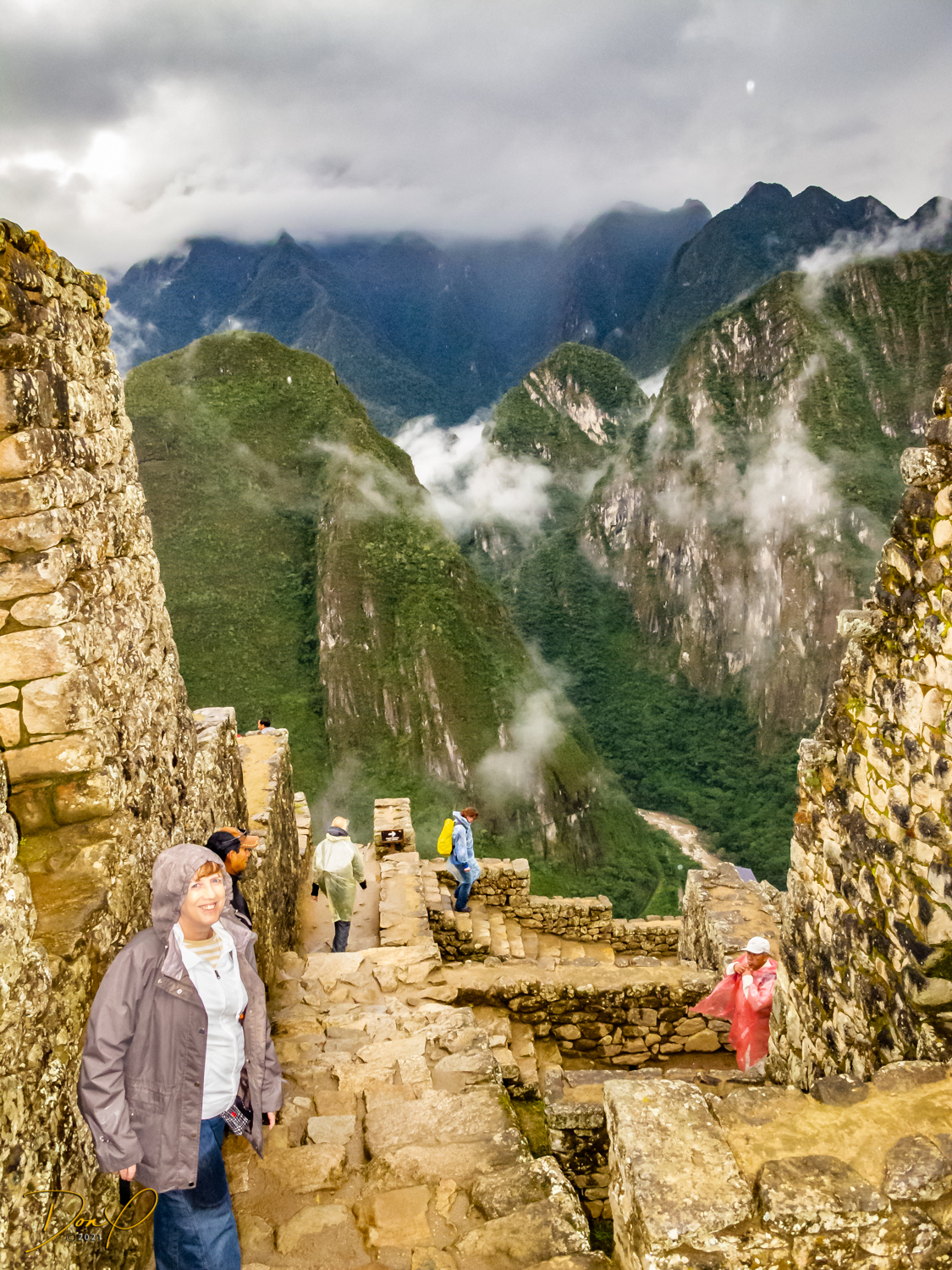 So we get into Machu Picchu about 9 AM, take a few sunlit photos of the place and head for the back where there is a shelter with a roof on it where you wait to enter. Waynu Picchu has two entry times. 10 AM and 2 PM. We have tickets for 10 AM. Only 200 people can enter at each time slot and we had to buy these special passes 6 months ago. They sell out.