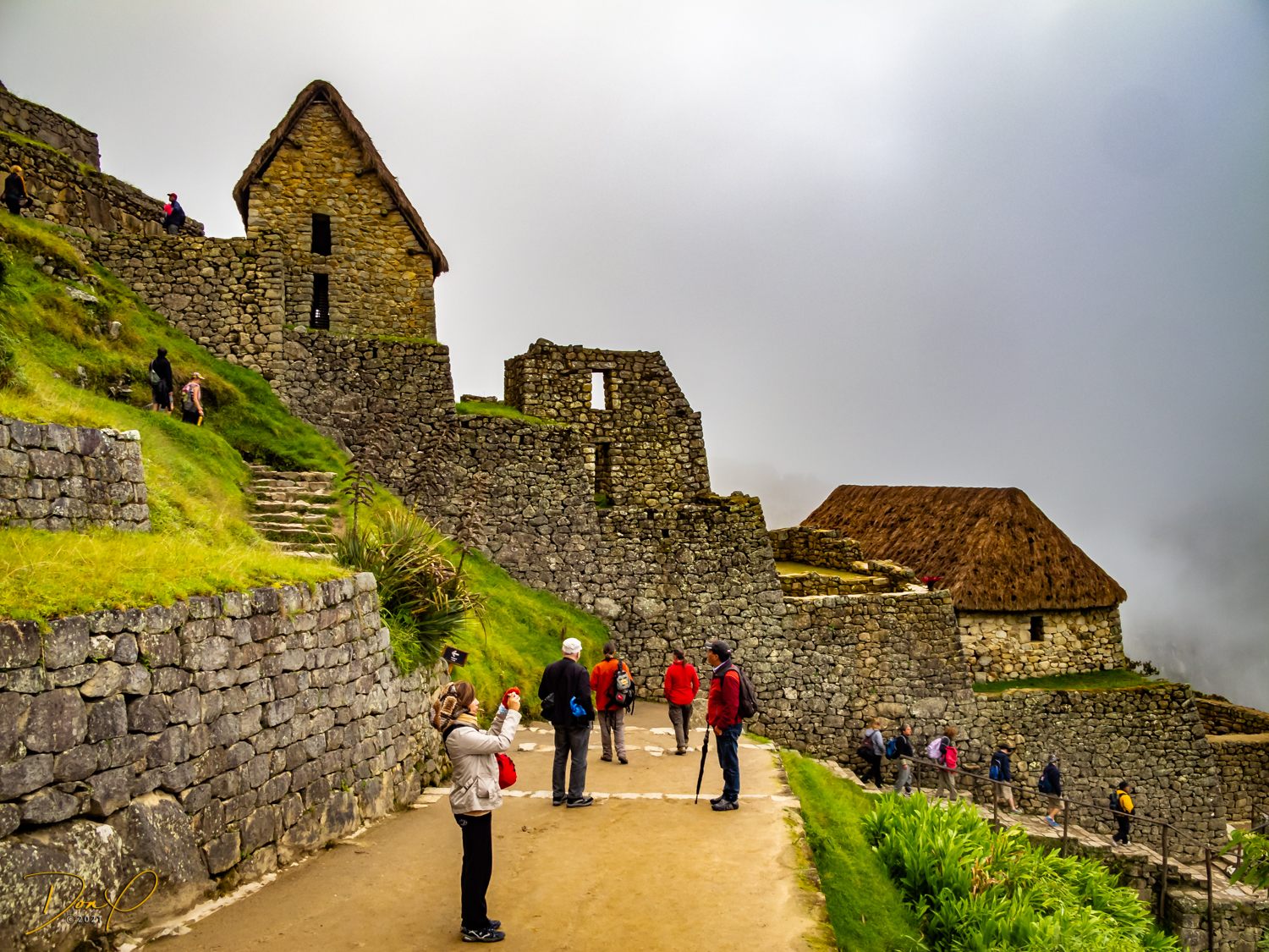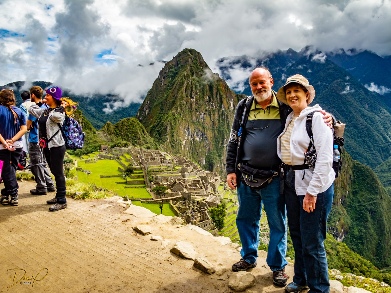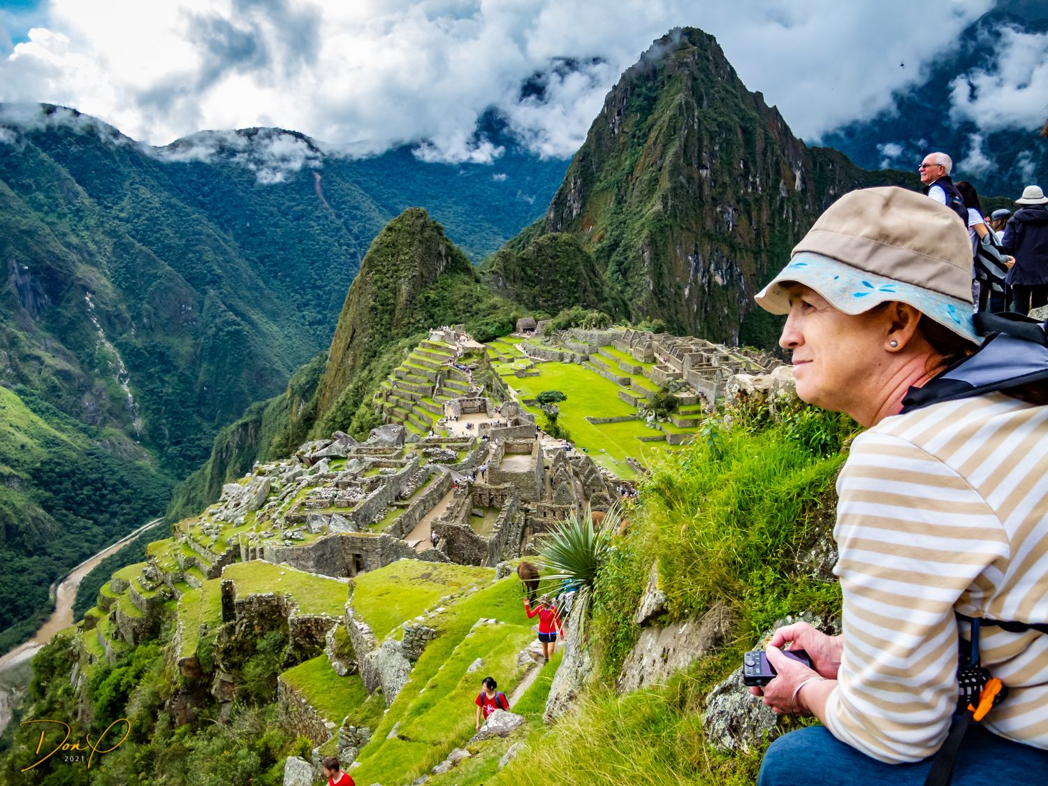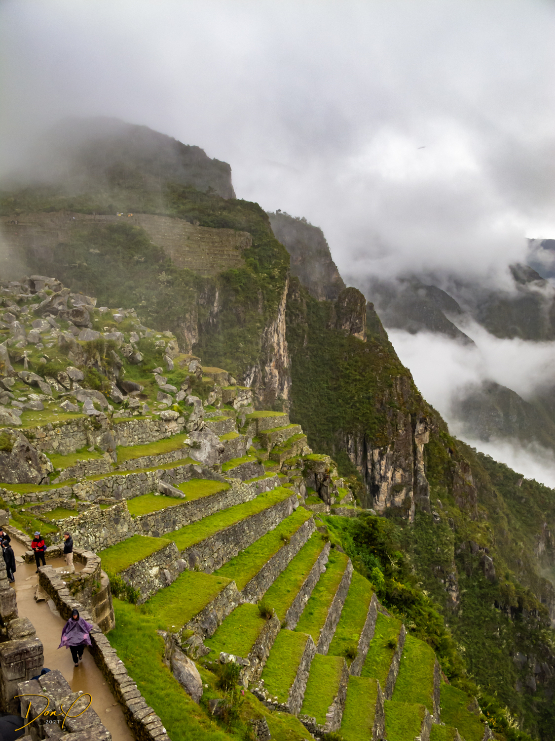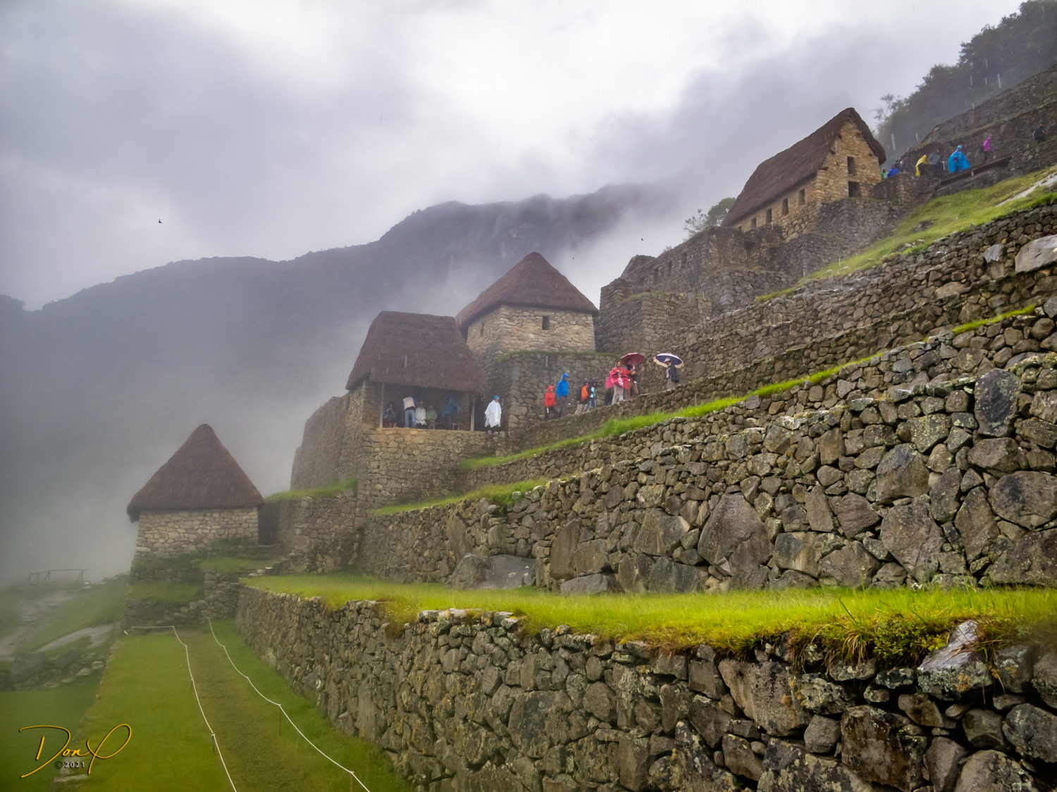 So we get into Machu Picchu about 9 AM, take a few sunlit photos of the place and head for the back where there is a shelter with a roof on it where you wait to enter. Waynu Picchu has two entry times. 10 AM and 2 PM. We have tickets for 10 AM. Only 200 people can enter at each time slot and we had to buy these special passes 6 months ago. They sell out.