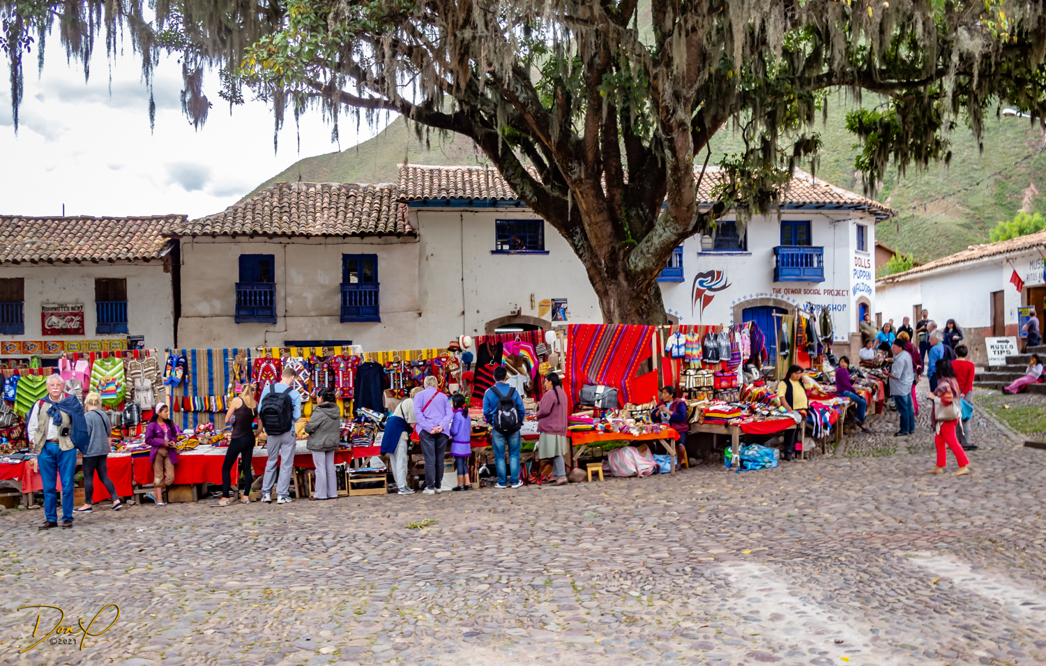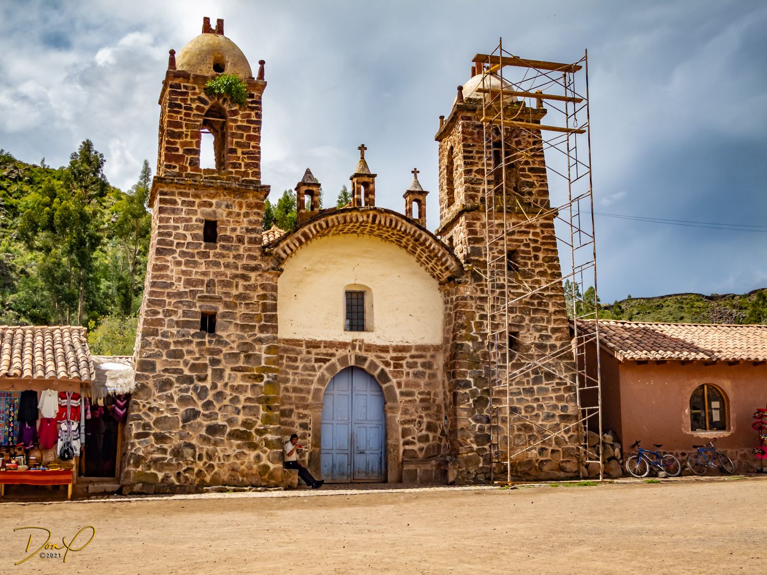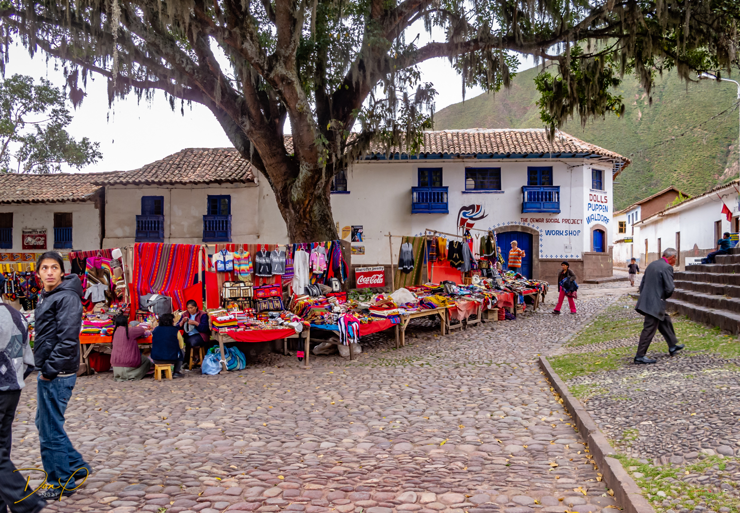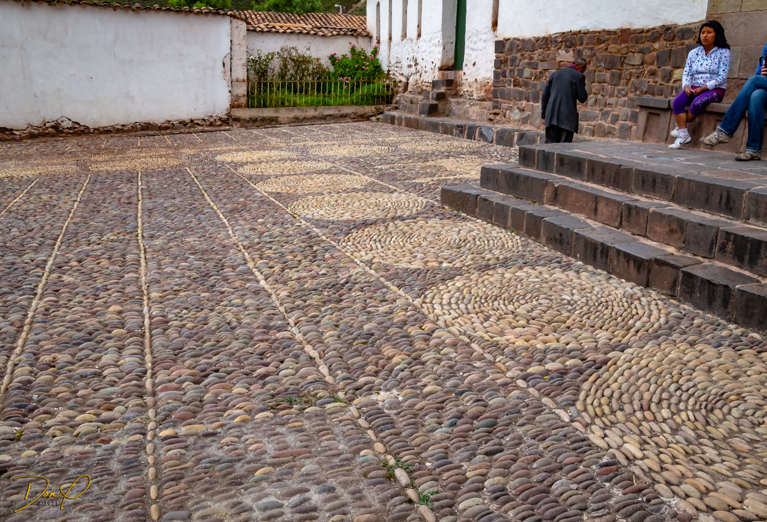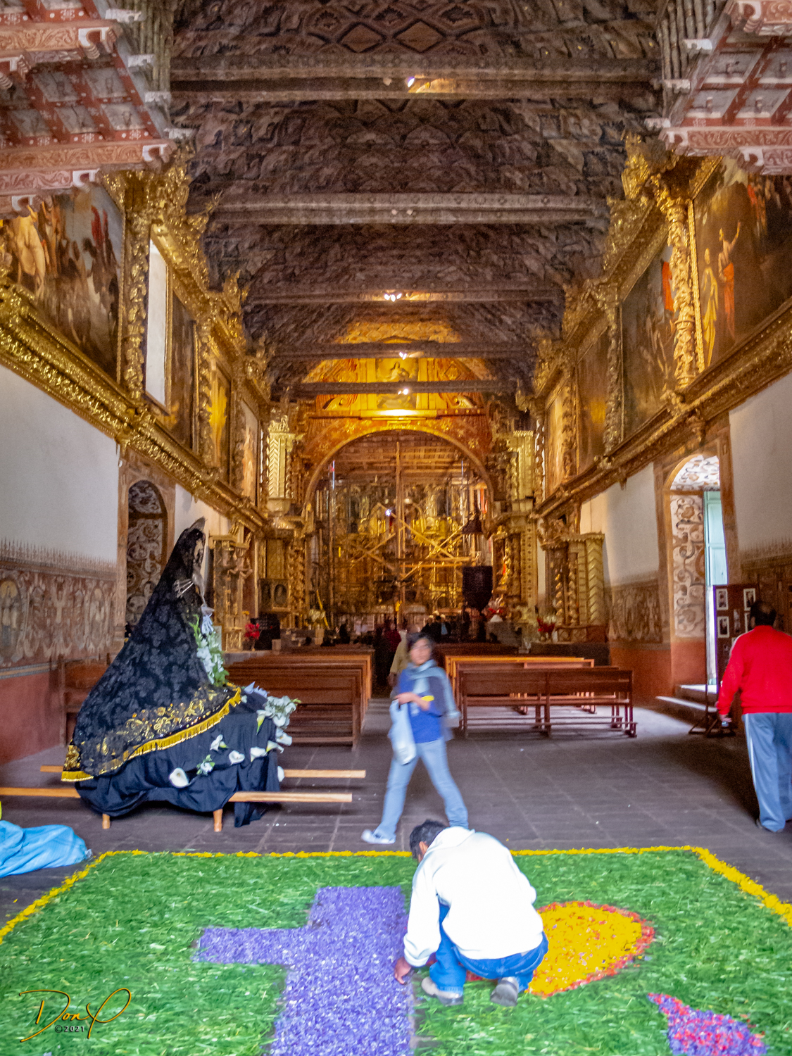 Our bus drives on to Cajamarca where we stop and visit another small town and the Virgen Dolorosa church that is decorating for Easter. The detailed stone plaza has been intrinsically laid. Colorful vendors again line the street displaying their wares. Carved stone figurines of Dolorosa line the street outside the church.