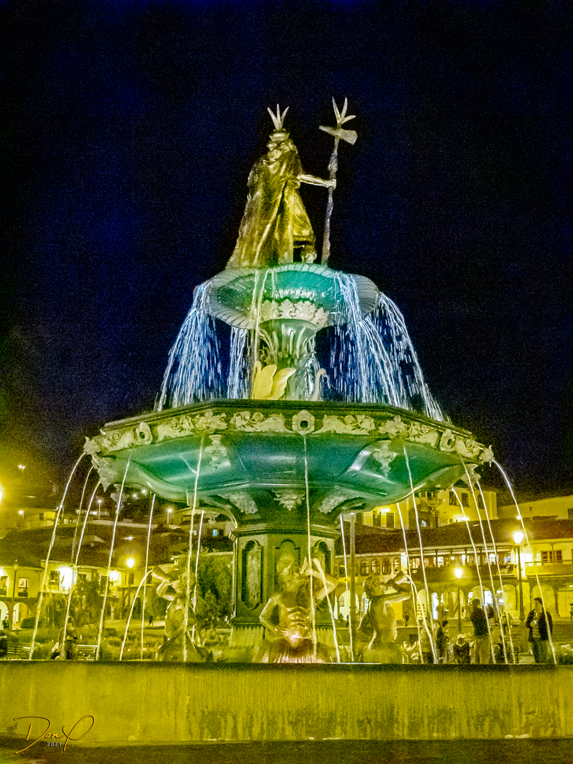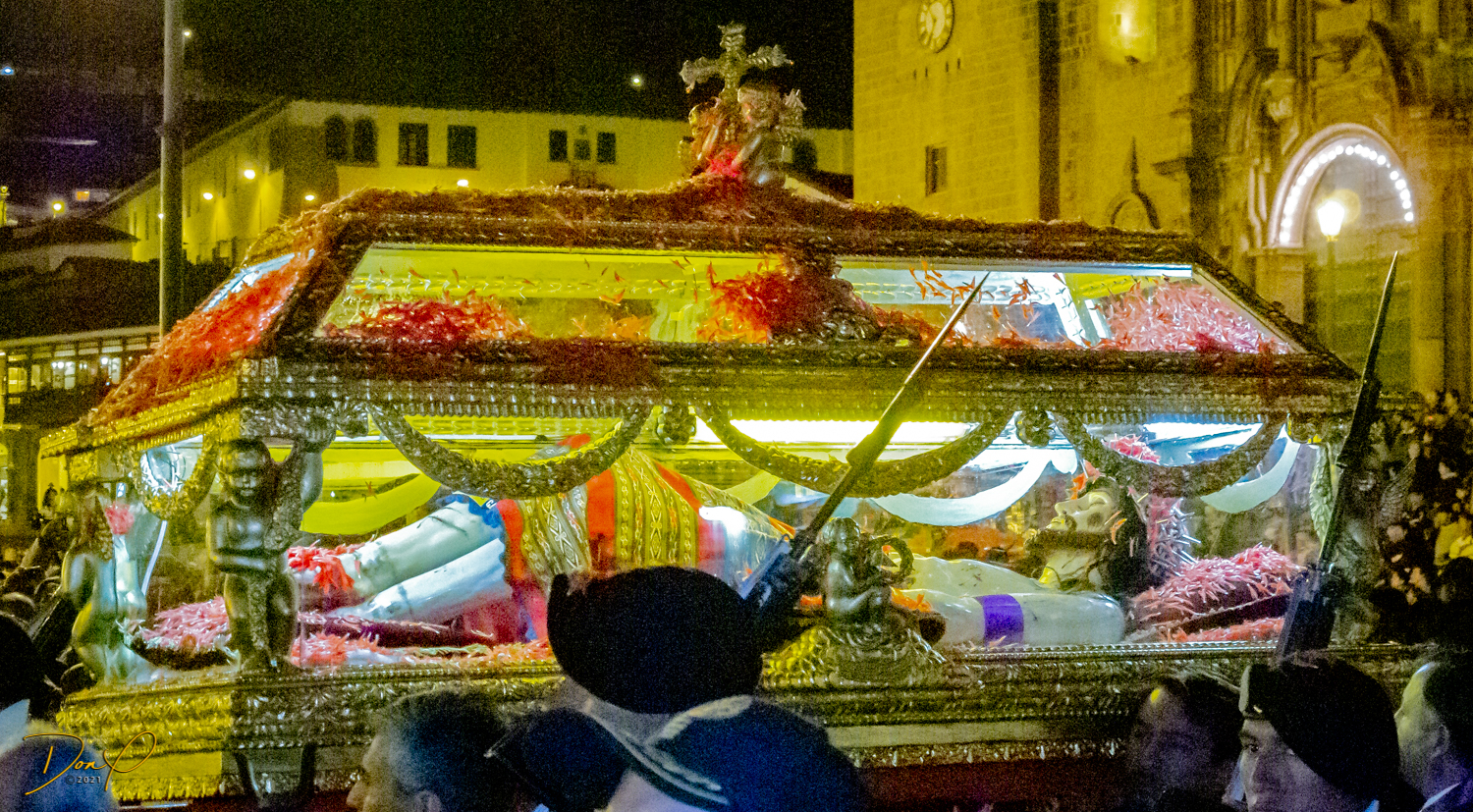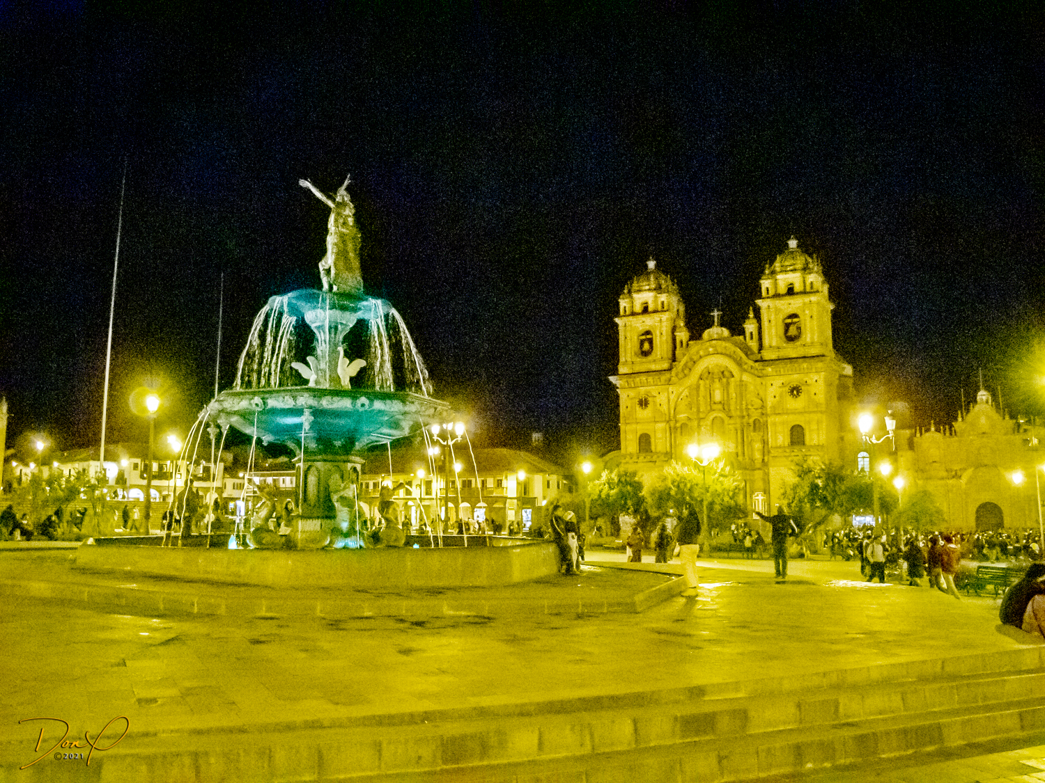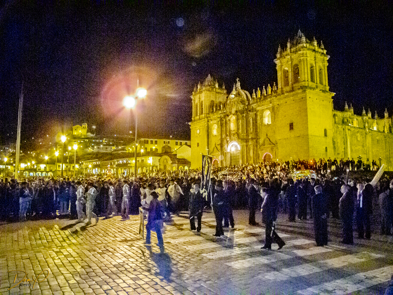 We check in to our clean and comfortable room and leave the hotel in search of food. We walk the 3 blocks to the main square past pretty fountains and come across throngs of worshipers celebrating “Semana Santa”, a mix of Catholicism and Inca traditions. No sooner has the procession passed and the thousands of revelers are gone and the square is empty. So a few night photos are added to my collection.