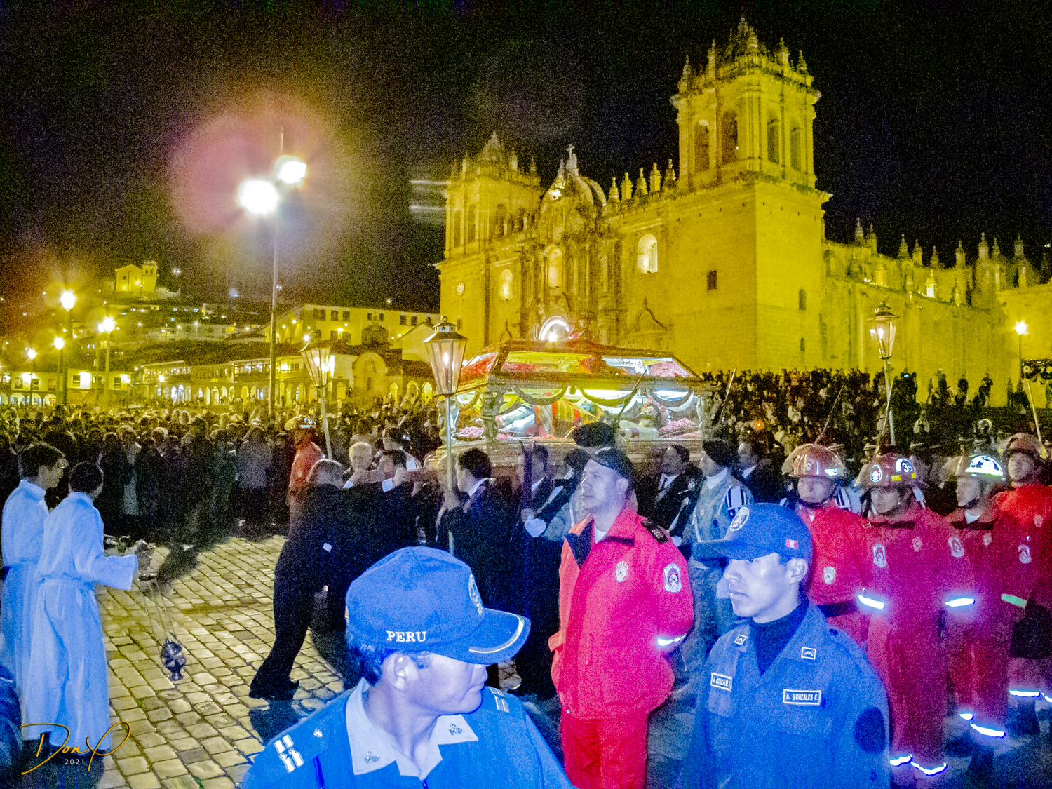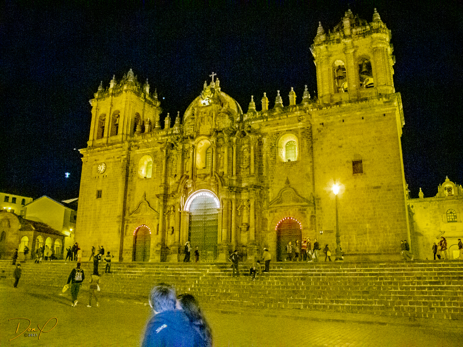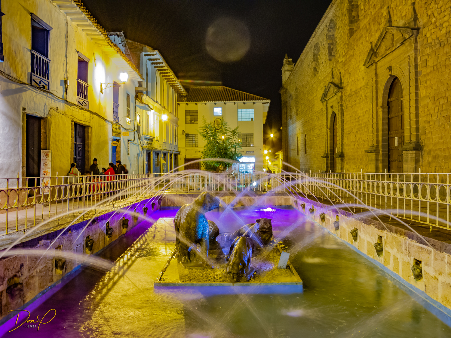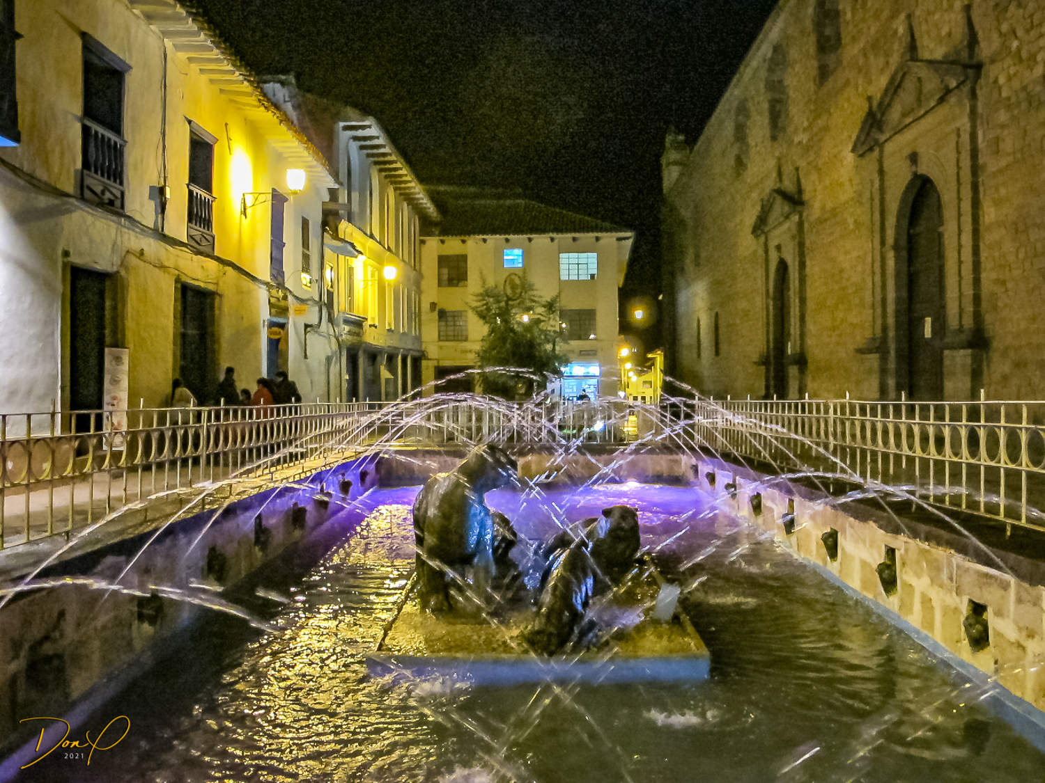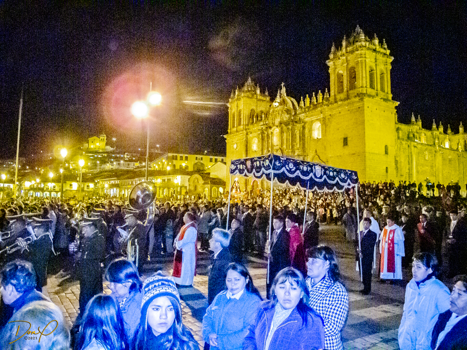 We check in to our clean and comfortable room and leave the hotel in search of food. We walk the 3 blocks to the main square past pretty fountains and come across throngs of worshipers celebrating “Semana Santa”, a mix of Catholicism and Inca traditions. No sooner has the procession passed and the thousands of revelers are gone and the square is empty. So a few night photos are added to my collection.