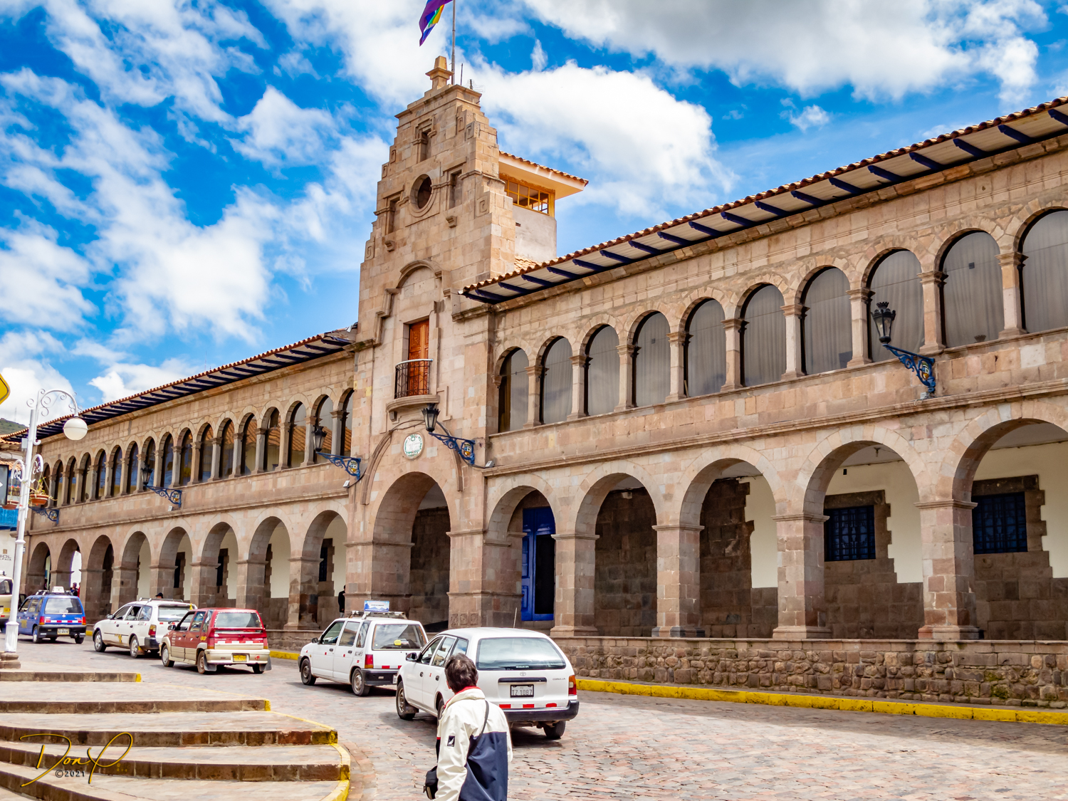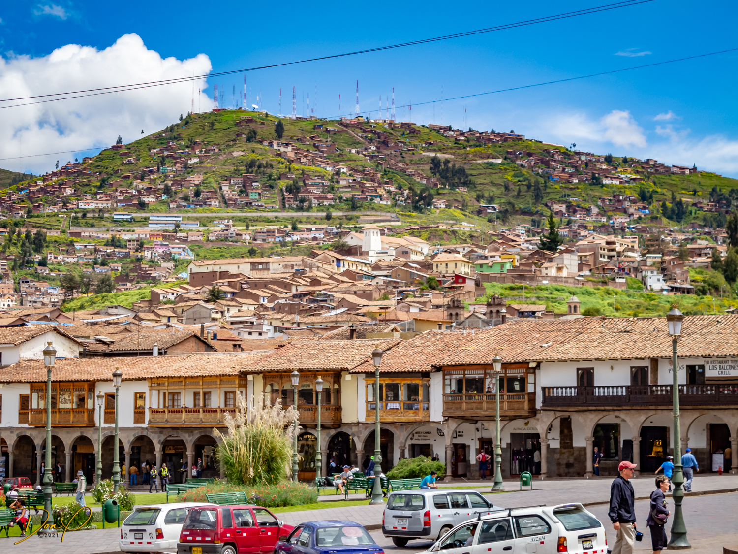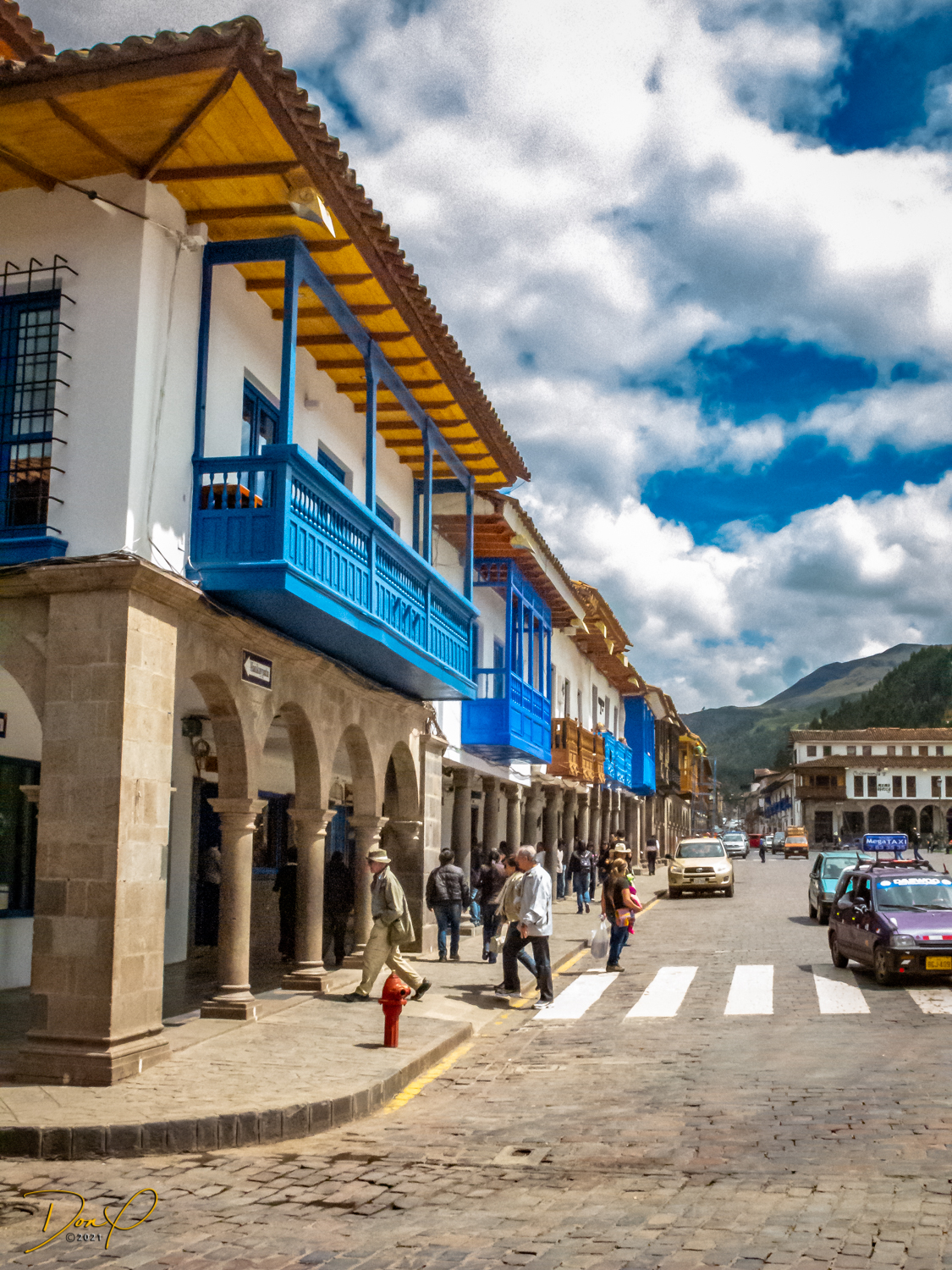 We have the morning to ourselves today as our excursion doesn’t start until the afternoon. So we actually get an extra hour of sleep before we partake of a complimentary fruit breakfast in the hotel. The city of Cusco is just over 11,000 feet (3400 meters) above sea level and we are getting very well acclimatized to the altitude. We stroll into the city square and you’d never know there were thousands of revelers here last night. One thing we see in all places we visit here are balconies. They are commonly painted bright colors that rarely match the attached building.