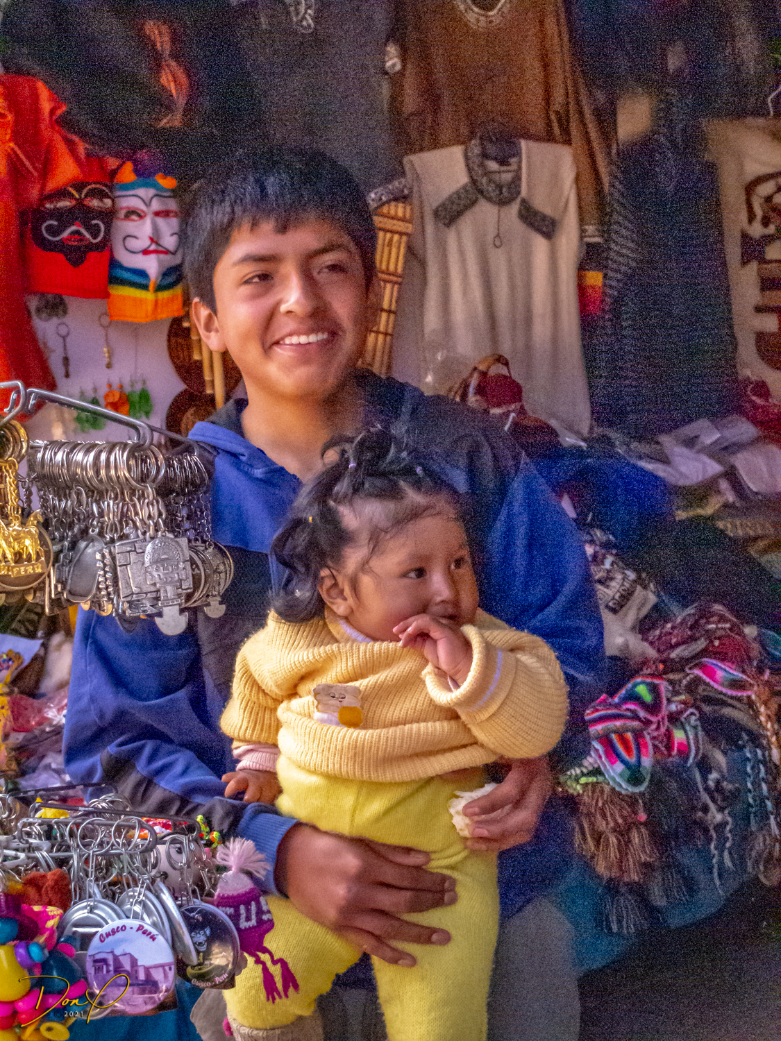 Today begins bright and early even though it is holiday. Our bus first takes us toward Pisaq in the “Sacred Valley of the Incas”. An appropriate place to spend Easter Sunday! Our first stop is at a roadside stand to help support the local economy. Here, a young boy proudly shows us his little sister. We then go to Mirador Taray, an overlook of the Valley, where we get some stunning vistas and our cameras are in their element. We then go through a security checkpoint when we arrive in Pisaq.