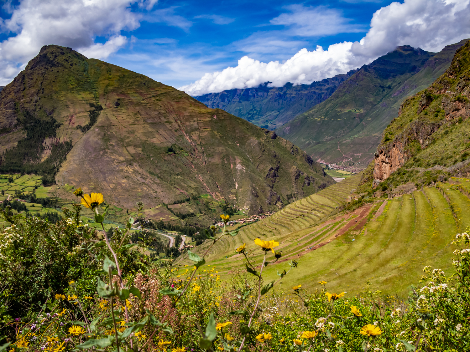We first come to Pisaq Archaeological Park and check out this hilltop Incan citadel with ancient temples, plazas and the Intihuatana, a stone structure thought to have been a sundial. Here we witness the elaborate terracing of the Inca.