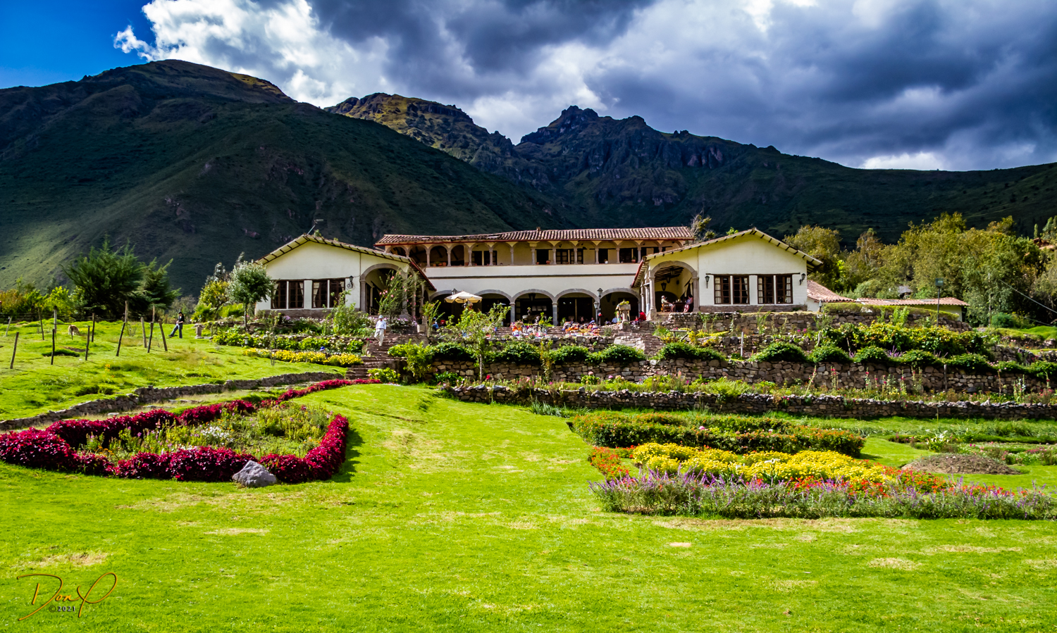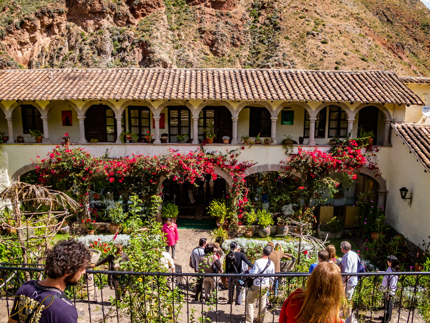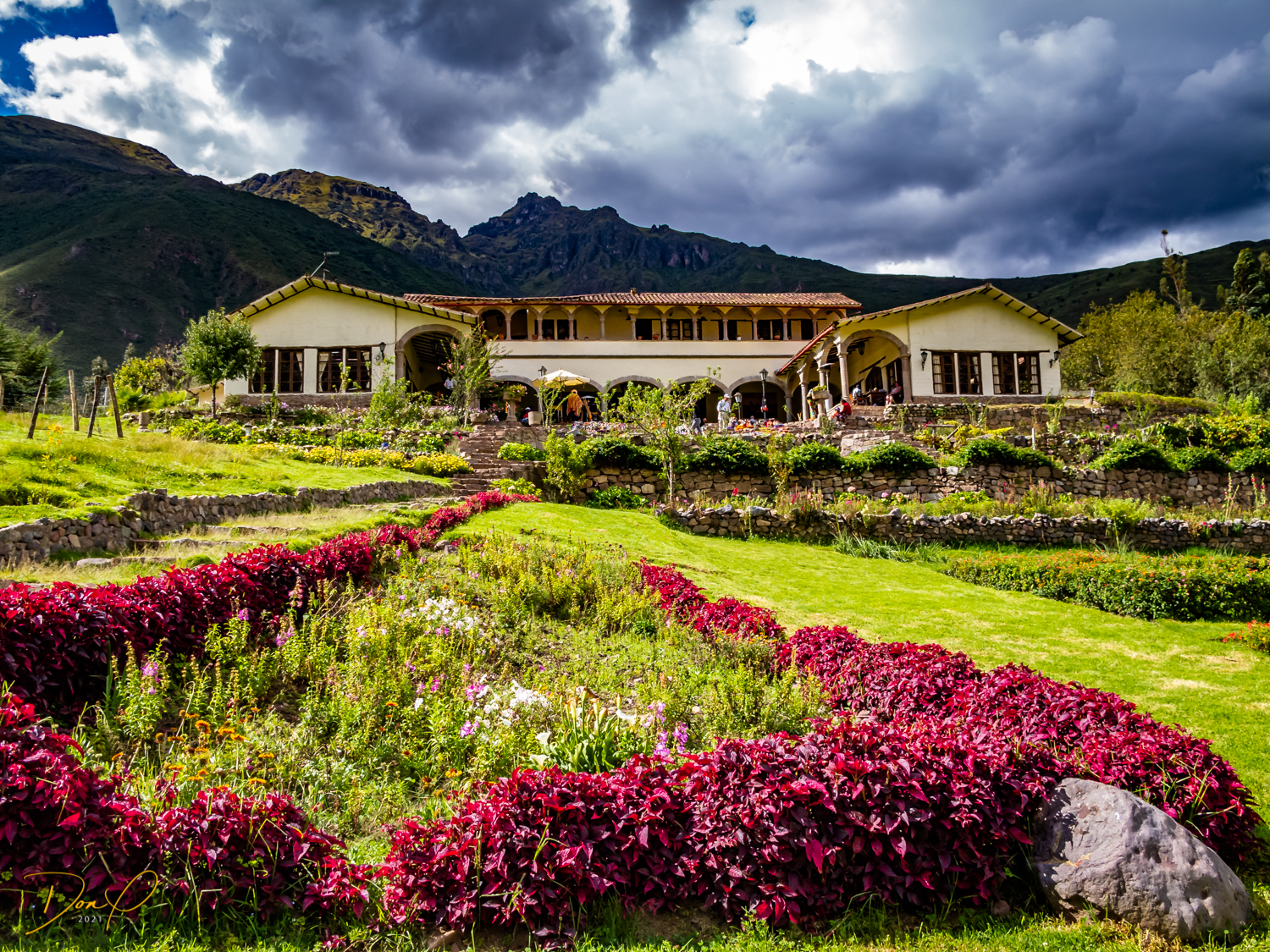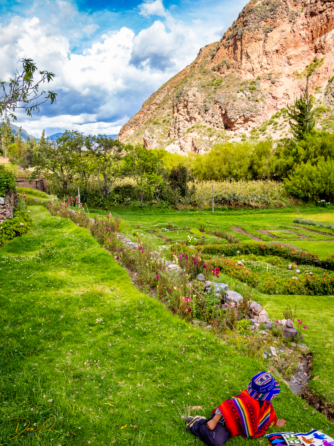 Now it is time for lunch and we are taken to “Arco Iris Del Puente Lodge” restaurant for a buffet lunch in the town of Urubamba. We are early for our seating reservation so we get to walk around the grounds for some scenic shots of colorful gardens and even a couple pet Vicunas. A young boy lounges in the grass. When we are called to be seated, we go in and a massive spread of food has been laid out on the buffet and we sit with our bus mates and eat to our hearts delight!
