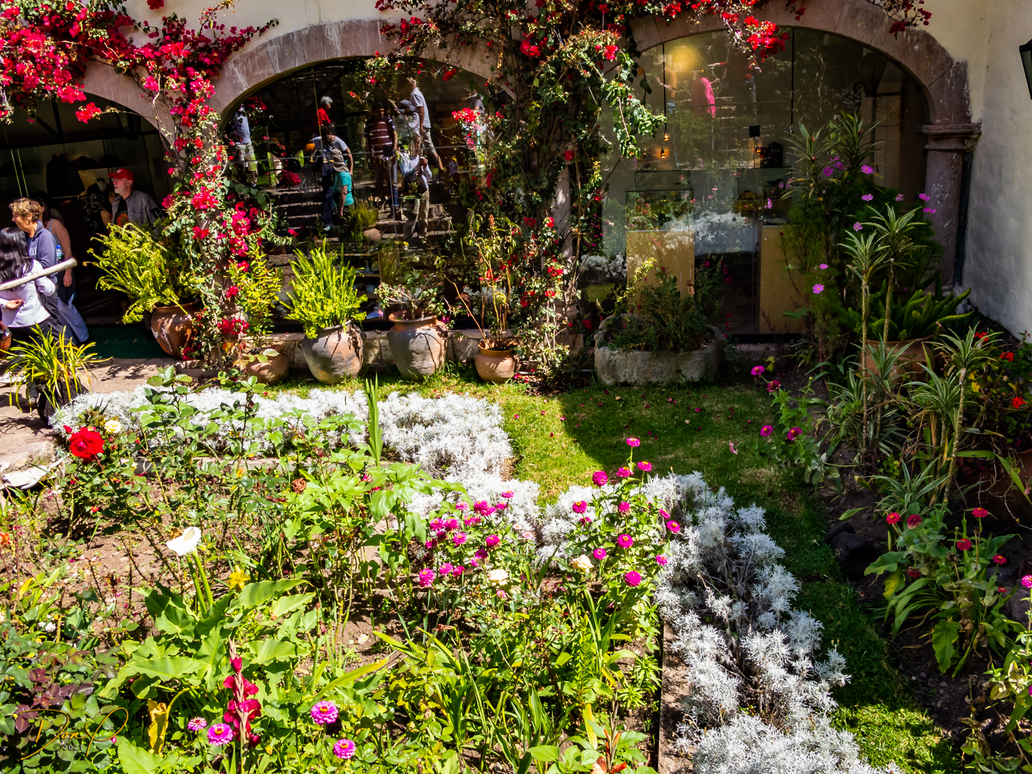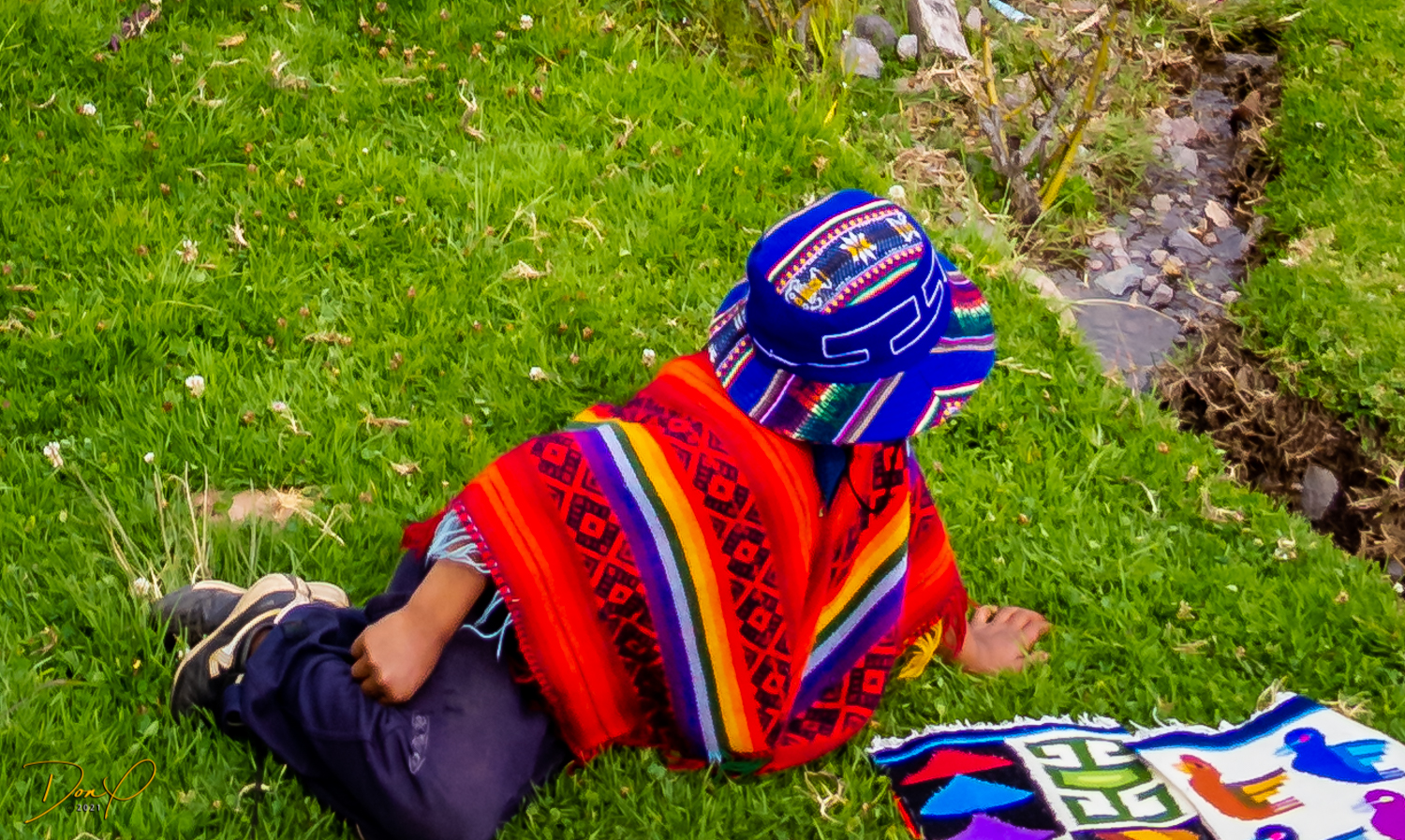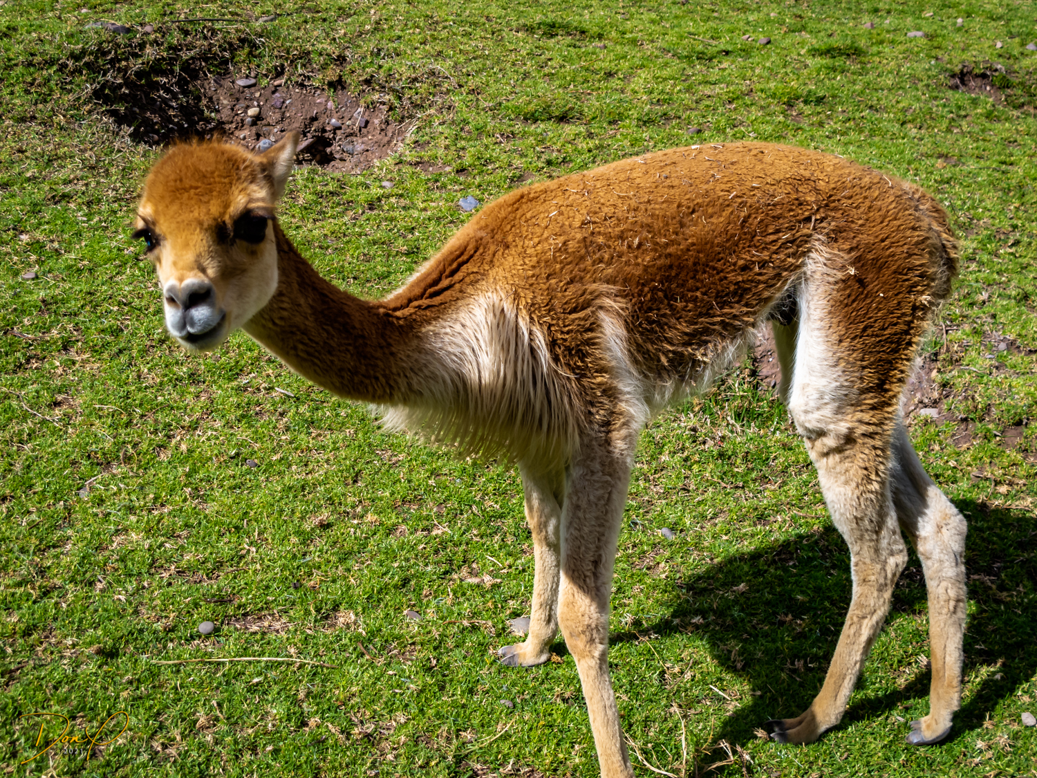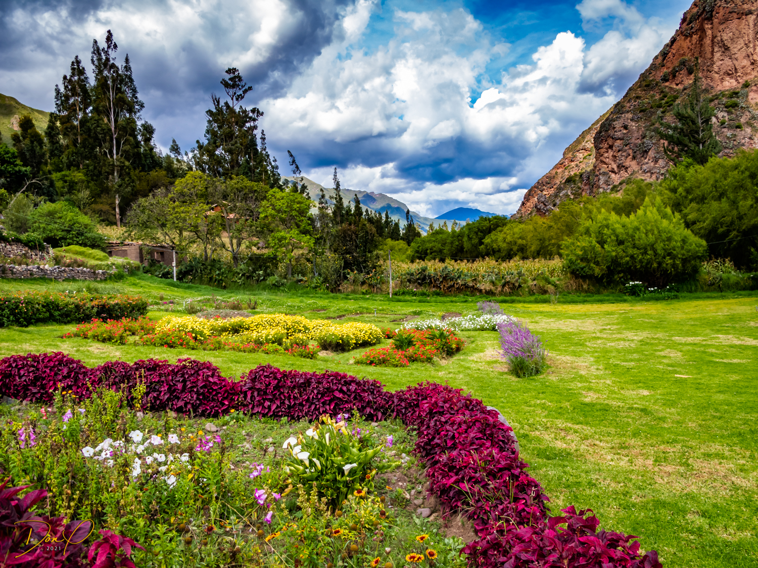 Now it is time for lunch and we are taken to “Arco Iris Del Puente Lodge” restaurant for a buffet lunch in the town of Urubamba. We are early for our seating reservation so we get to walk around the grounds for some scenic shots of colorful gardens and even a couple pet Vicunas. A young boy lounges in the grass. When we are called to be seated, we go in and a massive spread of food has been laid out on the buffet and we sit with our bus mates and eat to our hearts delight!