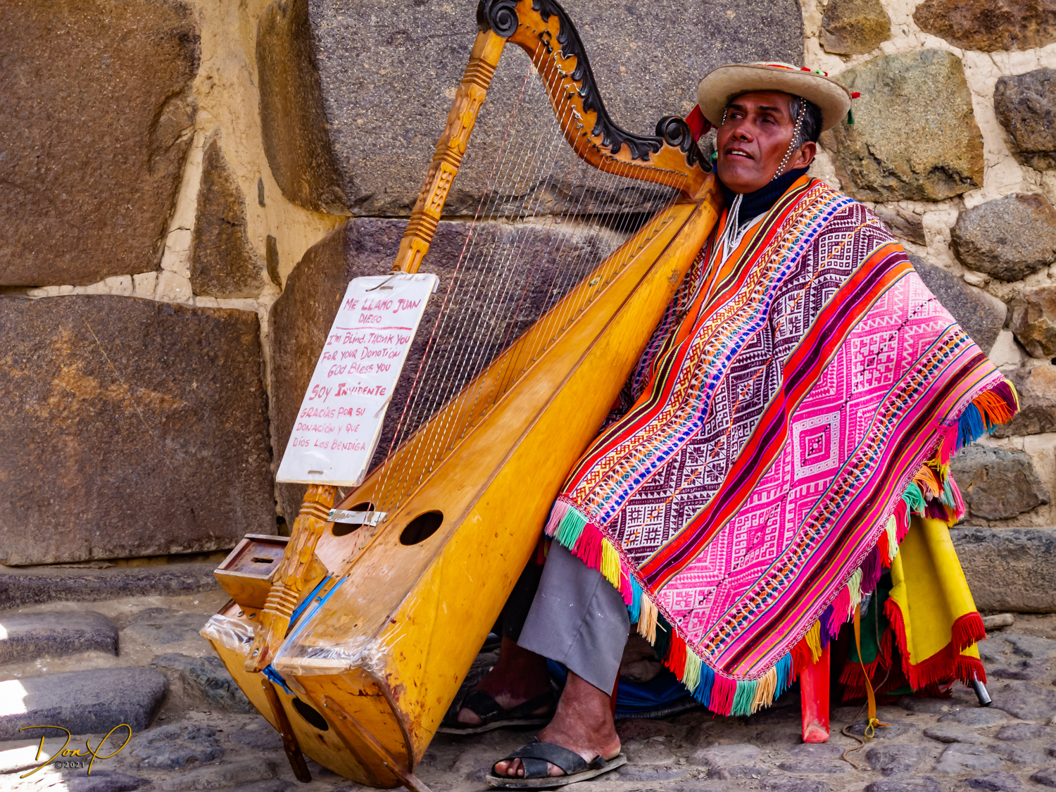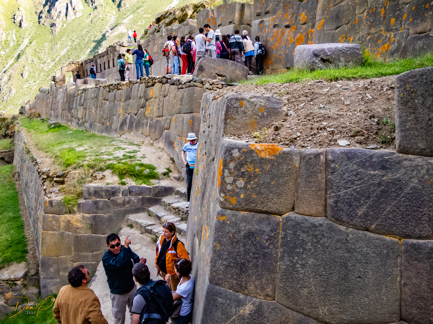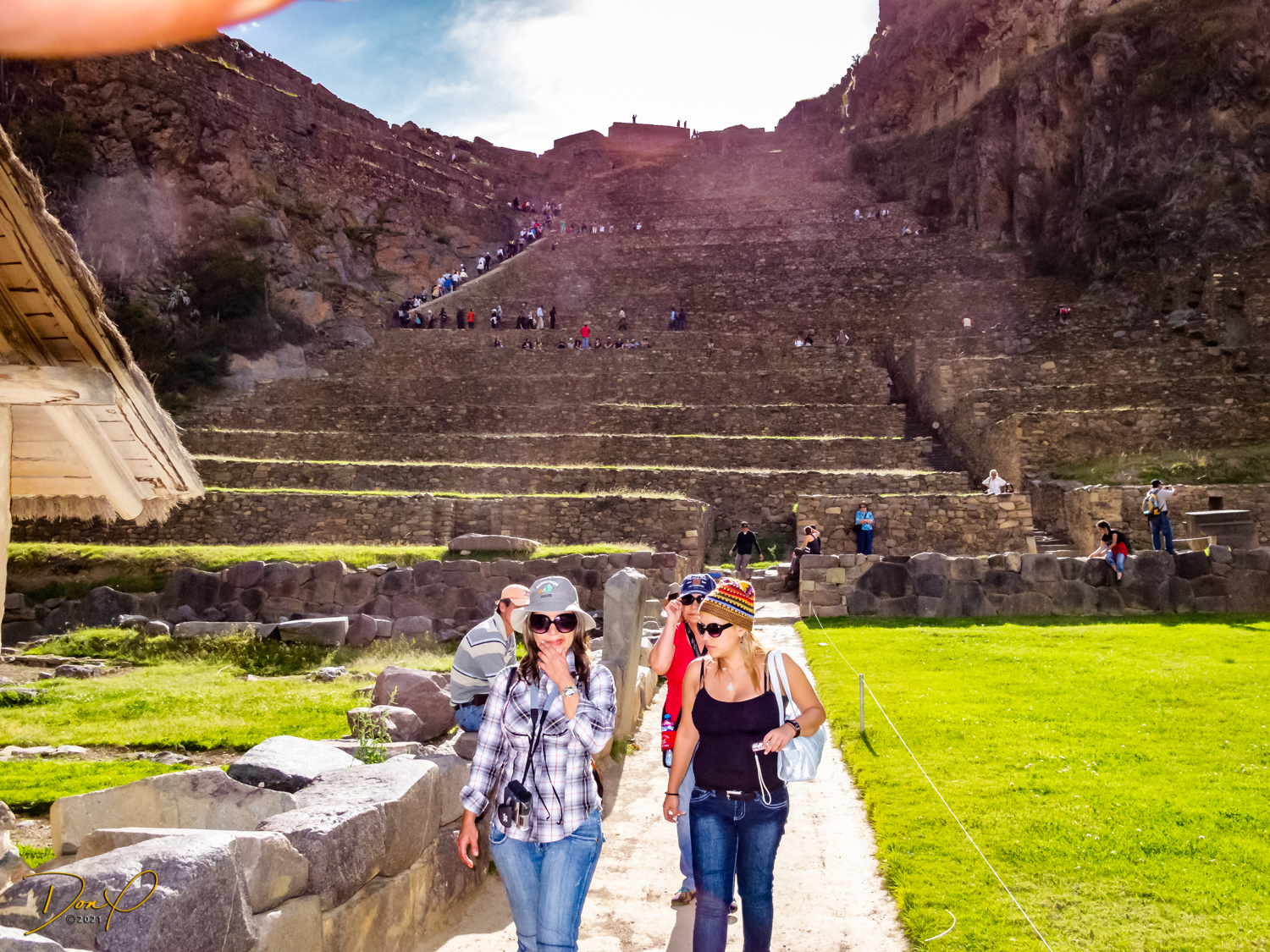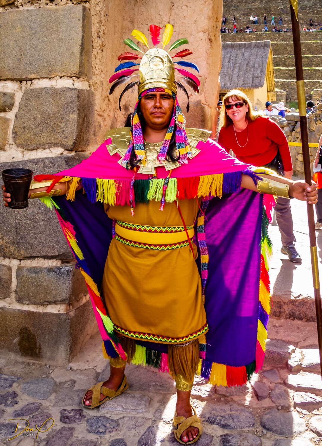 Shortly we arrive in Ollantaytambo. Ollantaytambo is a village in the Sacred Valley of the Incas, located on the Urubamba River and surrounded by snow-capped mountains. It’s known for its ruins, a massive Inca fortress with large stone terraces built on a hillside. Attractions include the Sun Temple and the Princess Baths fountain. We are greeted at the entrance by an Inca King or at least he appears to be! Somebody I know has decided to photo-bomb the photo!