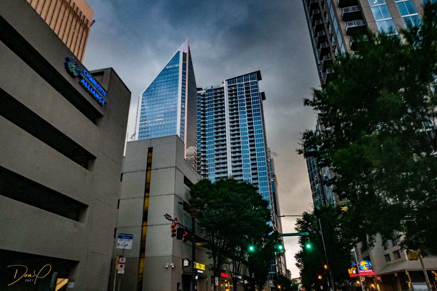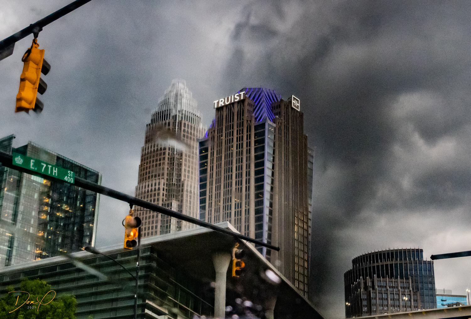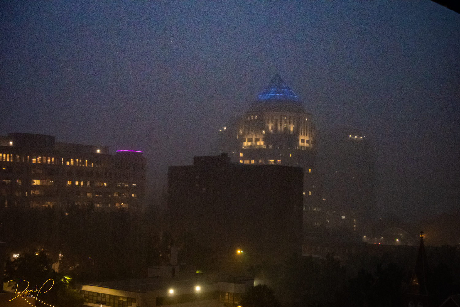 Then we drive around downtown in the last remaining minutes of daylight and get some photos of the downtown area as they are lighting up for the night and rain starts to set in. As the rain becomes torrential, we find a high rise parking garage that has emptied out and drive to the top and get photos in the rain from the top and from the last covered level looking out at the downtown buildings in the rain. Eerily dark and deserted in the garage, the rainy city has a strange glow about it.
