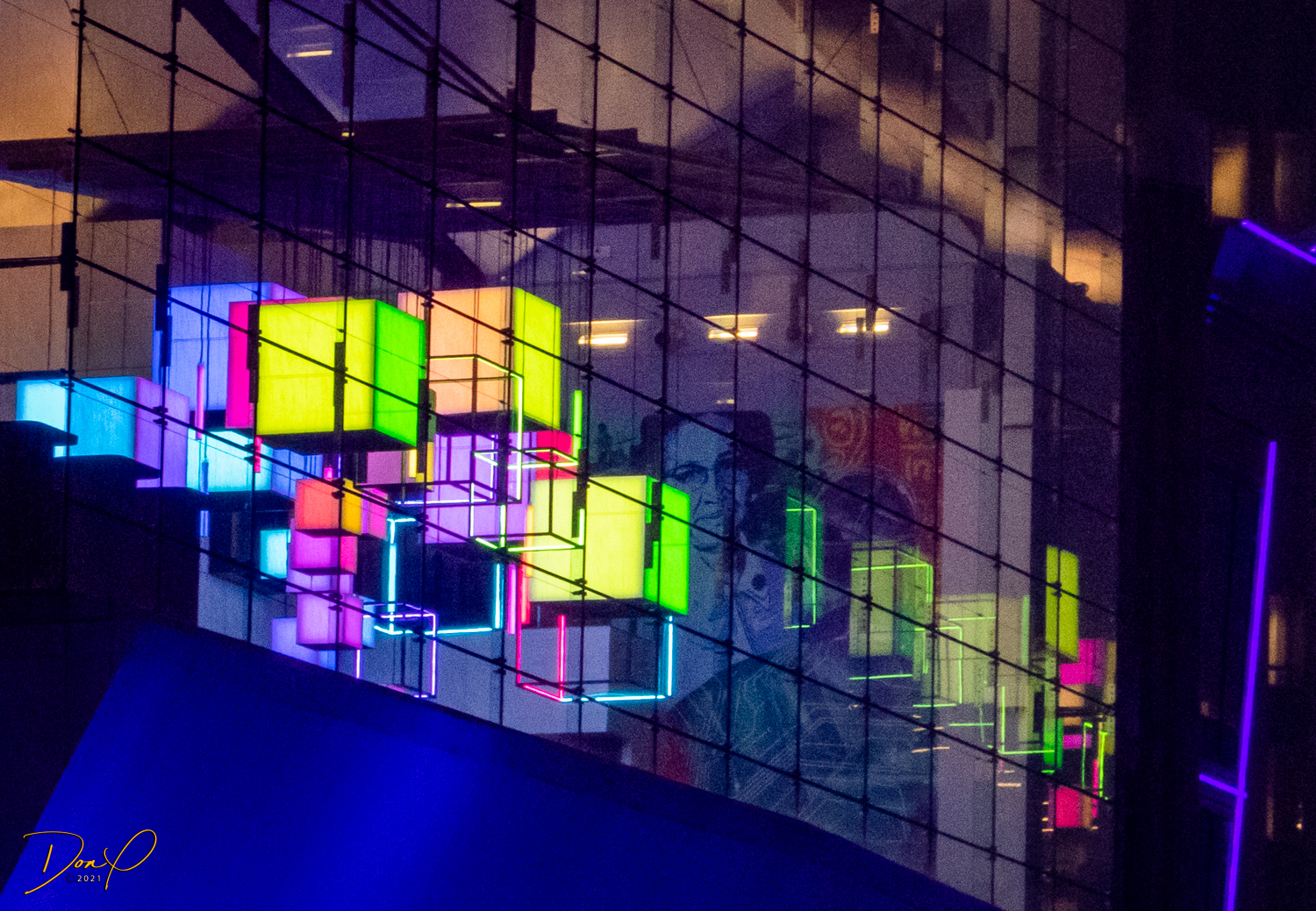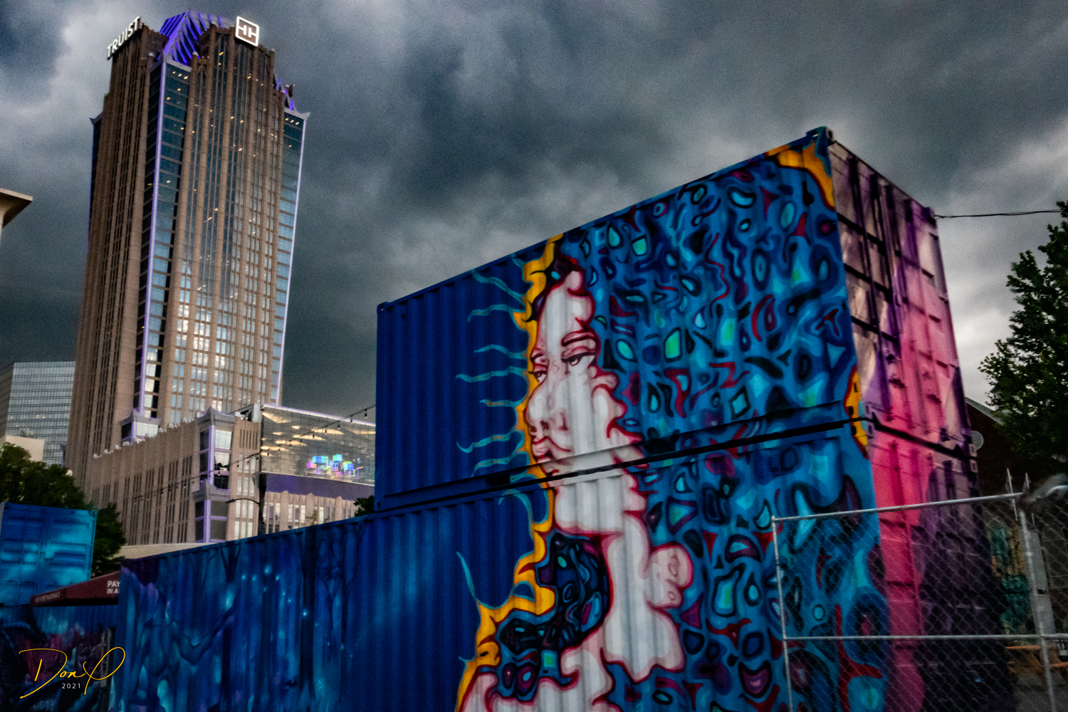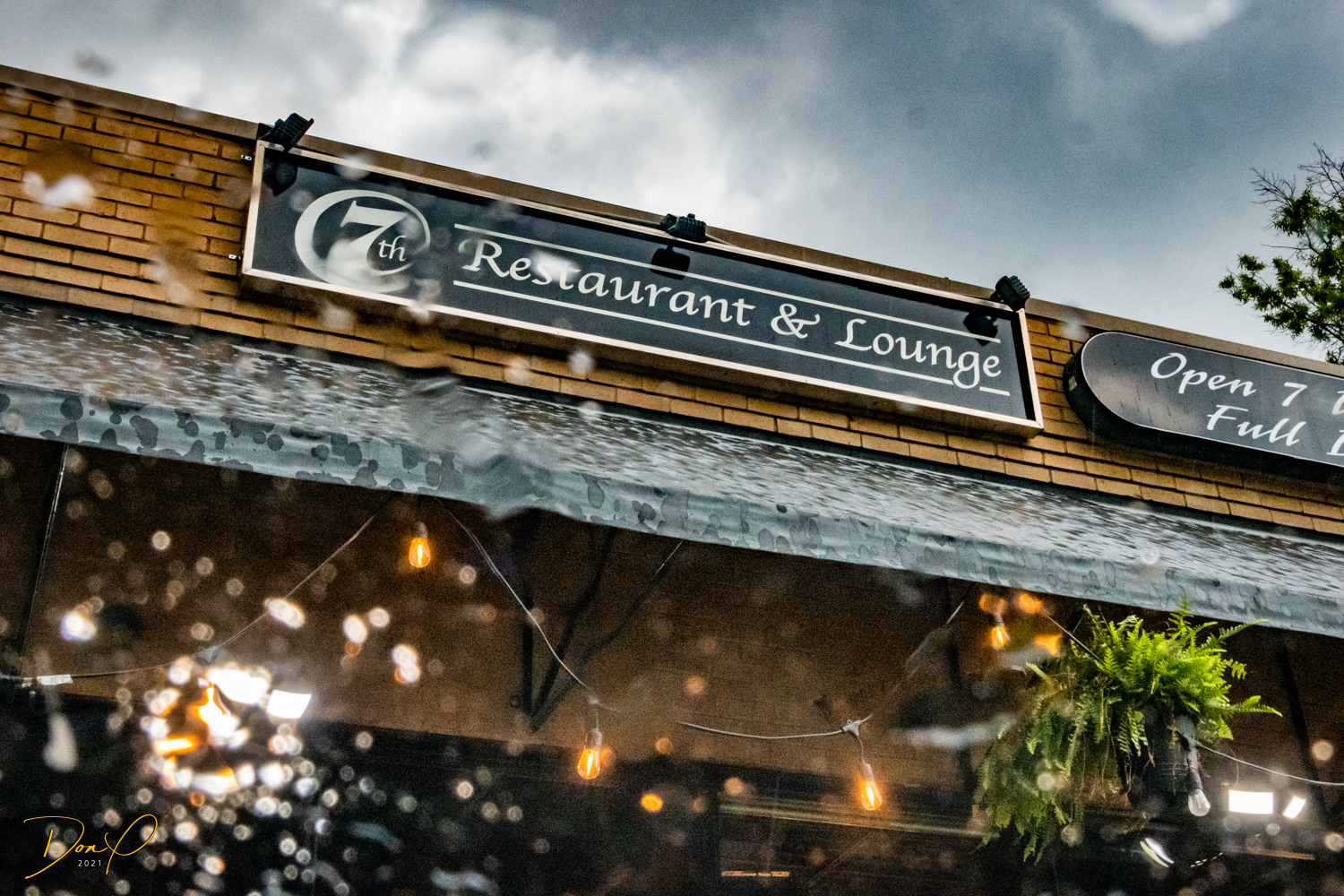 Then we drive around downtown in the last remaining minutes of daylight and get some photos of the downtown area as they are lighting up for the night and rain starts to set in. As the rain becomes torrential, we find a high rise parking garage that has emptied out and drive to the top and get photos in the rain from the top and from the last covered level looking out at the downtown buildings in the rain. Eerily dark and deserted in the garage, the rainy city has a strange glow about it.