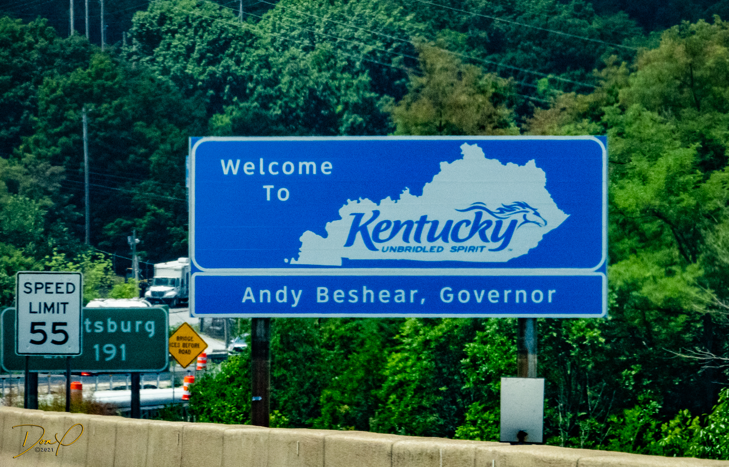 We soon amass as many photos as we can and step back out into the sunshine and find our car and drive off in search of new places to see. Deciding to move on, we head towards Kentucky and set our Navigators for Lexington. In about an hour we come across the sign that announces “Welcome to Kentucky”. It catches us by surprise and we want to take photos of it. So we double back and drive by it again. This time I manage to get a photo of it but Elee misses it. So we double back again. Why? You ask, is this photo so important to Elee’s camera? Well, the simple answer is that this completes Elee’s quest to visit all 50 States. So the double back is that important. And the third time is the charm, this time Elee gets the photo and all is well!