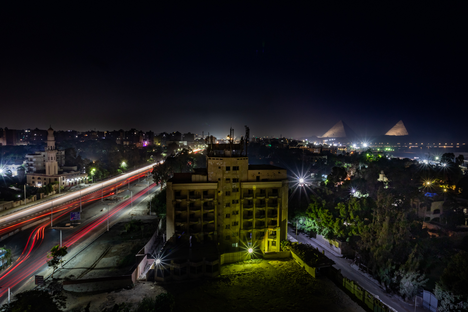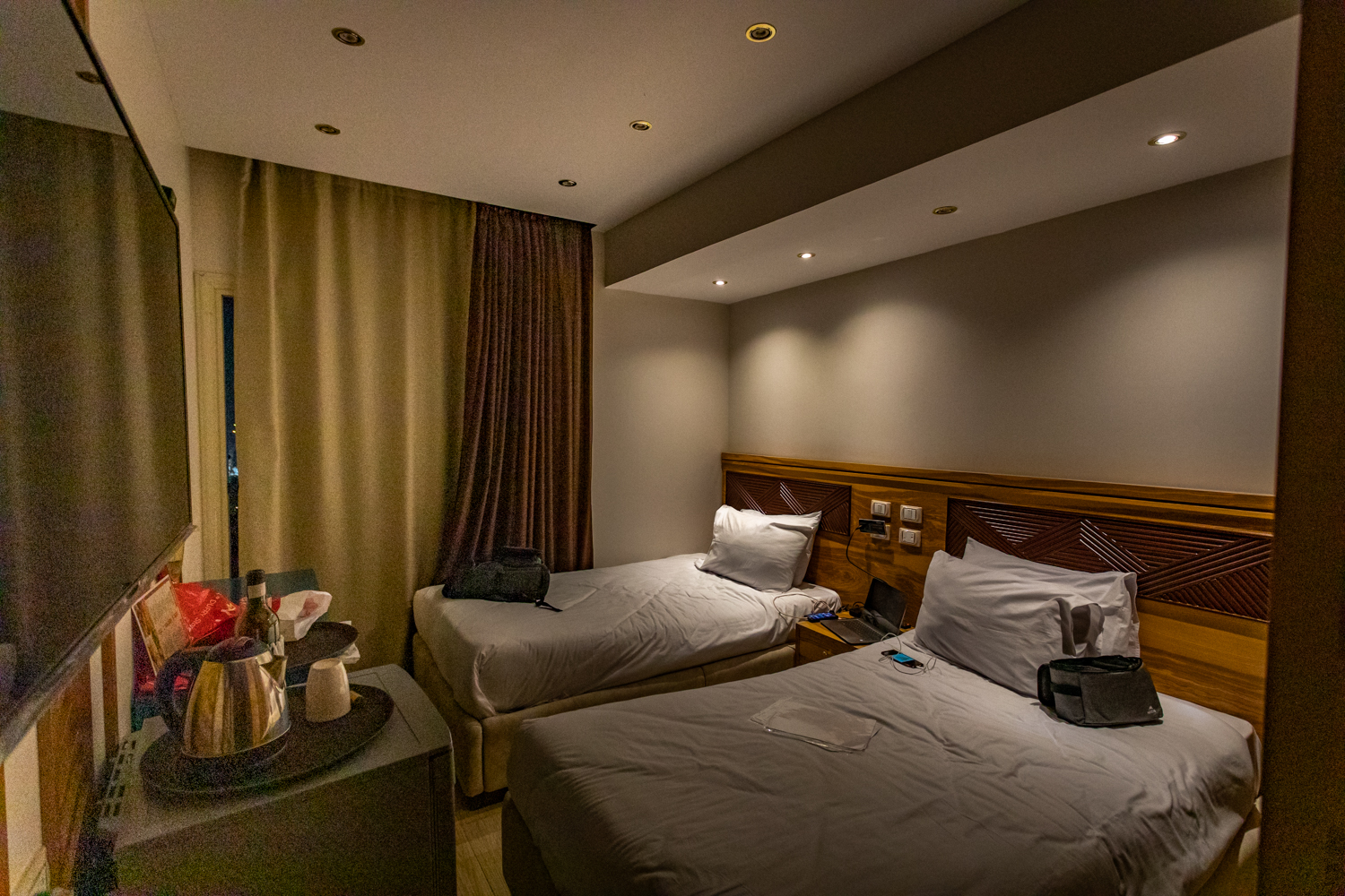 But we eventually get to our hotel, accessing it in a run down alley, similar to our description of our Havana BnB. There is an elevator that takes us up to the 10th Floor and the Maitre De accompanies us. Then we walk up stairs to the 11th Floor and into our room. It is clean yet tiny, but as the promised description had, the view is spectacular overlooking the Pyramids!