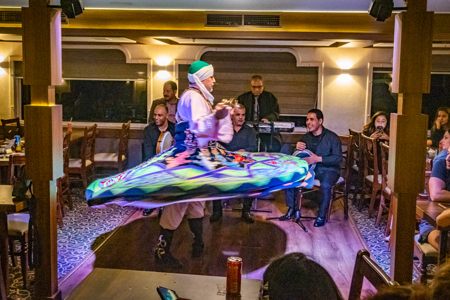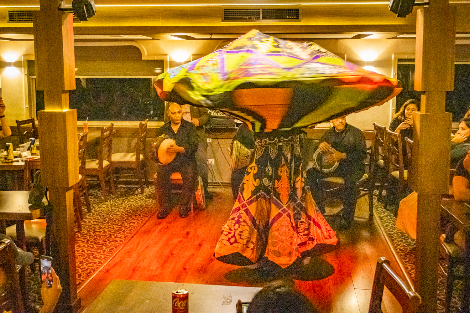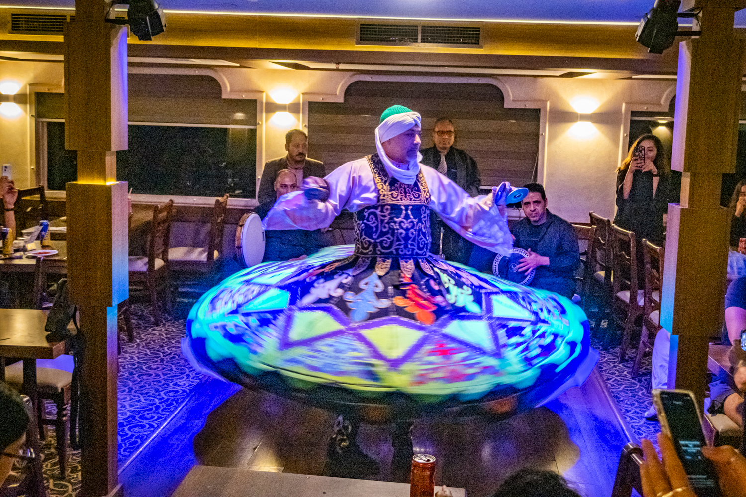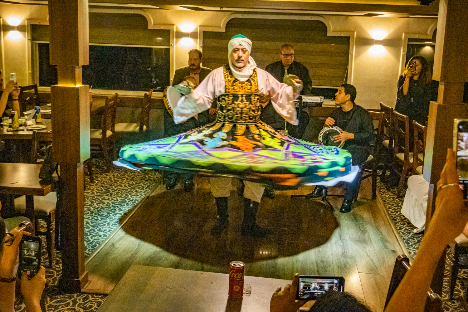 Back to the hotel for a 6 PM Tour Briefing, we then board a bus that takes us to a Dinner Cruise on the Nile and includes live Egyptian drummers, a Belly Dancer and even a Whirling Dervish! We chat amicably with fellow Tour Mates and thouroghly enjoy the shows!