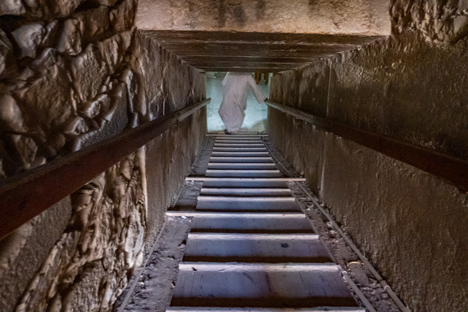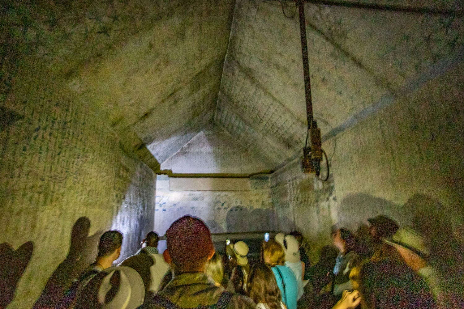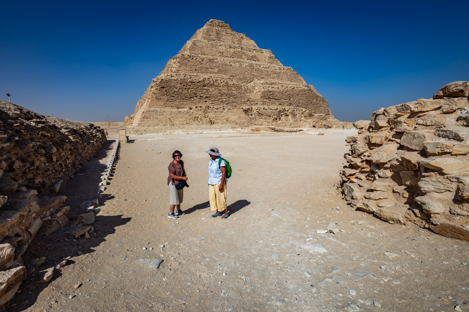 Then we board our Tour Bus promptly at 7:15 AM and set off is search of Pyramids. Our Guide, “Mo”, tells us we will head south for a half hour to the Saqqara Pyramid first in Cairo as we will be able to go inside without paying a fee and it will be a very interesting experience. So we arrive at Saqqara and we all have to get off the bus and walk through a security x-ray before reboarding the bus to drive up to the pyramid. There, Mo proceeds to give us a short history lesson on this pyramid and then we are ushered into a side entrance that is only one meter wide and one meter high. We have to crouch low and walk in for about 50-75 yards. When the room opens up, several people can actually stand up and the walls are totally covered in hieroglyphics that are spectacular.