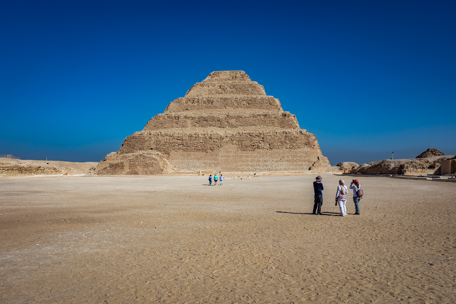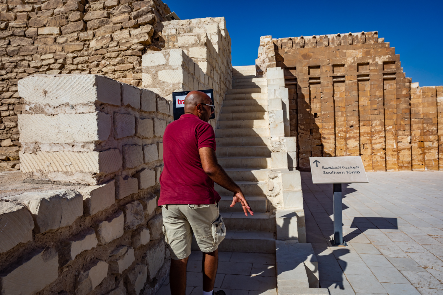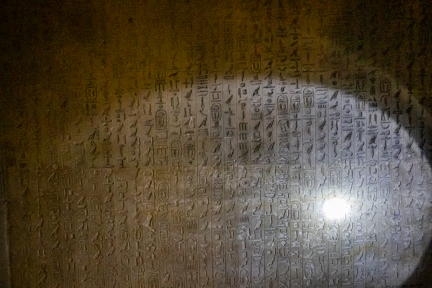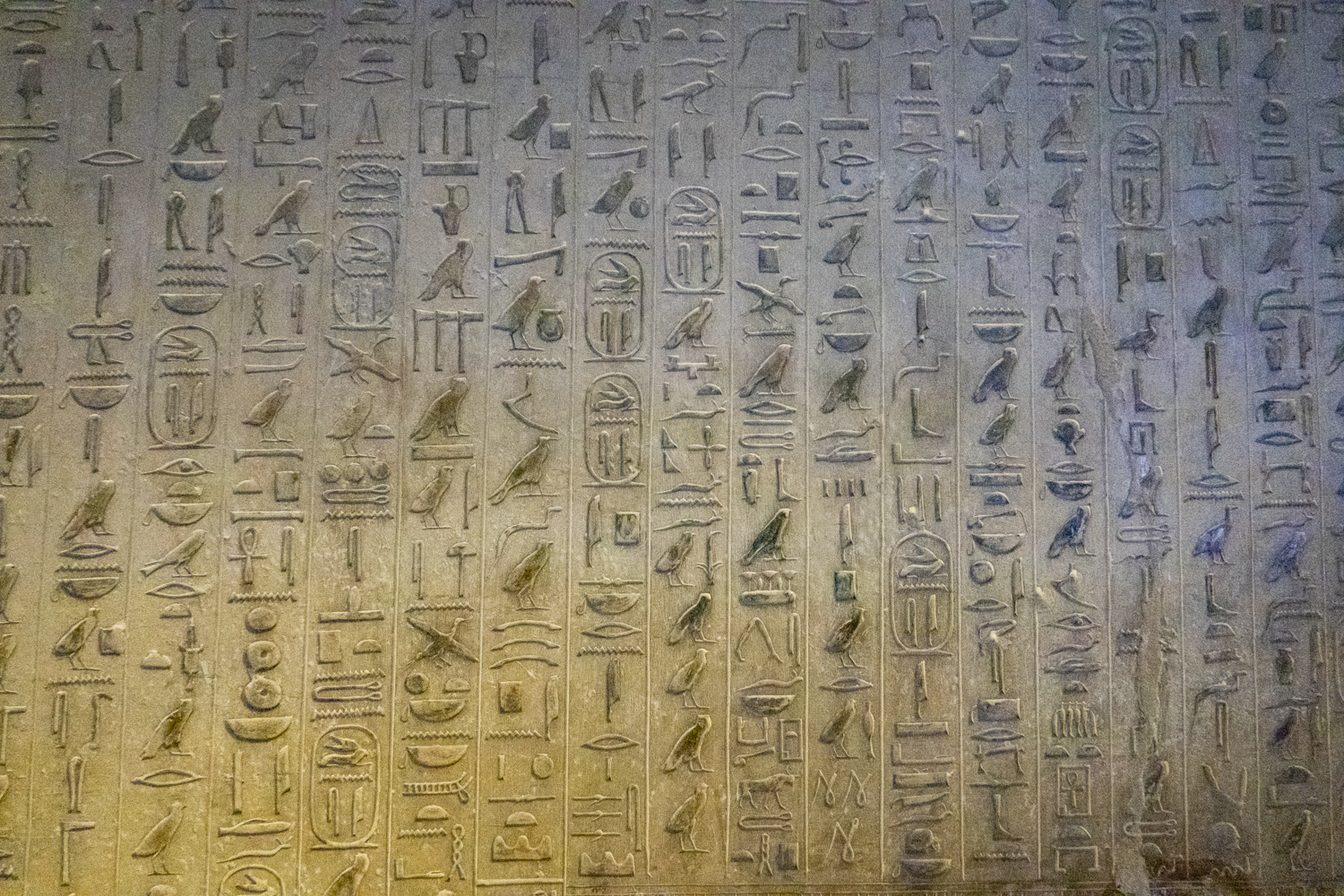 Then we board our Tour Bus promptly at 7:15 AM and set off is search of Pyramids. Our Guide, “Mo”, tells us we will head south for a half hour to the Saqqara Pyramid first in Cairo as we will be able to go inside without paying a fee and it will be a very interesting experience. So we arrive at Saqqara and we all have to get off the bus and walk through a security x-ray before reboarding the bus to drive up to the pyramid. There, Mo proceeds to give us a short history lesson on this pyramid and then we are ushered into a side entrance that is only one meter wide and one meter high. We have to crouch low and walk in for about 50-75 yards. When the room opens up, several people can actually stand up and the walls are totally covered in hieroglyphics that are spectacular.