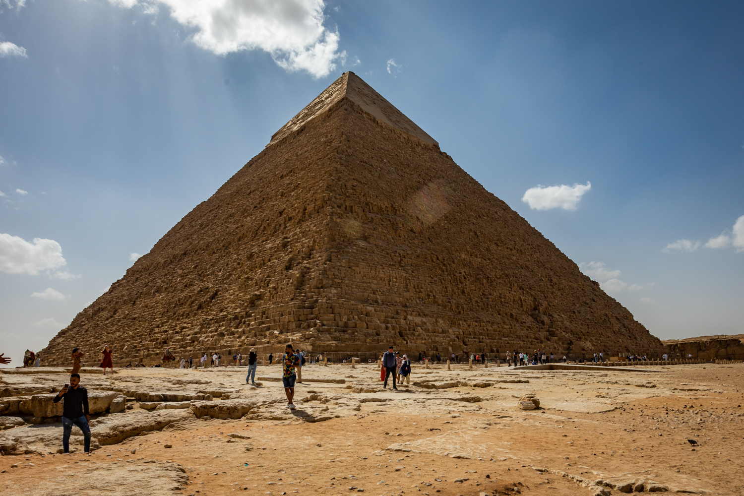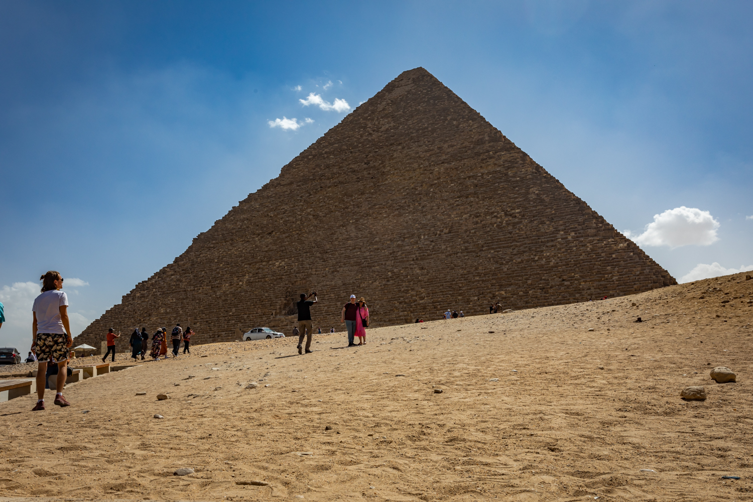 We walk around the Great Pyramid, which much to our dismay cannot be walked completely around due to ongoing excavation sites. So we get halfway around and have to walk back to see the other side where its sister pyramid stands, the one that still has part of a limestone cap on it that most of you recall when you see photos of the pyramids! Elee even manages to ‘touch’ the top of the Great Pyramid!
