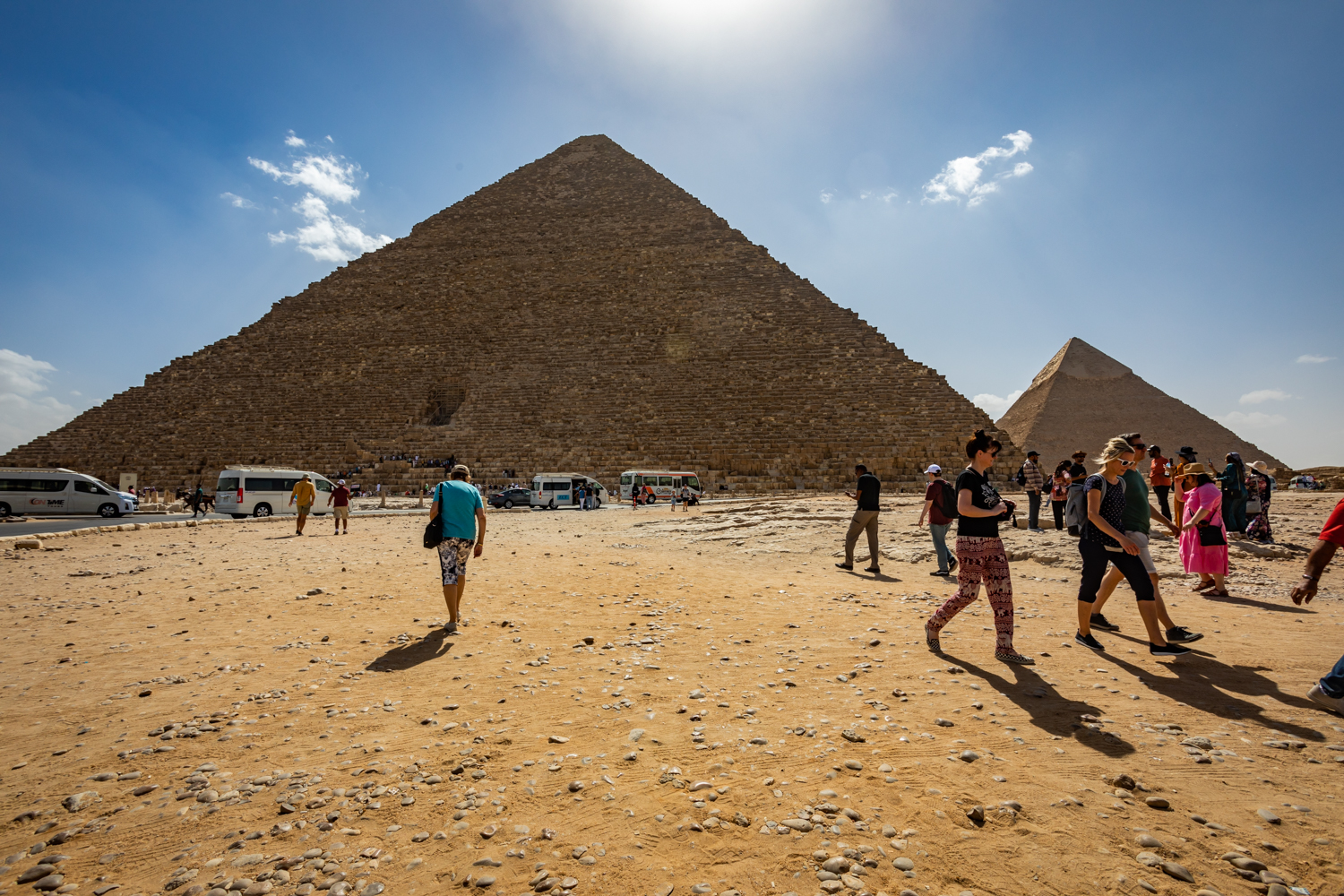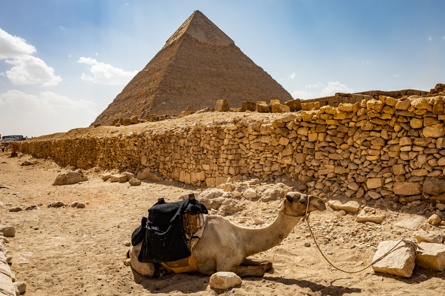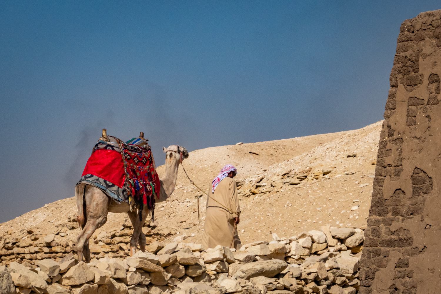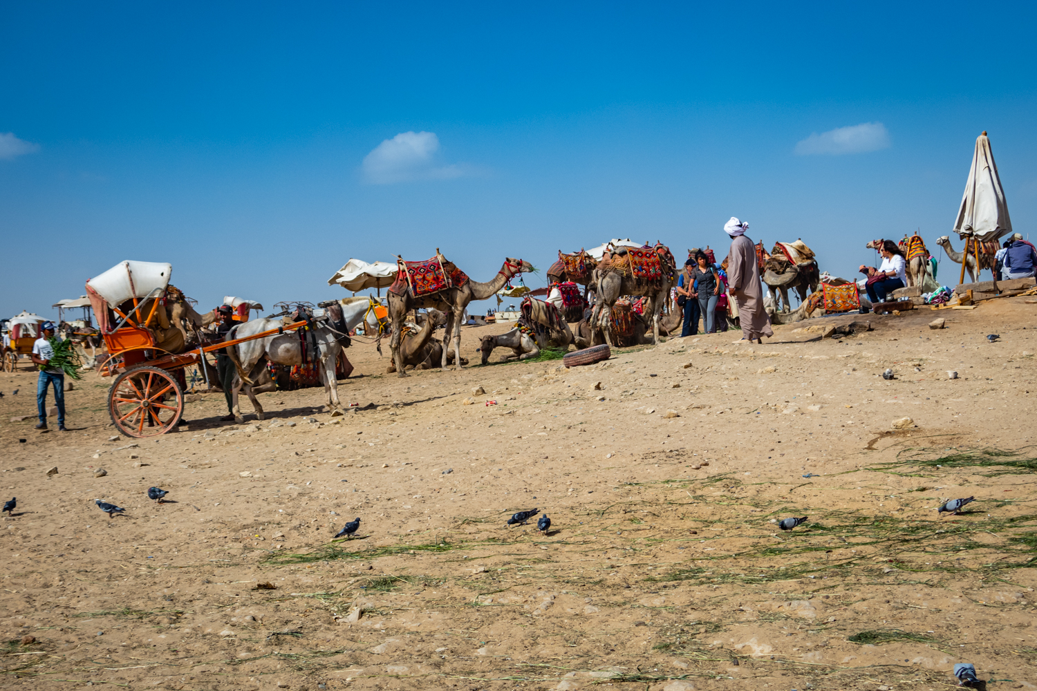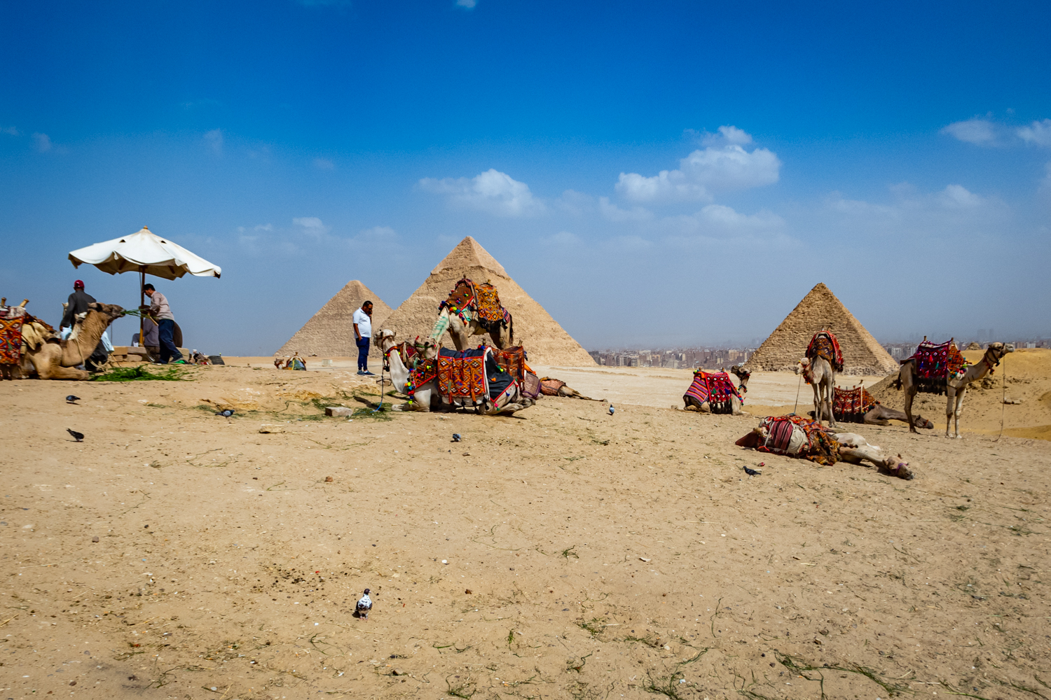 We now move on along to an optional Tour Point where there are fantastic views of all 3 pyramids at the same time. Then Mo takes the more adventurous of our lot for a short hike around a pile of rocks to find literally dozens of camels are resting all decked out with saddles ready to ride!