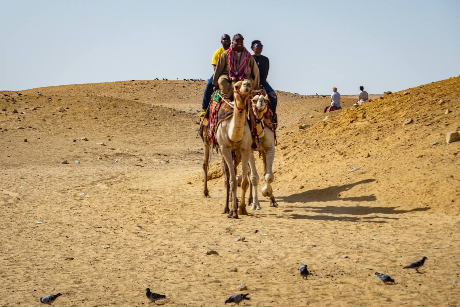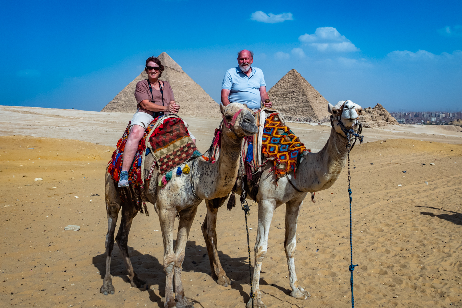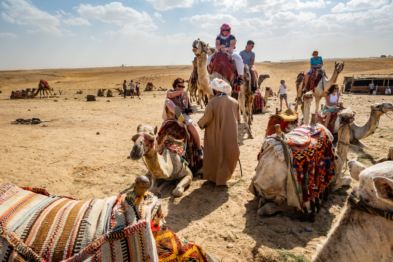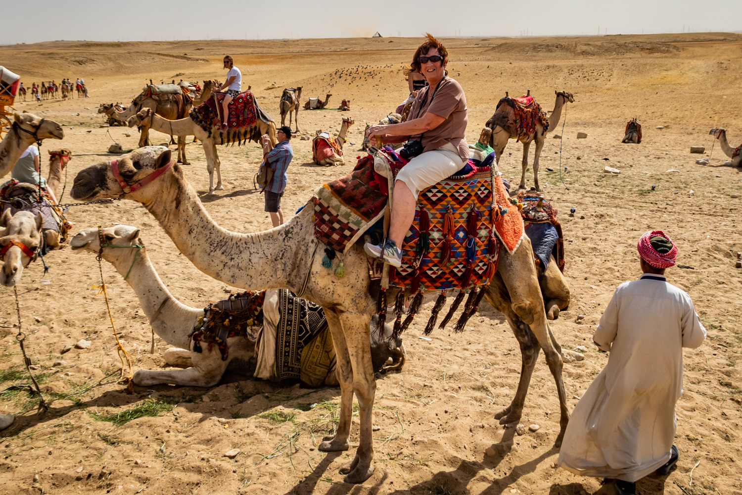 Yes, you guessed it, we are about to embark onto the backs of camels for a ride in the desert next to the pyramids! Now for those of you who have never ridden a camel, the trickiest part is hanging on while the camel stands up! We will find out later that staying on while the camel sits at the end of the ride is just as challenging! Lean back Don! Lean back!