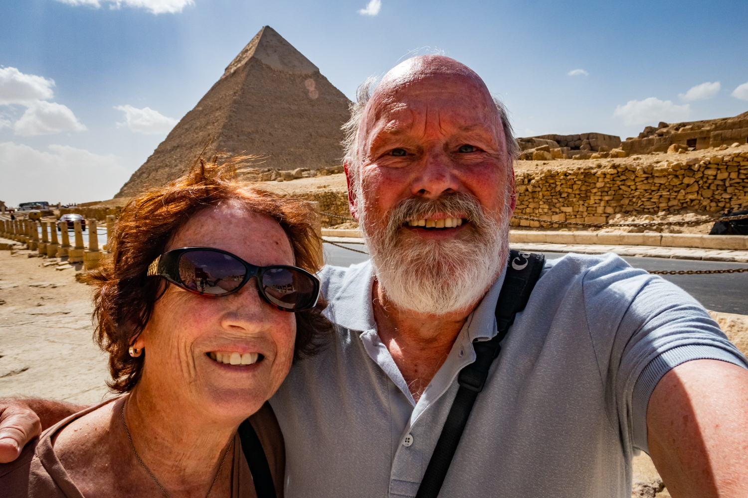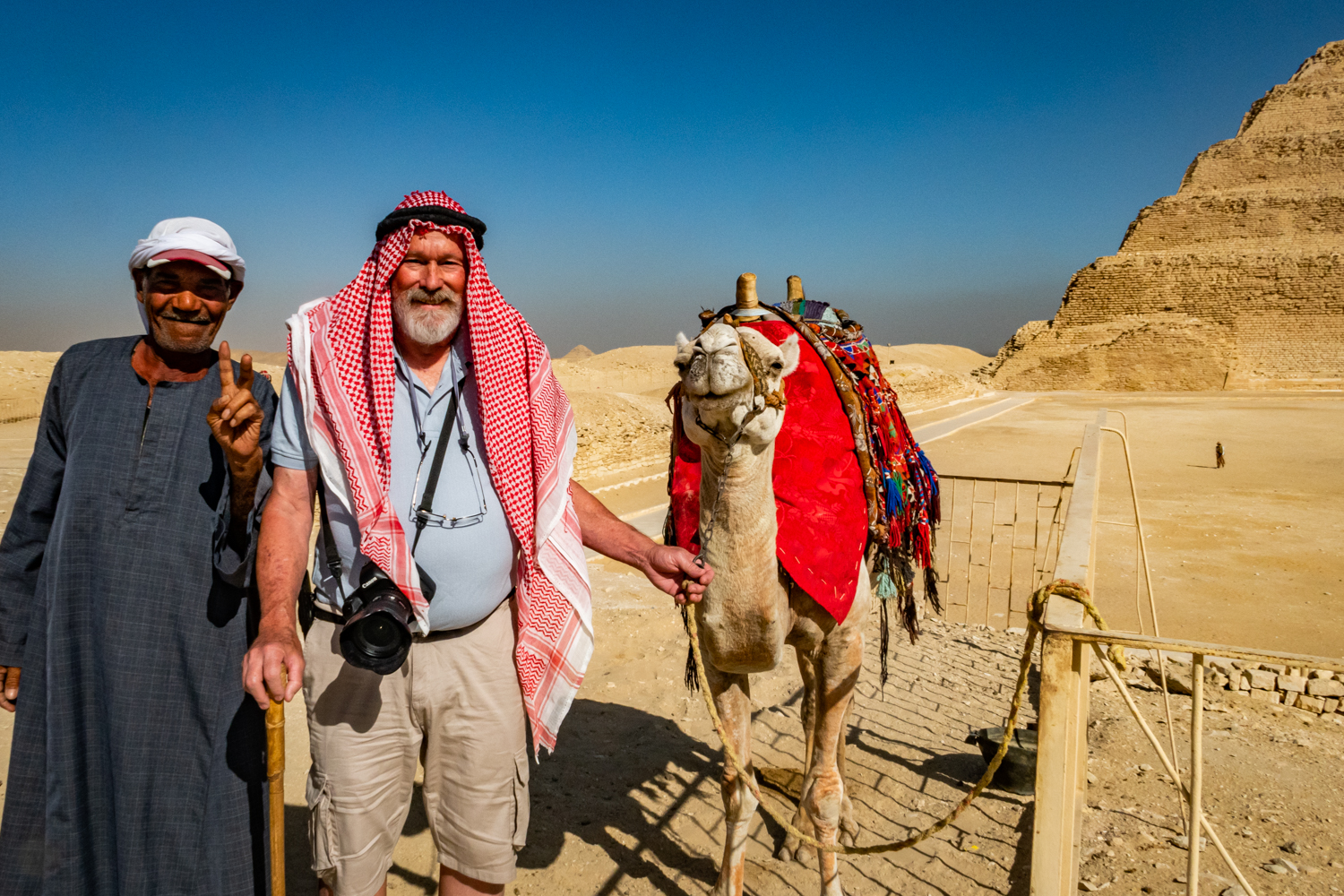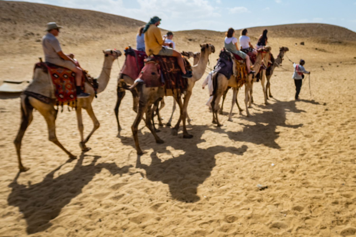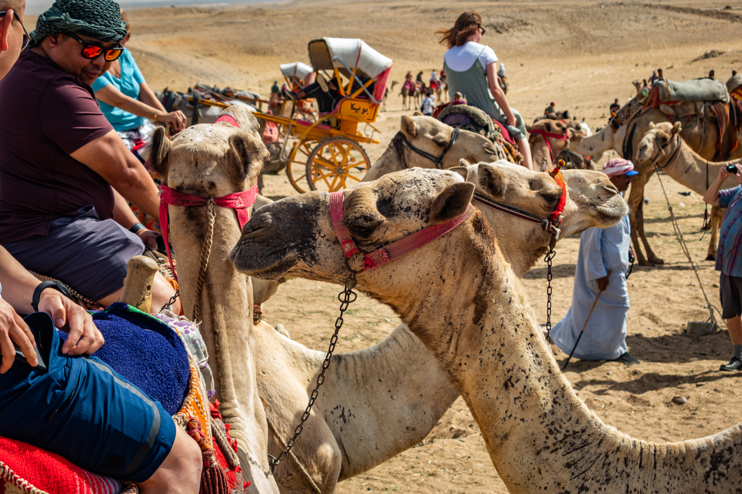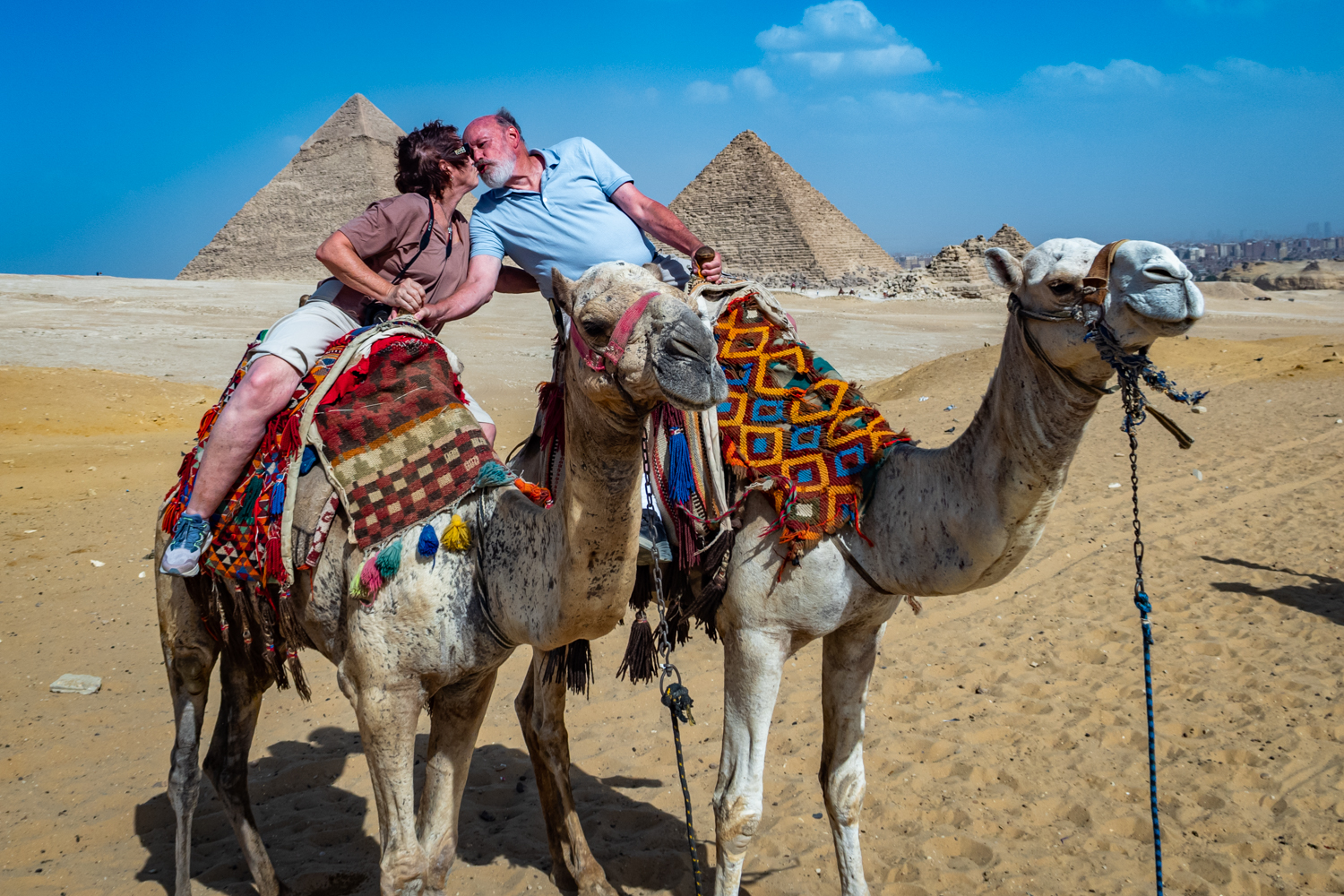 Yes, you guessed it, we are about to embark onto the backs of camels for a ride in the desert next to the pyramids! Now for those of you who have never ridden a camel, the trickiest part is hanging on while the camel stands up! We will find out later that staying on while the camel sits at the end of the ride is just as challenging! Lean back Don! Lean back!