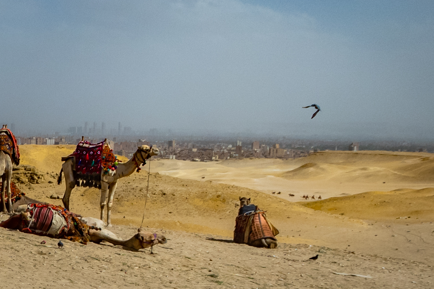 Our legs are complaining at all the hiking on uneven rock surfaces and Elee goes back to the bus. My camera snarls at me and indicates there is much more work to be done here! So I plod along finding more gems to keep the lenses happy. Finally satiated for at least a little while, I trek back to the bus in plenty of time but not before making sure my camera has a taste of camels in the foreground of the pyramids.
