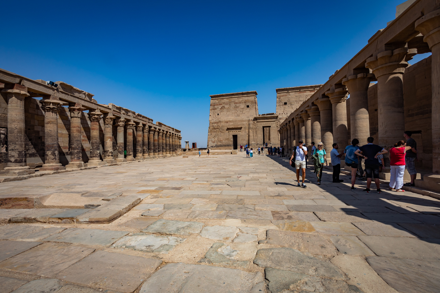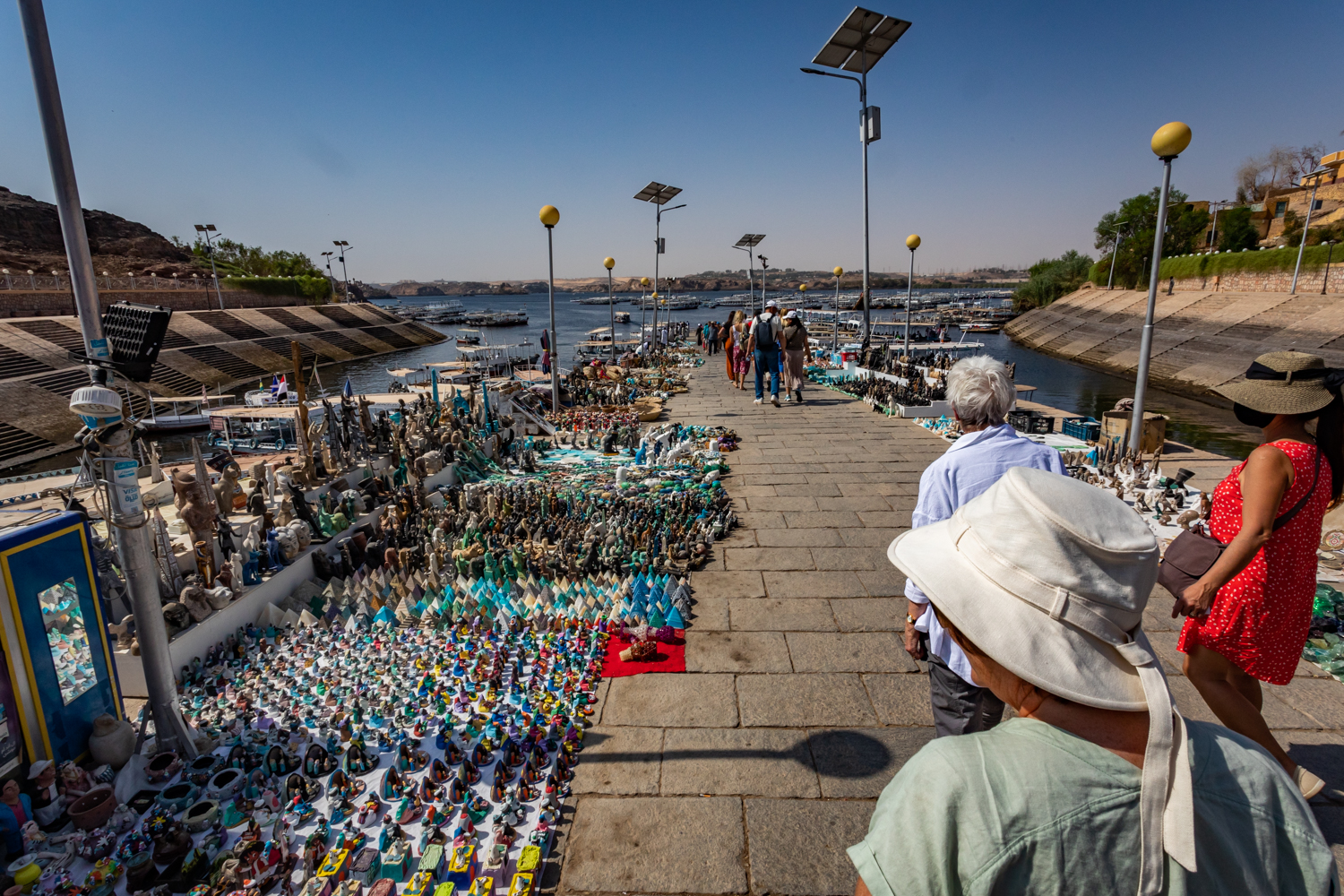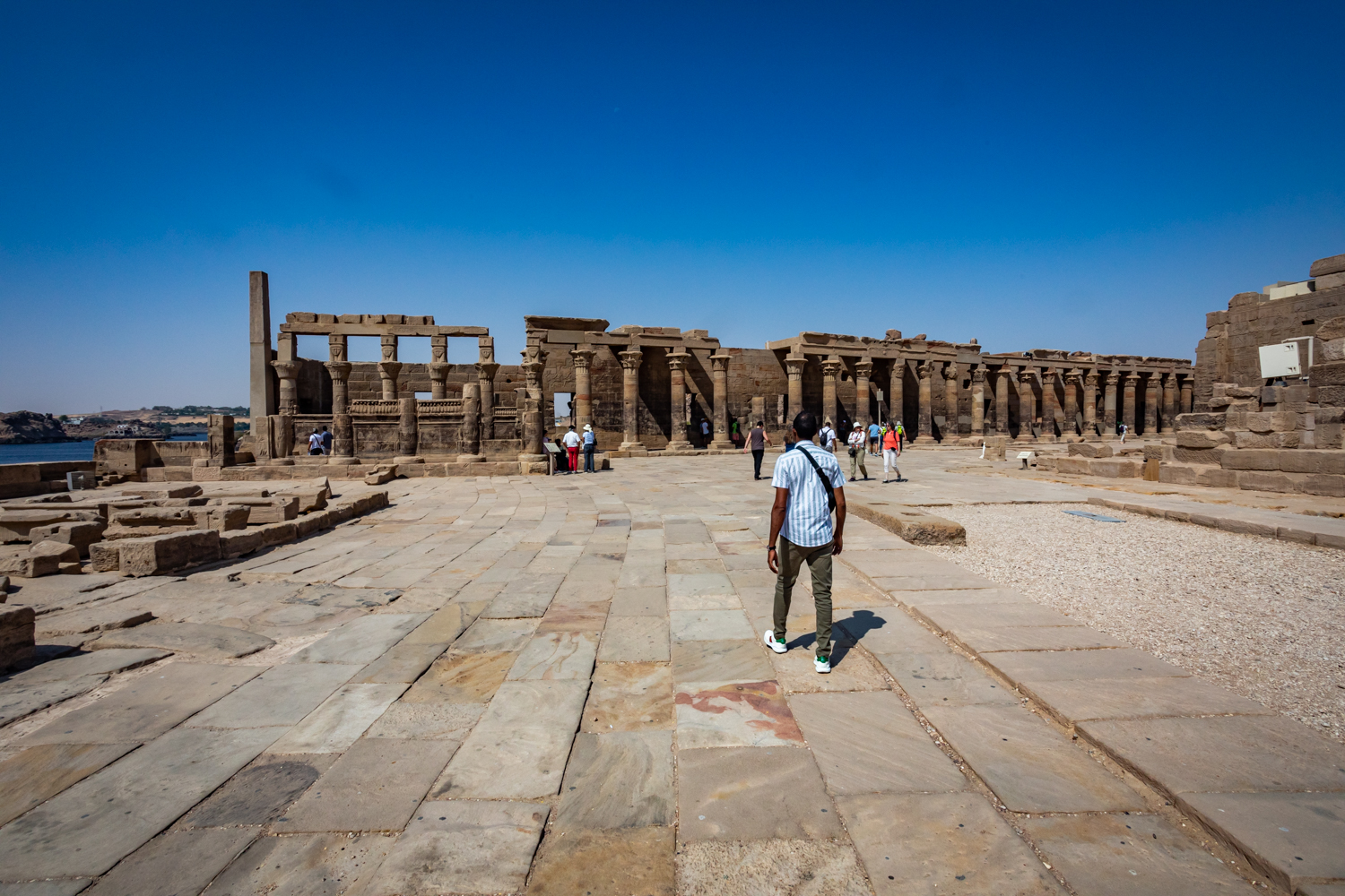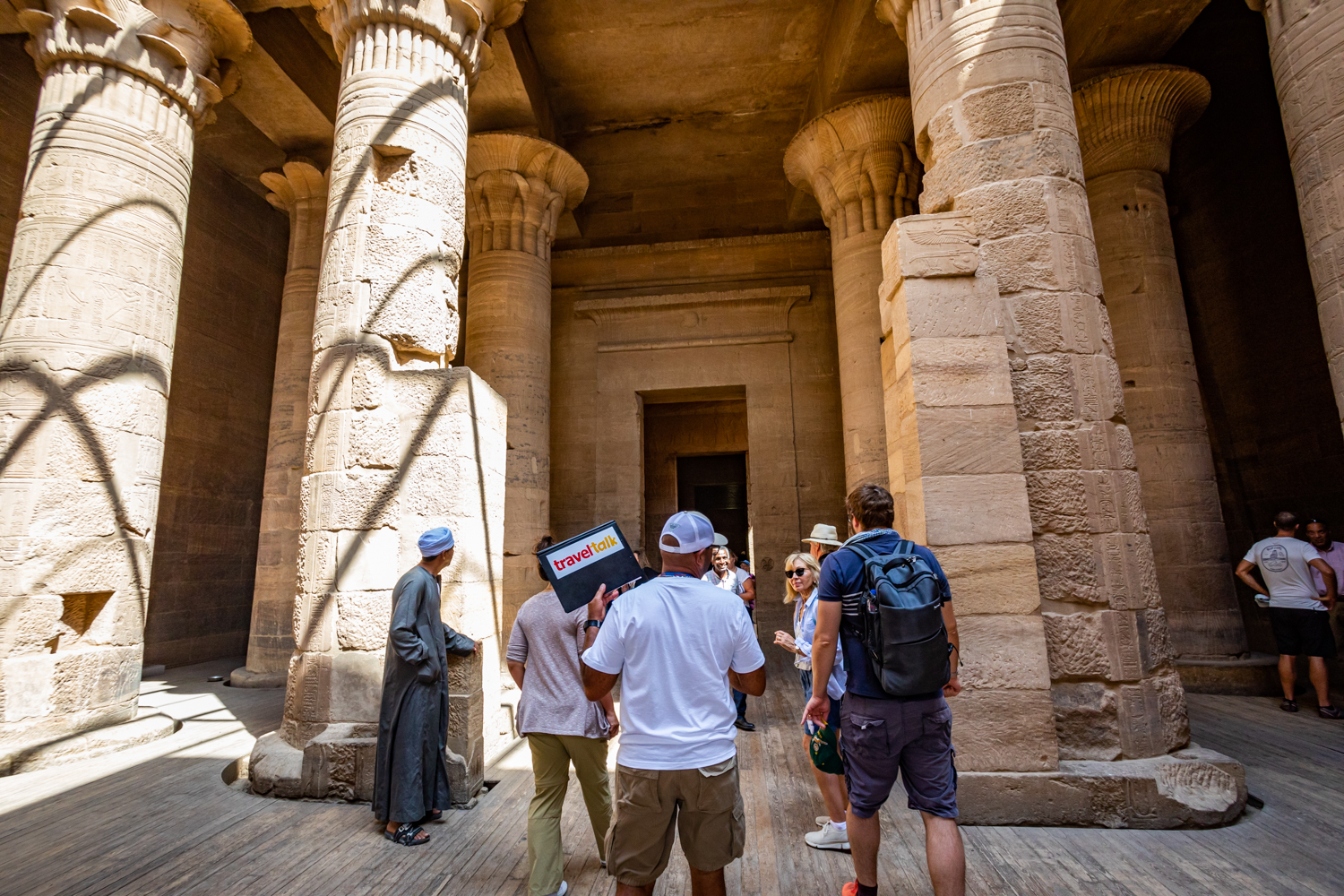 We arrive in Aswan Station around 8 AM and we disembark to a Tour Bus that takes us to a river taxi and we arrive at Philae Temple around 10:30. Mo gives us the history of the Temple and turns us loose for a half hour. Our cameras are once again happy and we photograph the Temple and its Hieroglyphics. At one point it is sad to see that somewhere in history, some religious sects have desecrated some of the symbols as apparently offensive to them by scratching out the faces. This is not a unique thing to this temple but is prevalent in a lot of Egyptian ruins!