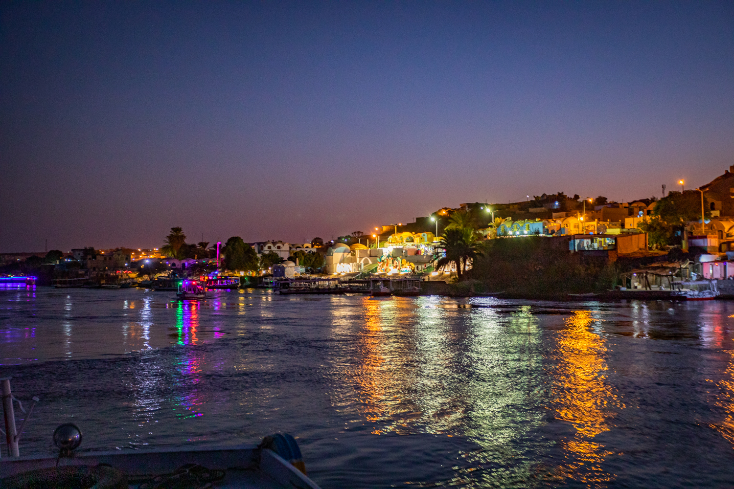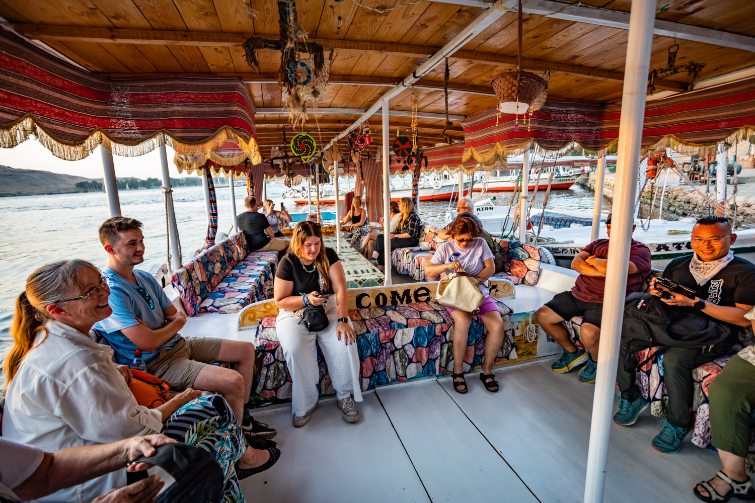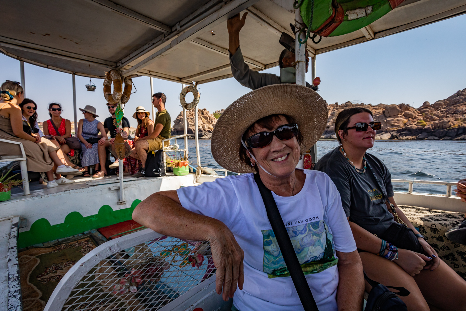We have a couple hours to rest before boarding another small boat (think African Queen) and head up the Nile for a stop at a Nubian Village for dinner where a family takes us in and cooks a tasty meal! On the way, we get to photograph Sunset on the Nile. Lots of Felucca Boats sail up and down the Nile and we are allowed and encouraged to sit on the roof of the boat!