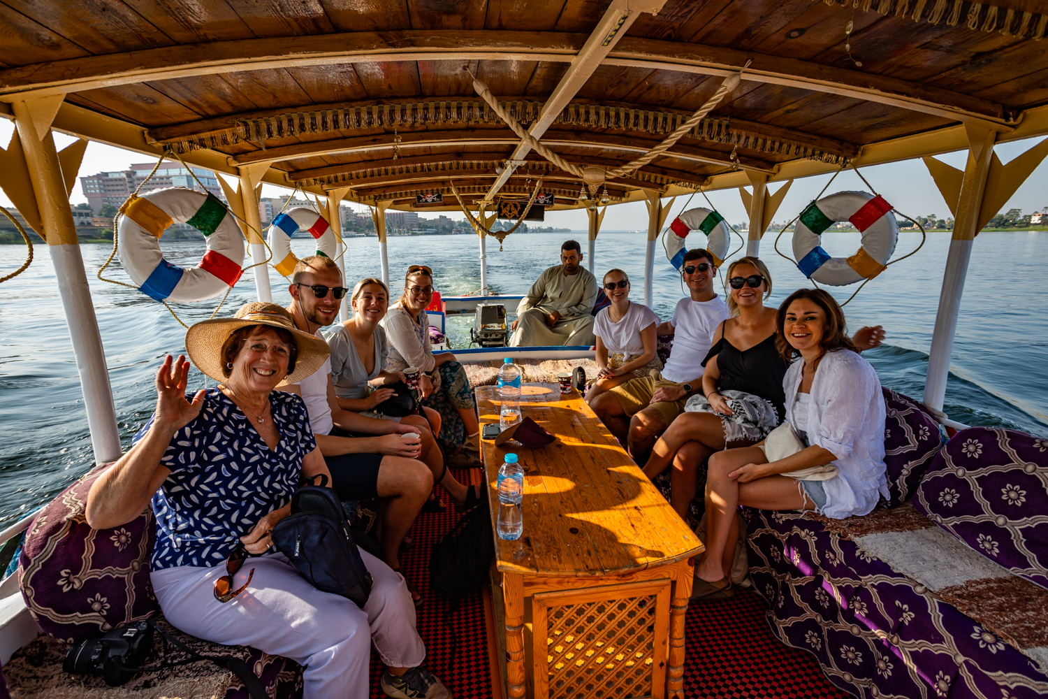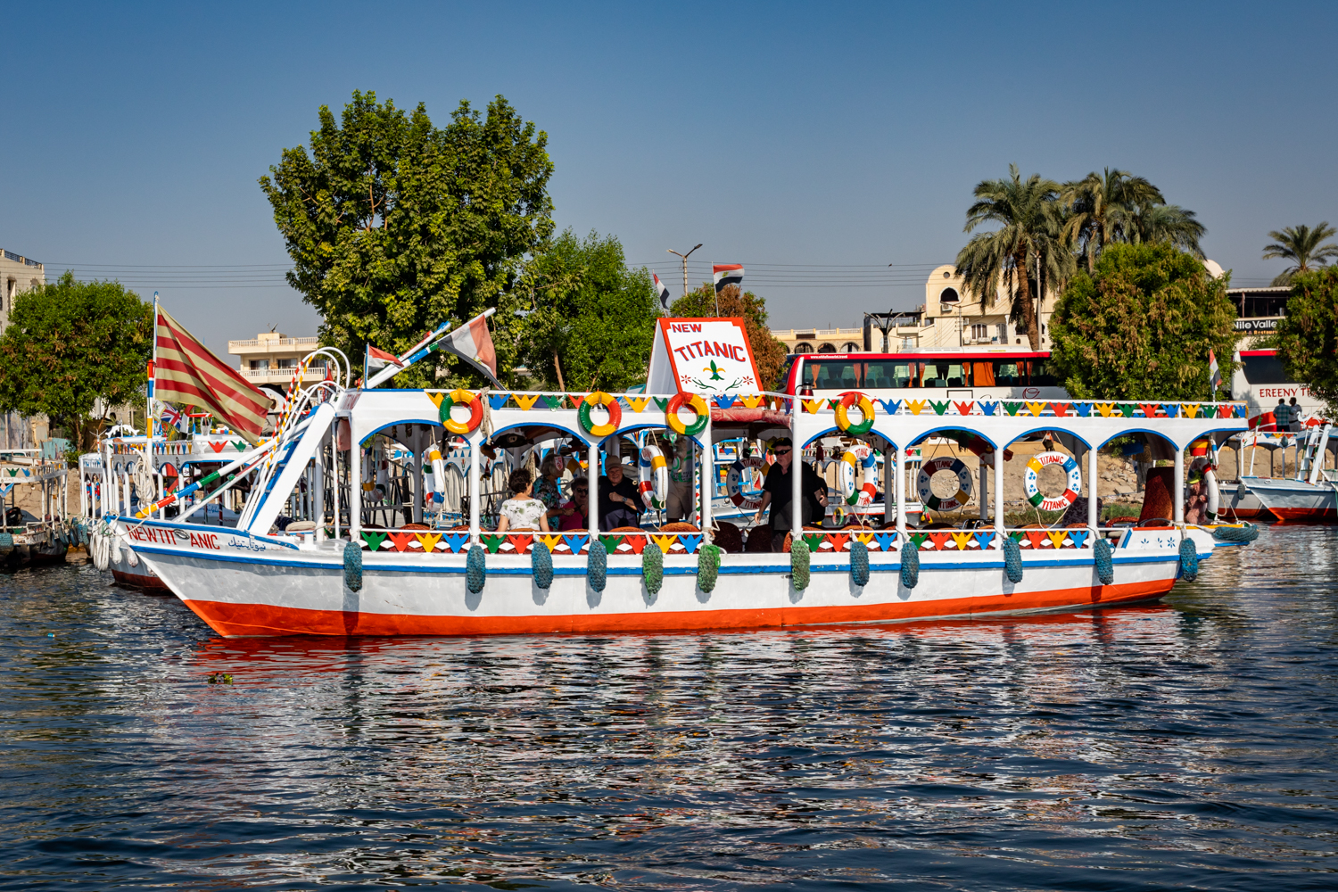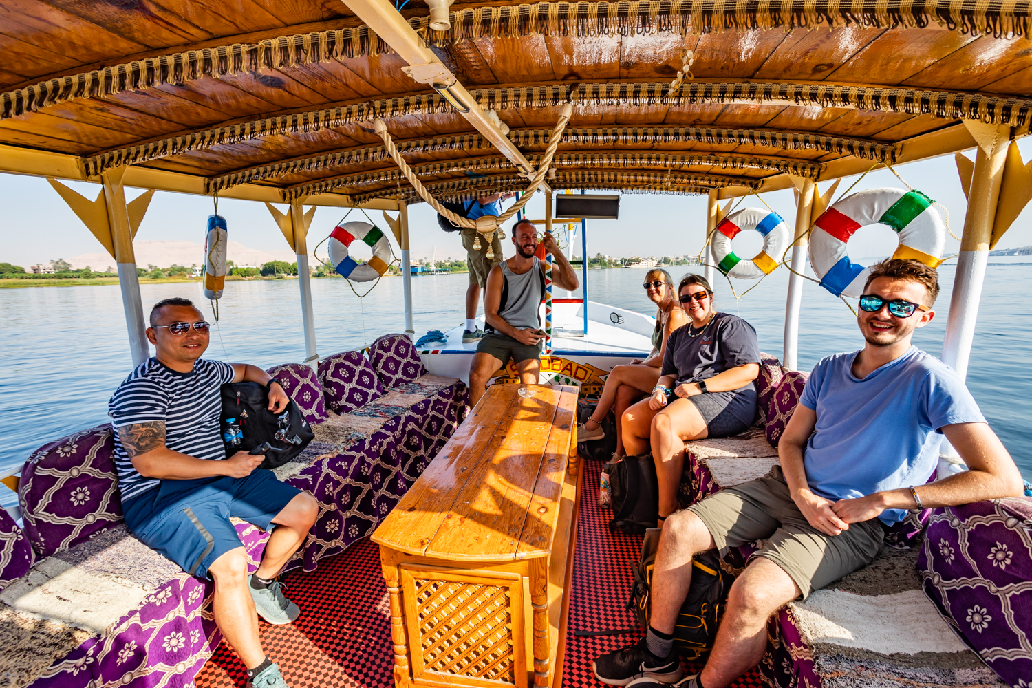 This morning we are up at 6AM to pack up and check out by 7. Next to grab some breakfast and await our guide who loads us into River Taxis and shuttles us across the river to a waiting bus that takes us to the Valley of the Kings, a place in Egypt where dozens of Kings and Pharaohs are enshrined in their tombs. A place we flew over in the balloons yesterday! I have to note that the River Taxis have names on them, some not necessarily what I would name a boat!