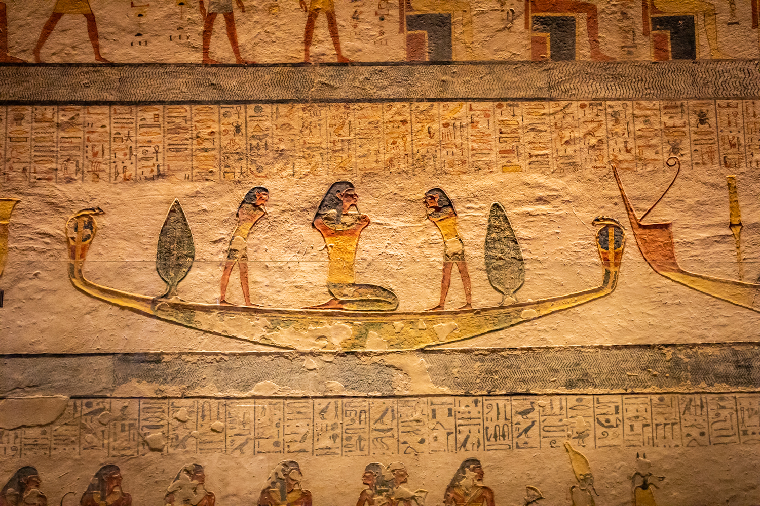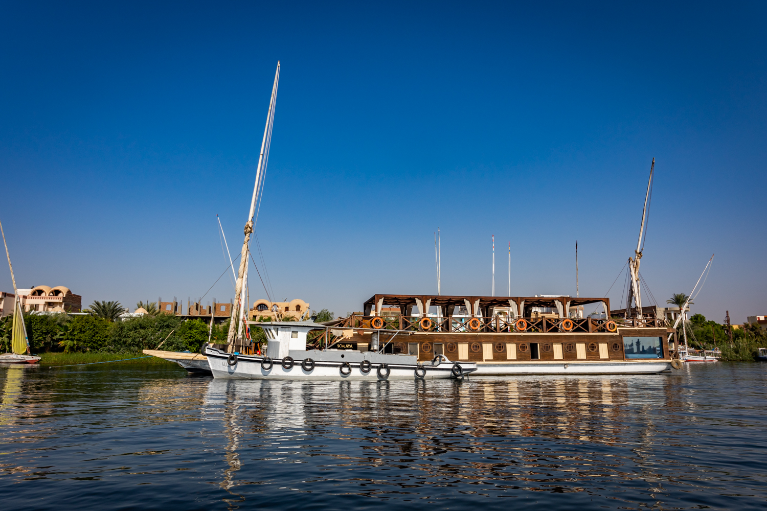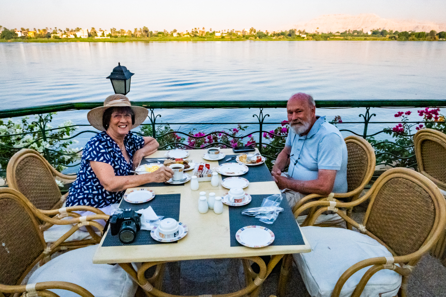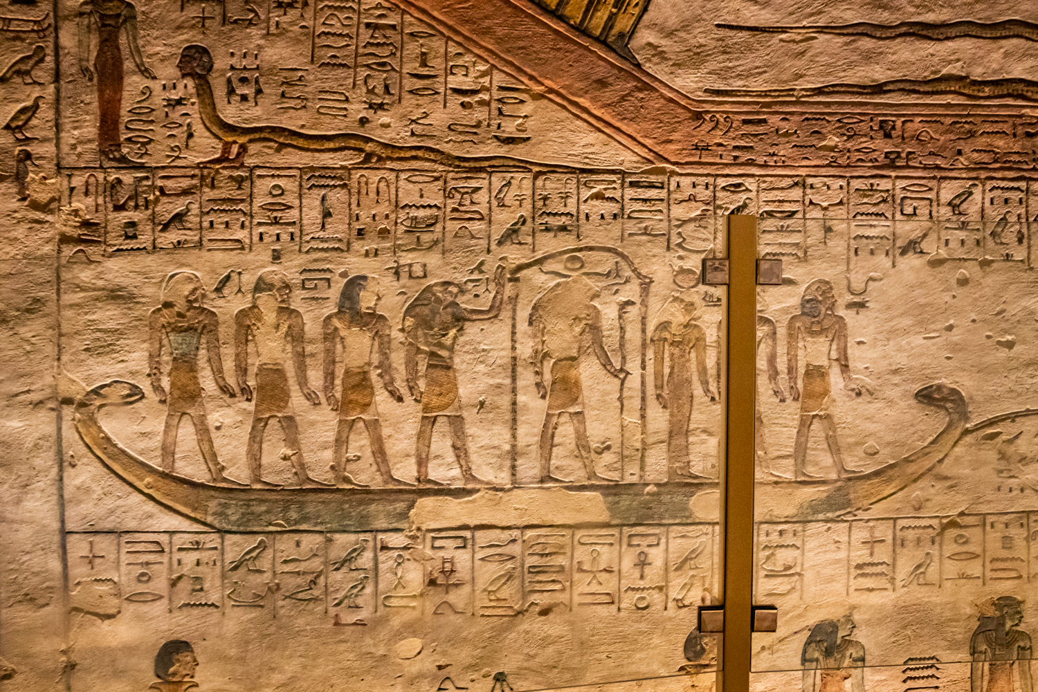 This morning we are up at 6AM to pack up and check out by 7. Next to grab some breakfast and await our guide who loads us into River Taxis and shuttles us across the river to a waiting bus that takes us to the Valley of the Kings, a place in Egypt where dozens of Kings and Pharaohs are enshrined in their tombs. A place we flew over in the balloons yesterday! I have to note that the River Taxis have names on them, some not necessarily what I would name a boat!